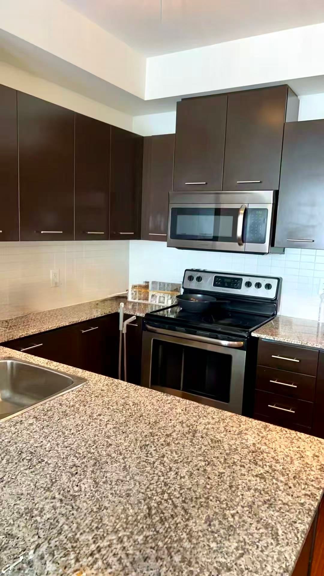• Modern kitchen featuring granite counters and ample cupboard space.