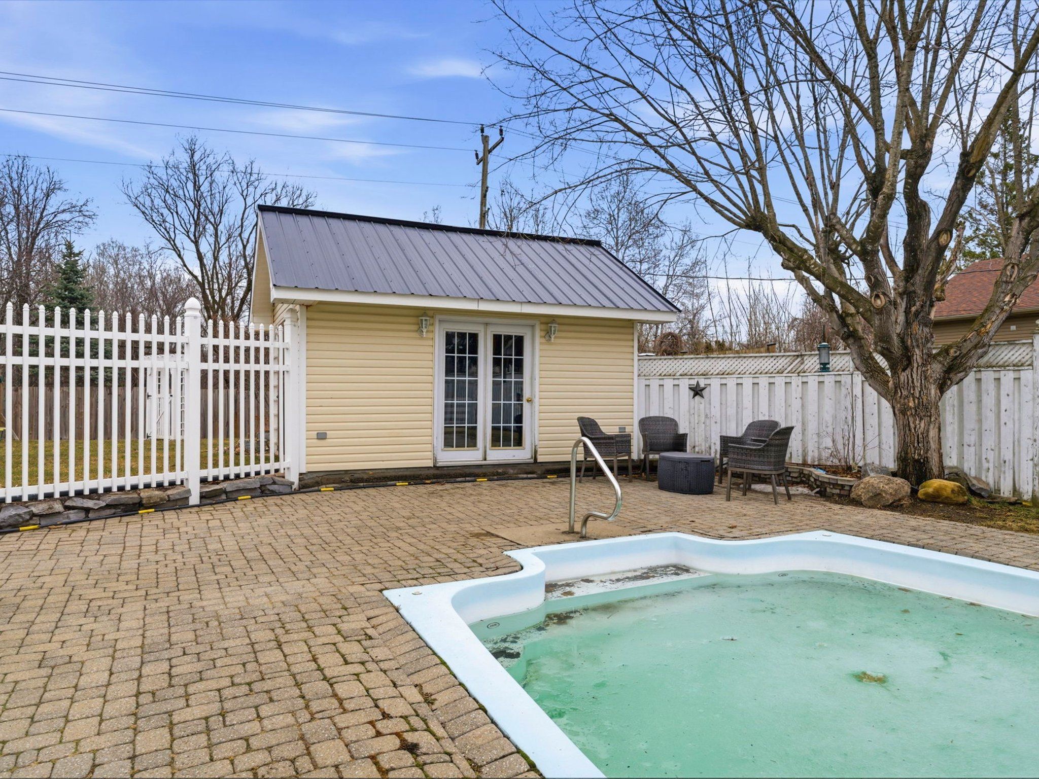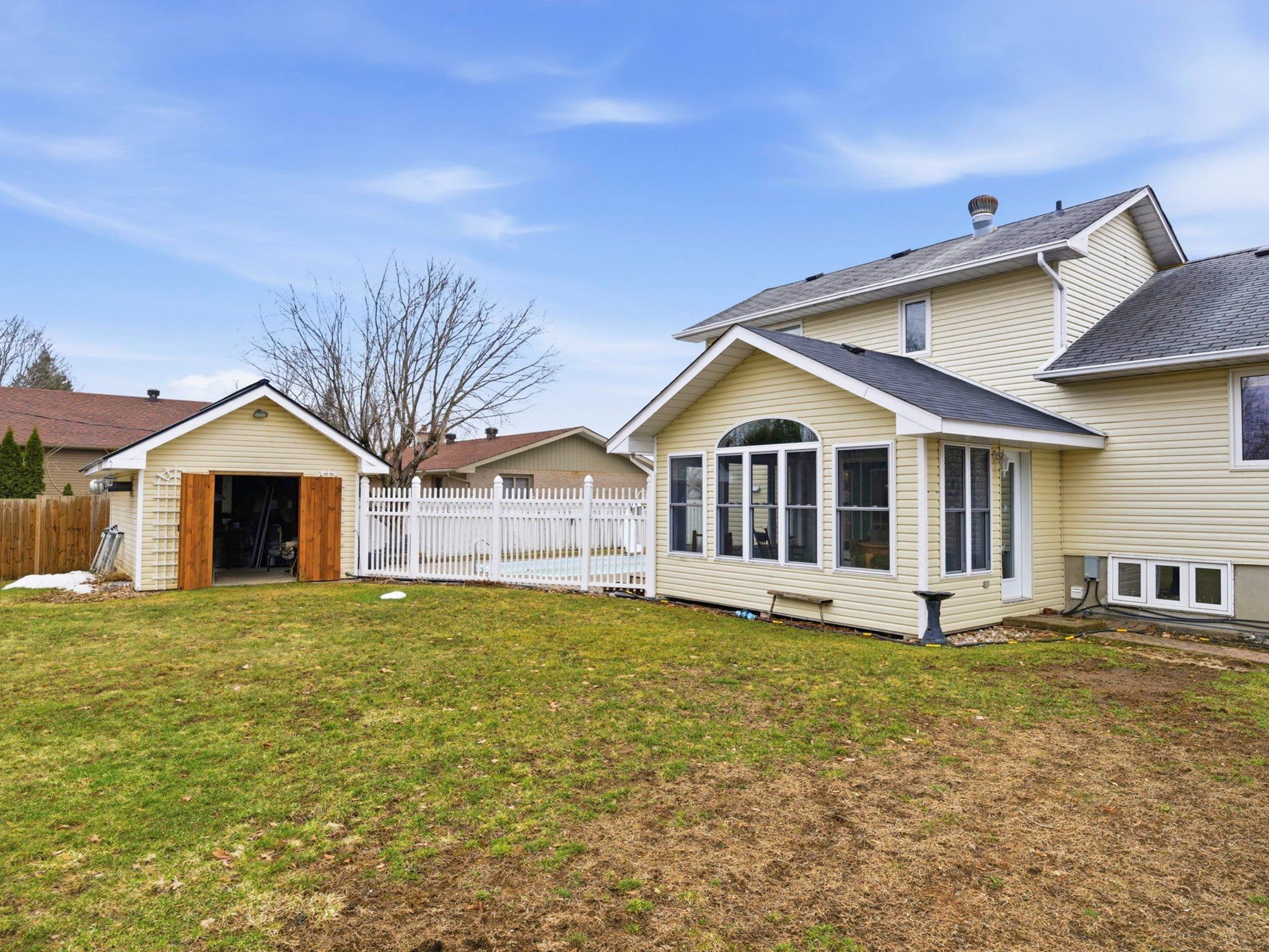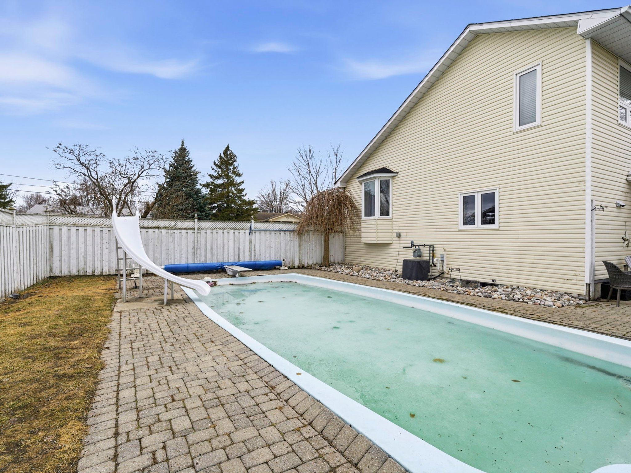 • Massive fenced backyard with a heated pool for summer fun.