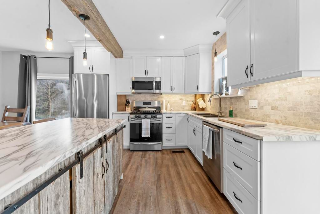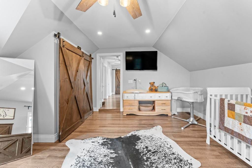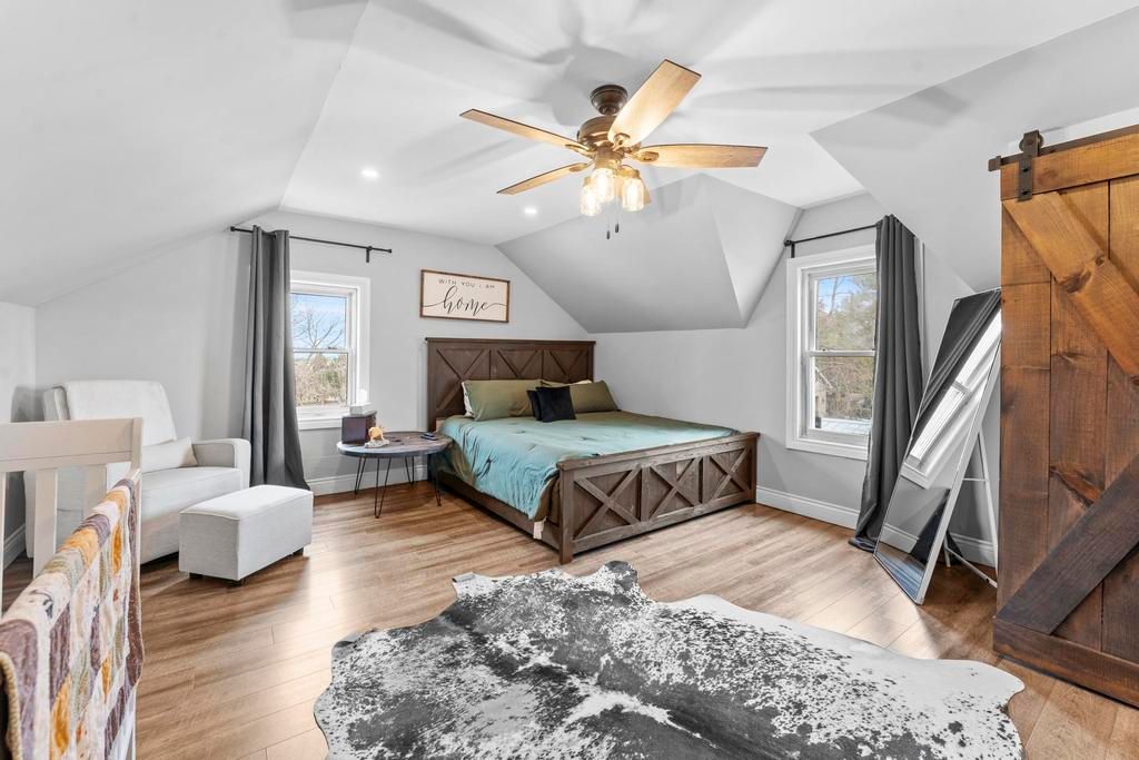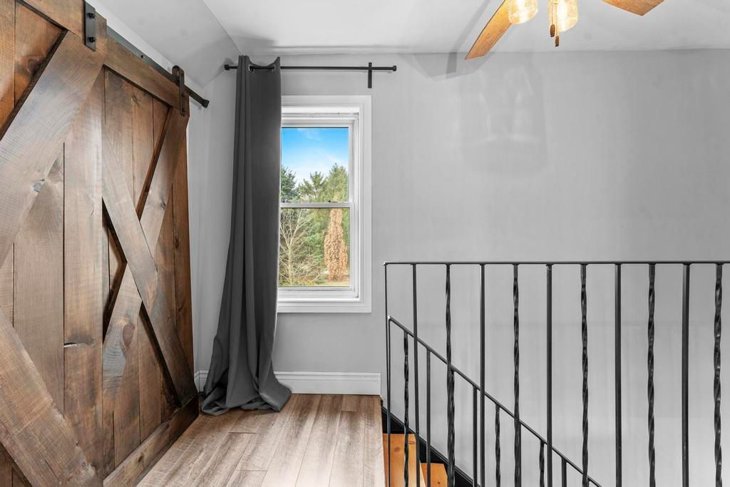 • Character-filled design with barnboard beams and barn doors.