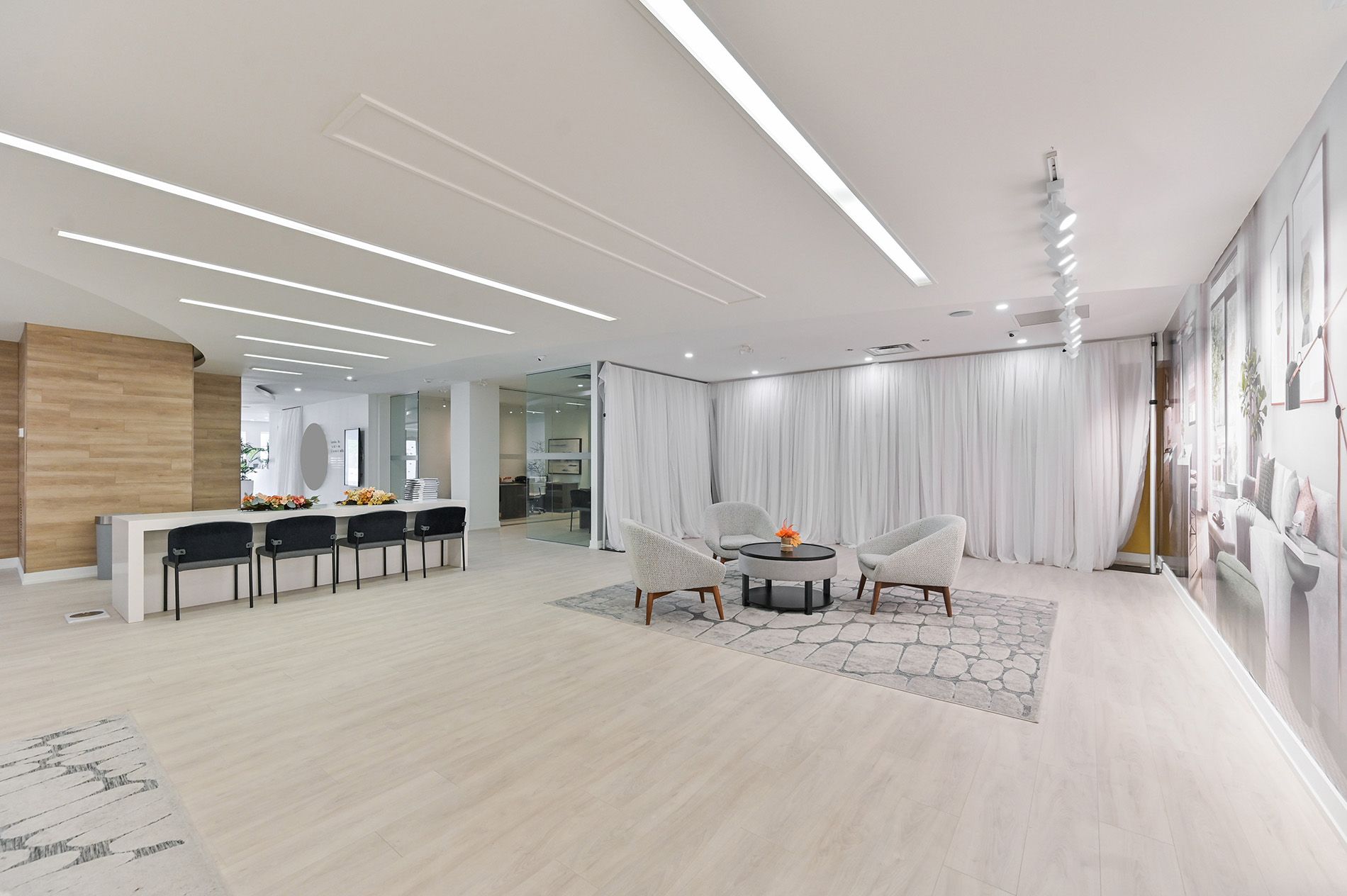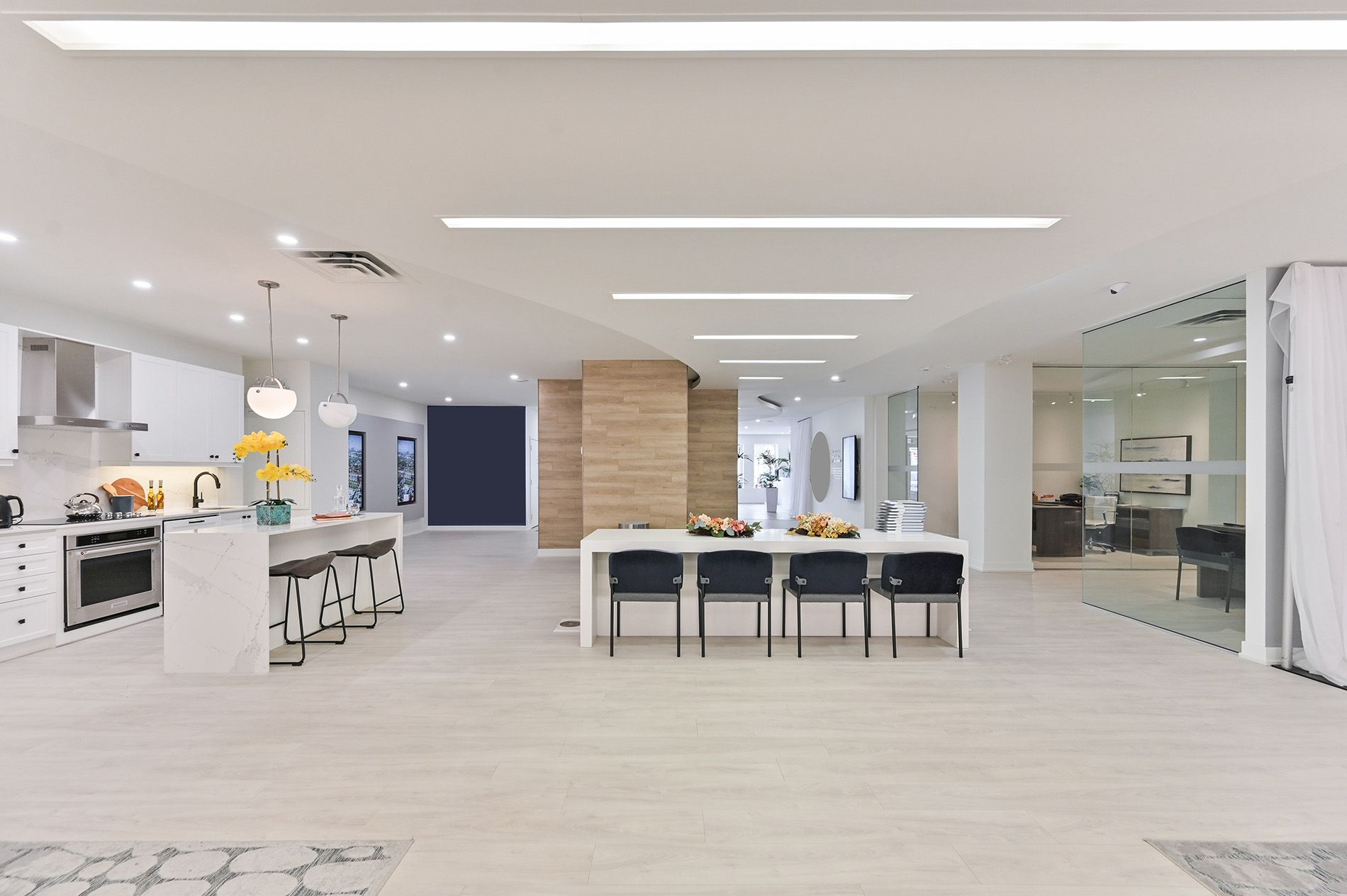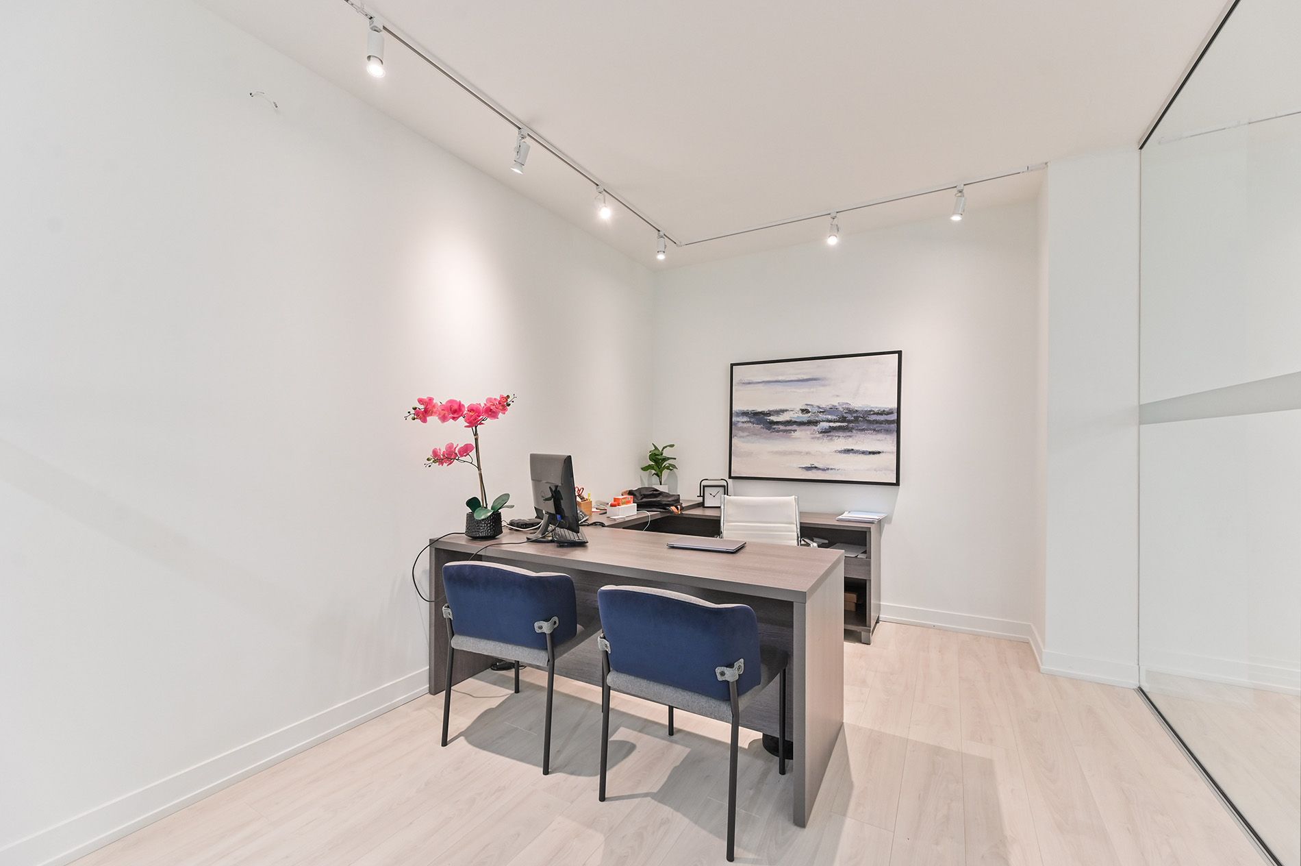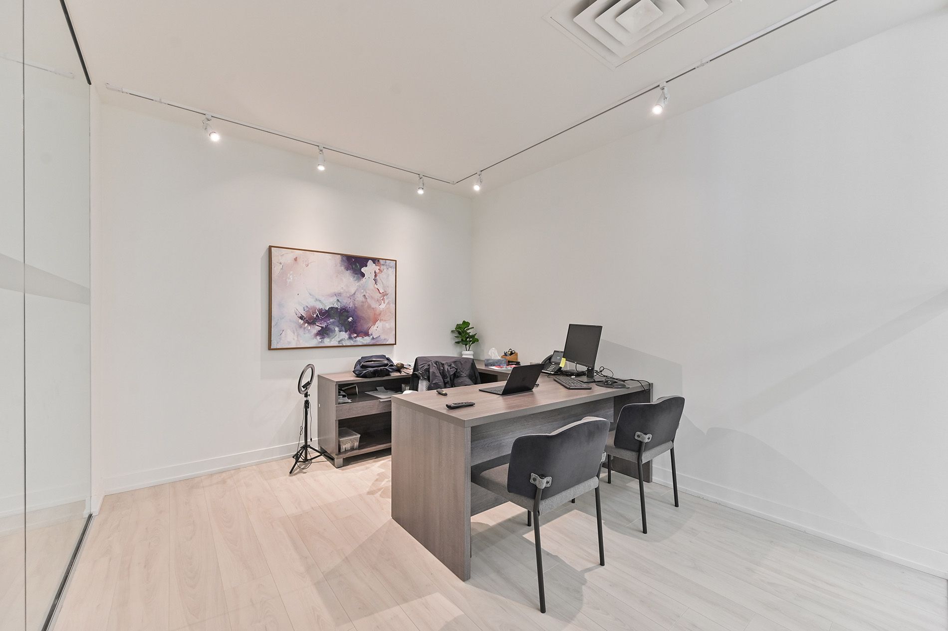 • Includes glass partitioned offices and a built-out reception area.
