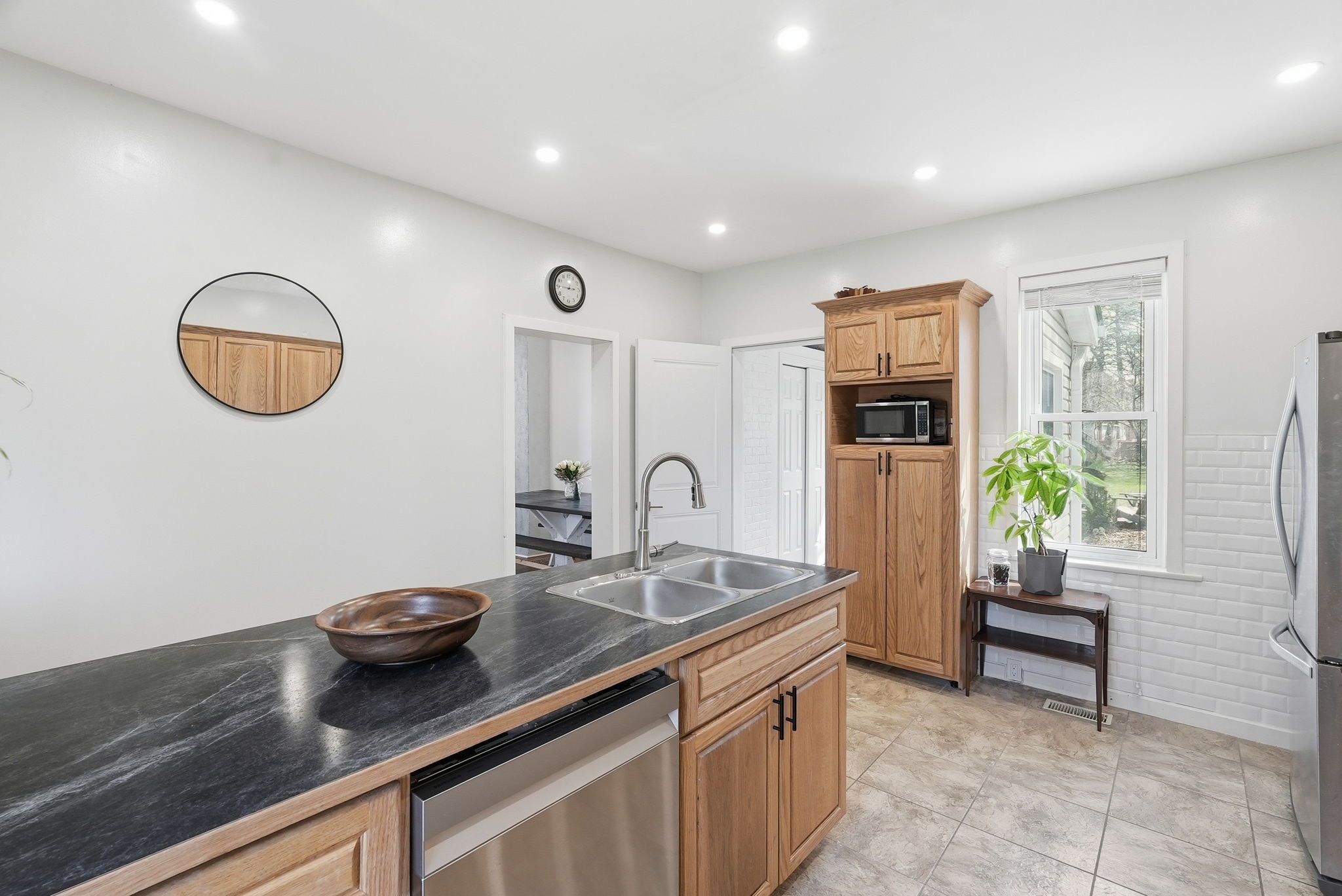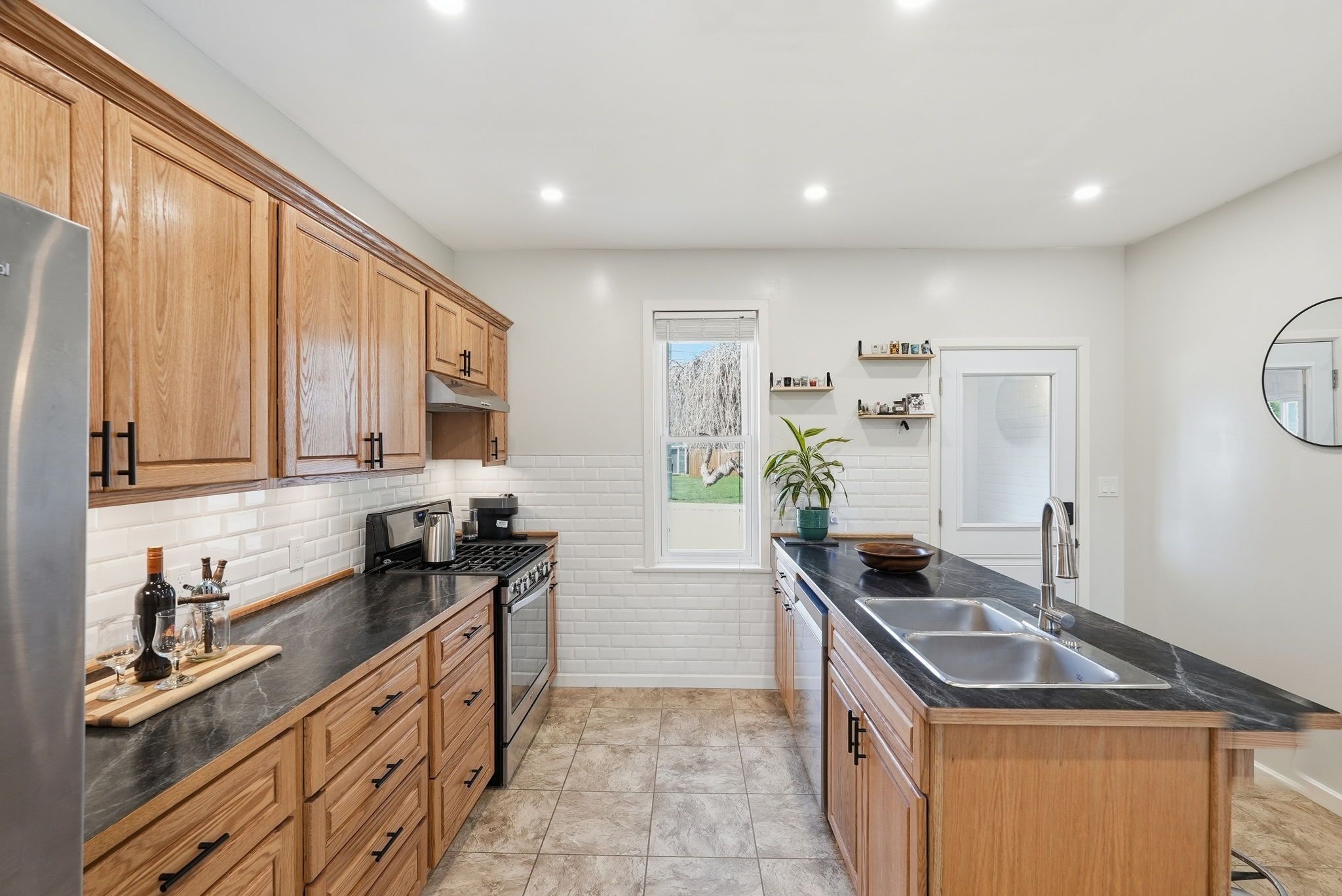 • Spacious kitchen with direct access to a large fenced backyard.