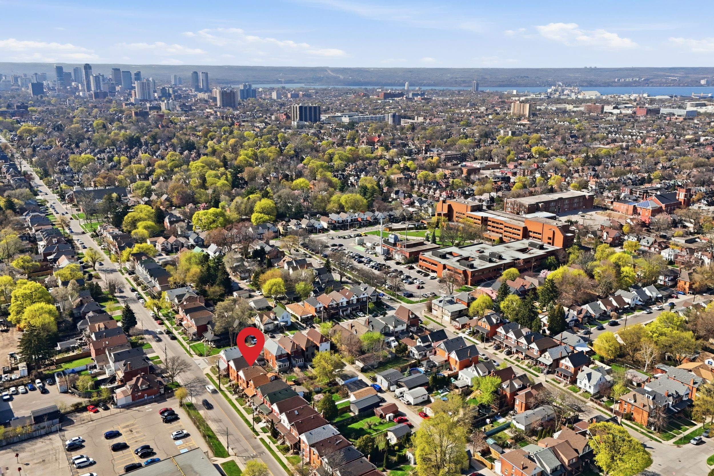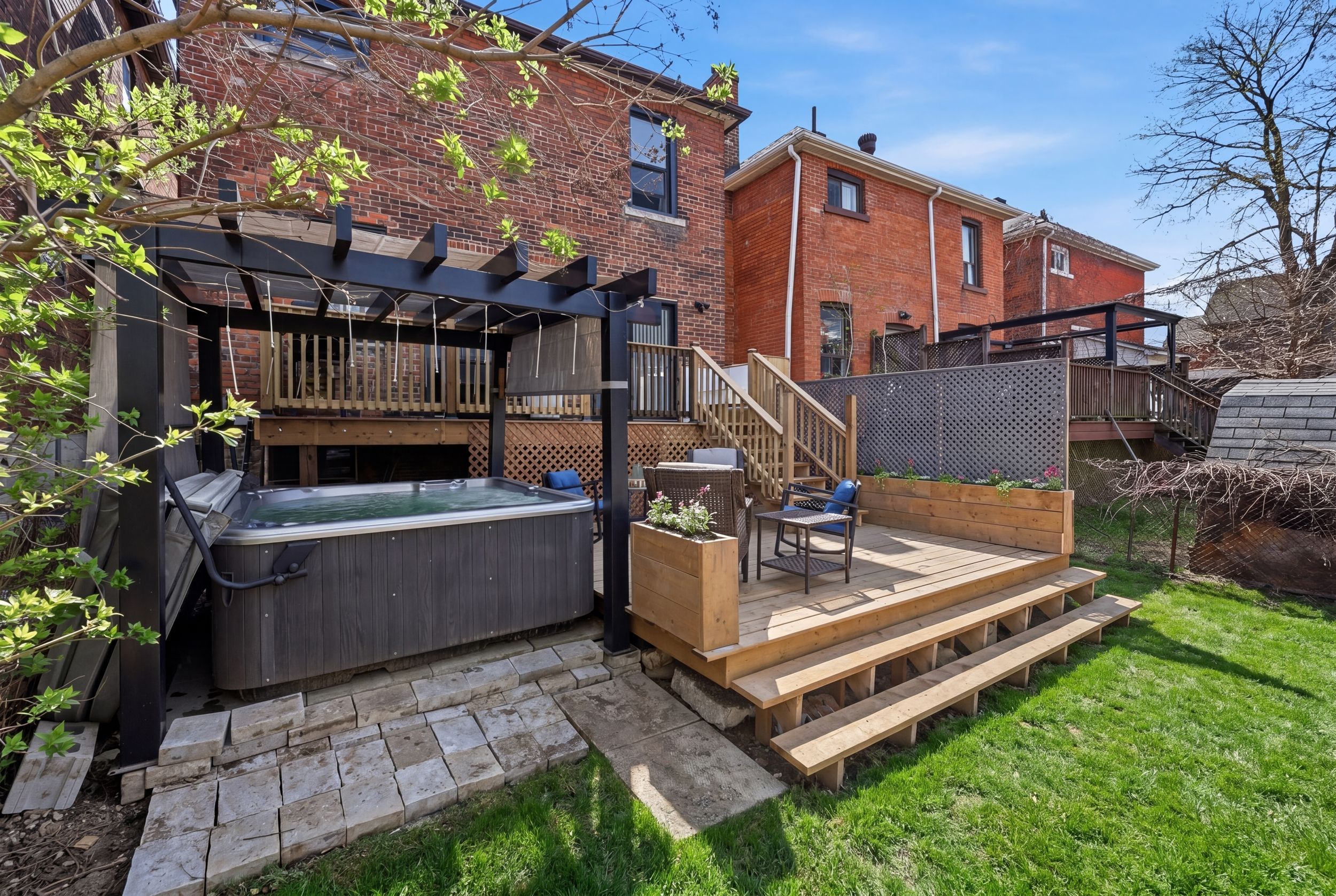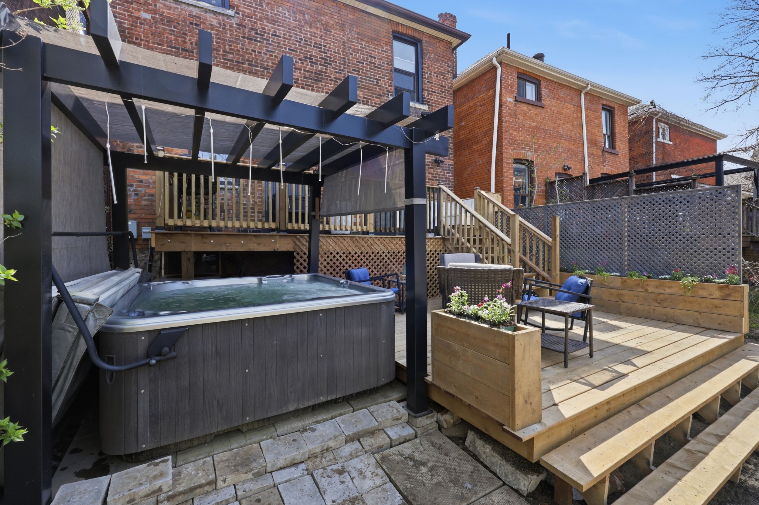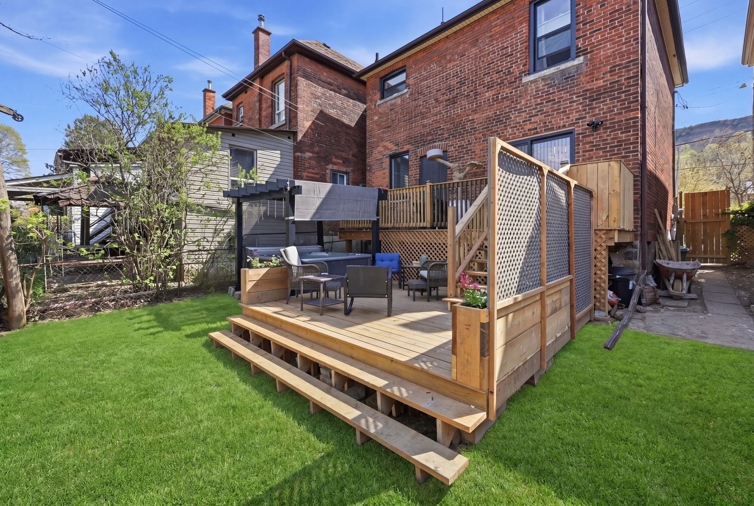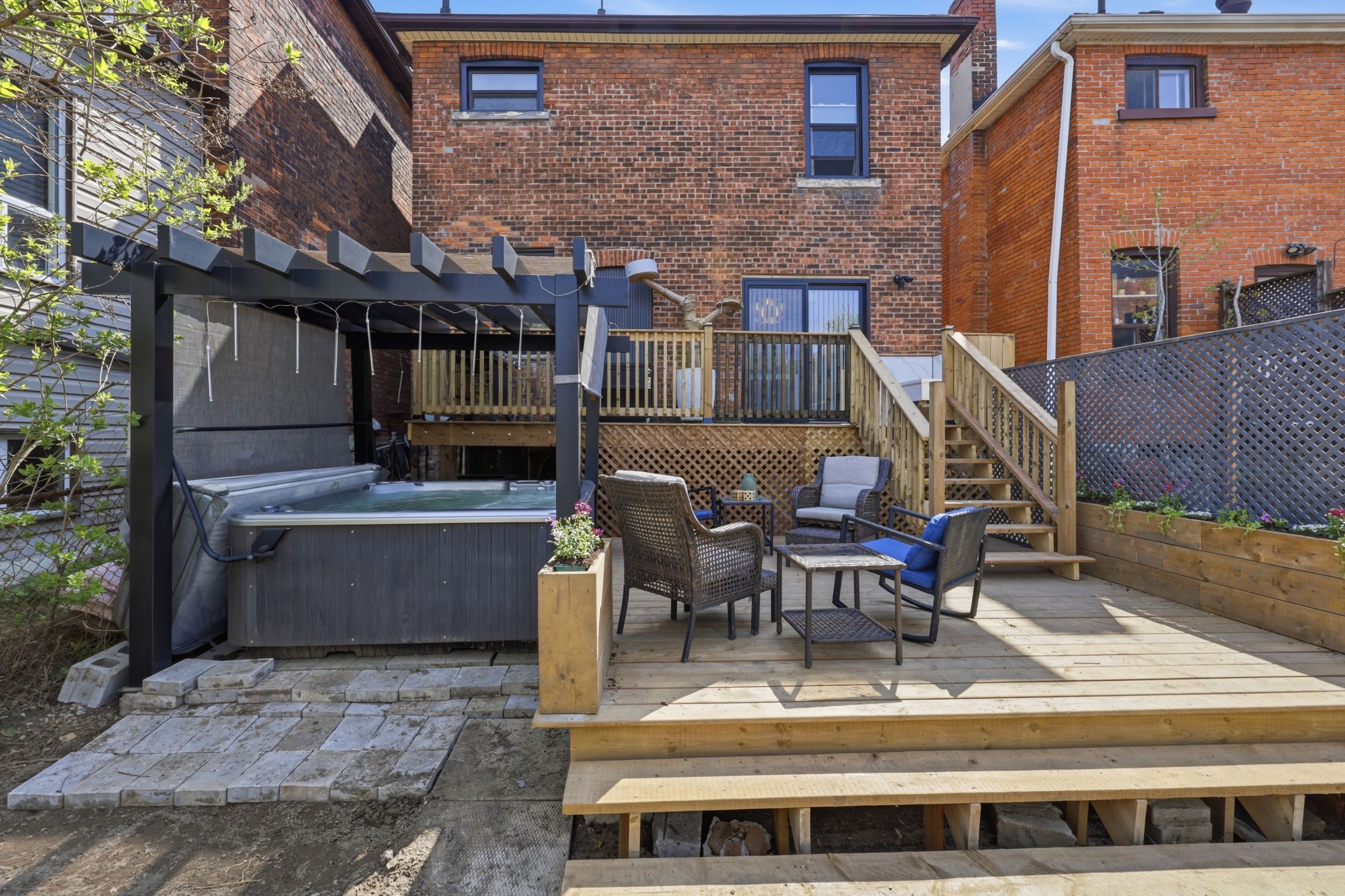 Experience the perfect fusion of 1899 character and modern design in this solid-brick victorian located in the sought-after blakeley neighborhood. The home opens with a striking checkered foyer leading into a sophisticated main floor, anchored by a living room featuring a sleek marble-patterned fireplace surround with elegant matte-black cabinets on either side. The heart of the home is the chef's kitchen, boasting premium white appliances, a navy center island with quartz counters, and custom cabinetry with stylish rattan inserts. This space flows seamlessly into a dedicated coffee bar and a sun-drenched dining area with sliding door access to the rear deck. Upstairs, the primary retreat offers a boutique atmosphere with custom wall paneling and gold sconce lighting. The spa-inspired bathroom is a true showstopper, featuring a freestanding soaking tub, a massive black-framed glass shower, and a double vanity set against a marble-veined feature wall. The outdoor oasis is designed for entertaining, featuring a multi-tier deck that leads to a private hot tub under a modern black pergola, all framed by custom planters and designer privacy fencing. This move-in-ready masterpiece offers a luxury lifestyle just steps from gage park and hamilton's best local amenities.
