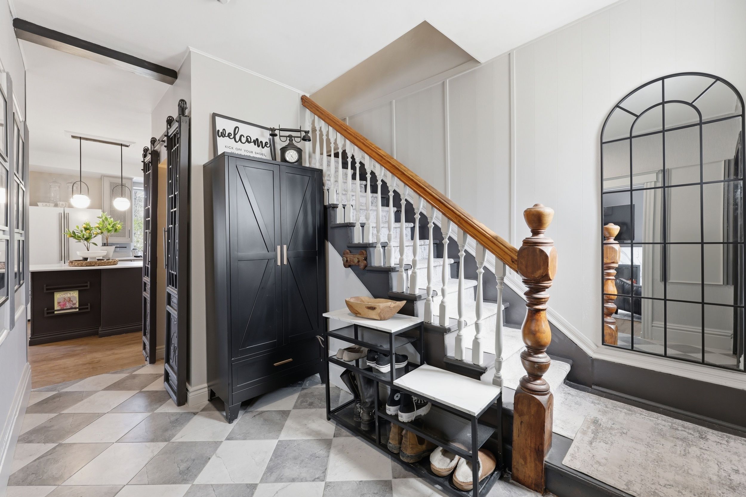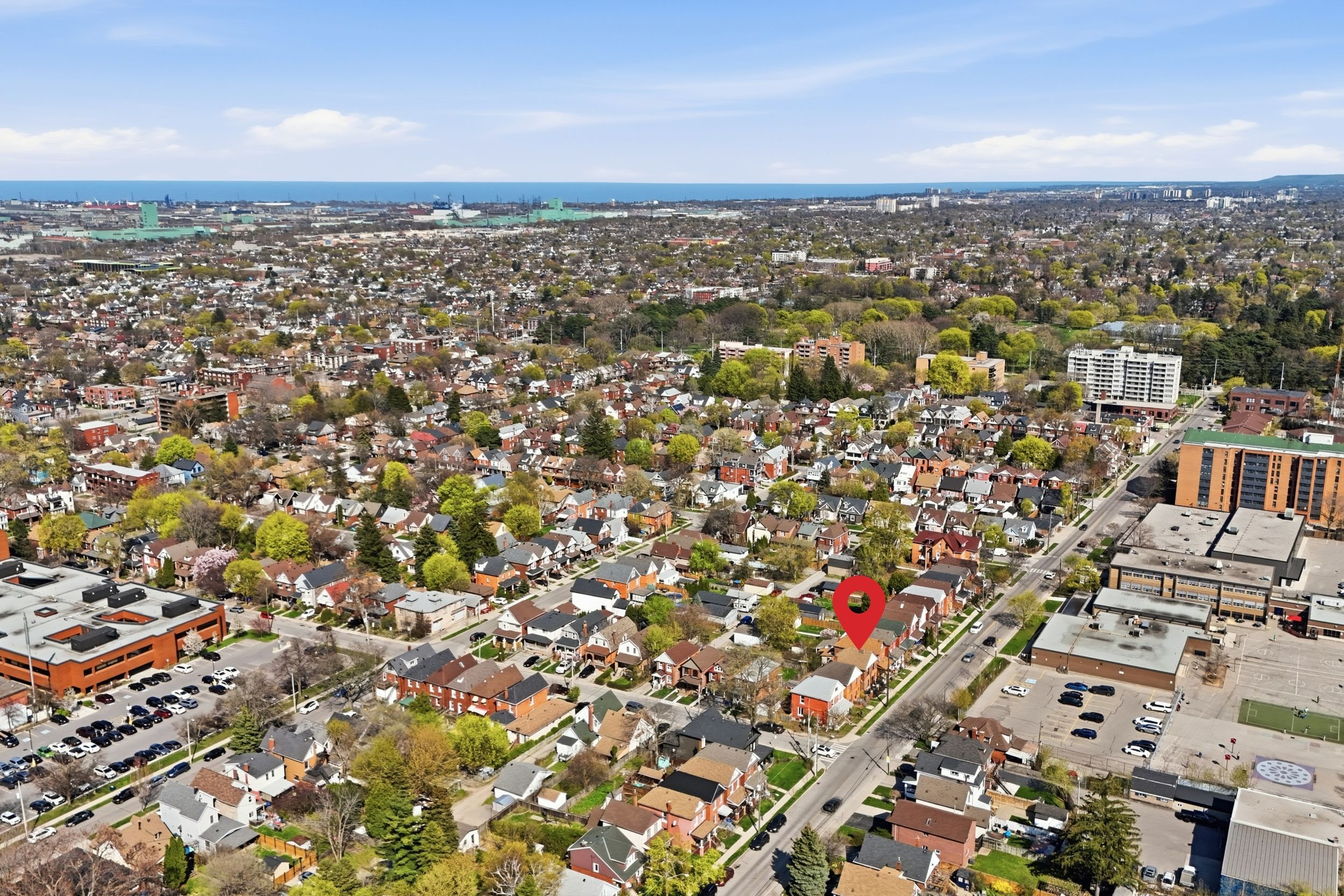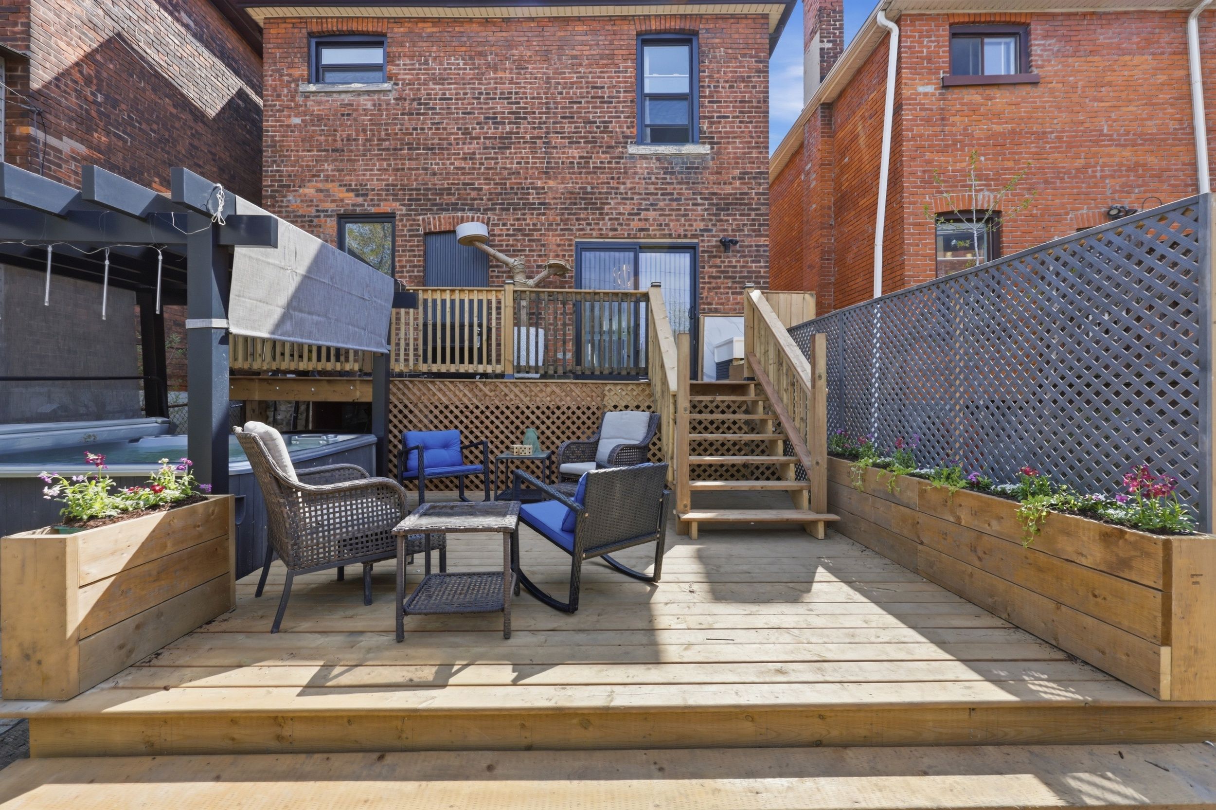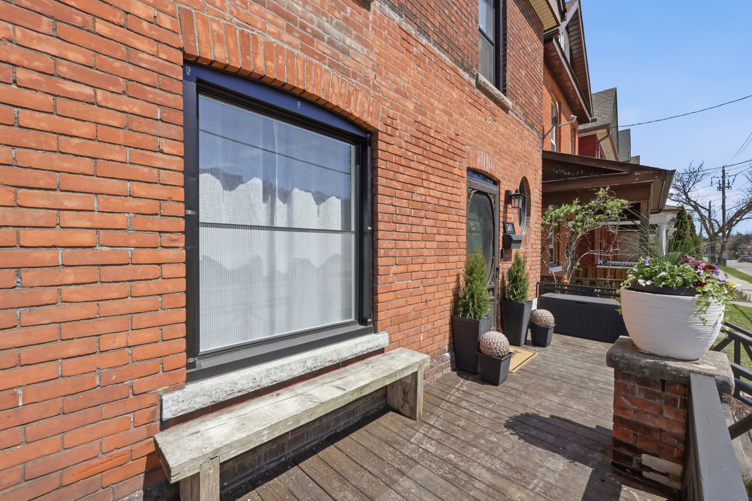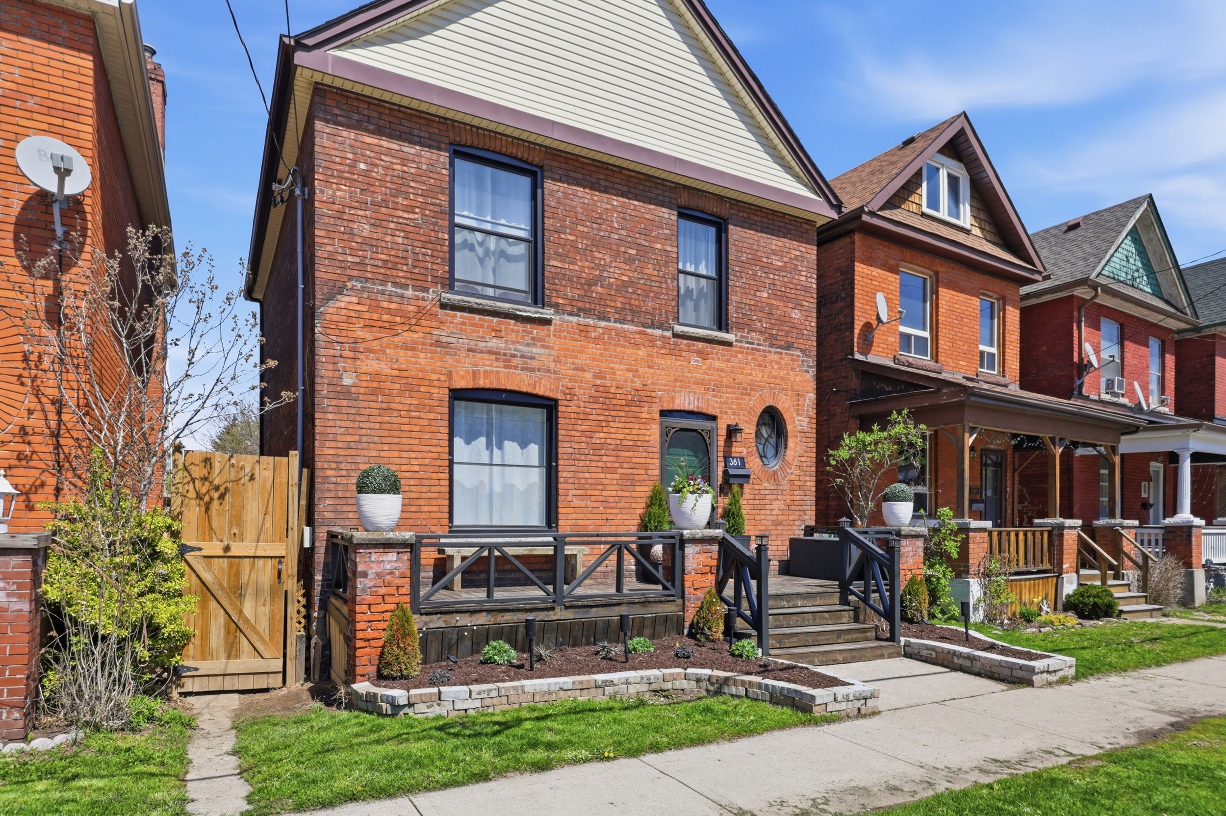 Experience the perfect fusion of 1899 character and modern design in this solid-brick victorian located in the sought-after blakeley neighborhood. The home opens with a striking checkered foyer leading into a sophisticated main floor, anchored by a living room featuring a sleek marble-patterned fireplace surround with elegant matte-black cabinets on either side. The heart of the home is the chef's kitchen, boasting premium white appliances, a navy center island with quartz counters, and custom cabinetry with stylish rattan inserts. This space flows seamlessly into a dedicated coffee bar and a sun-drenched dining area with sliding door access to the rear deck. Upstairs, the primary retreat offers a boutique atmosphere with custom wall paneling and gold sconce lighting. The spa-inspired bathroom is a true showstopper, featuring a freestanding soaking tub, a massive black-framed glass shower, and a double vanity set against a marble-veined feature wall. The outdoor oasis is designed for entertaining, featuring a multi-tier deck that leads to a private hot tub under a modern black pergola, all framed by custom planters and designer privacy fencing. This move-in-ready masterpiece offers a luxury lifestyle just steps from gage park and hamilton's best local amenities.