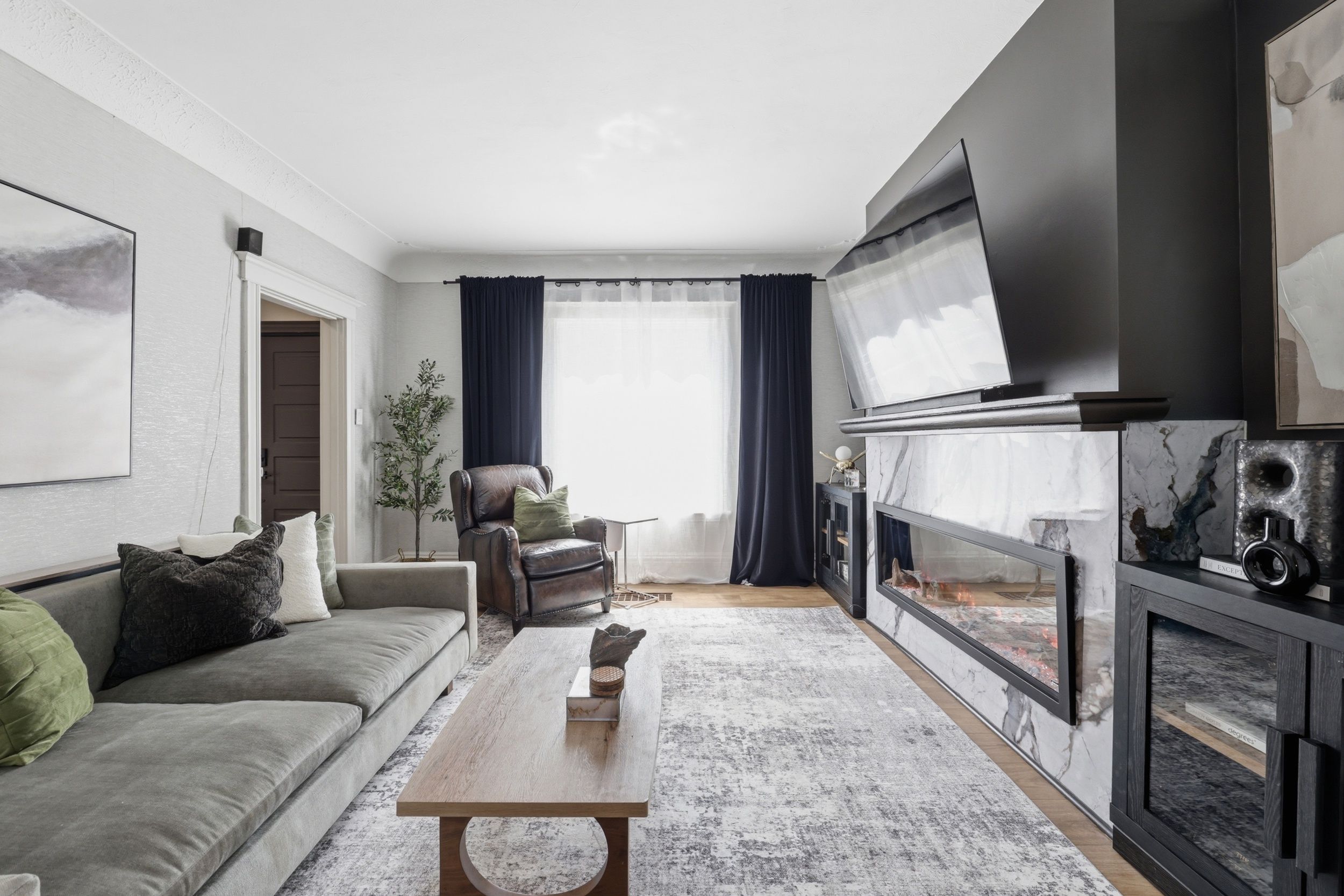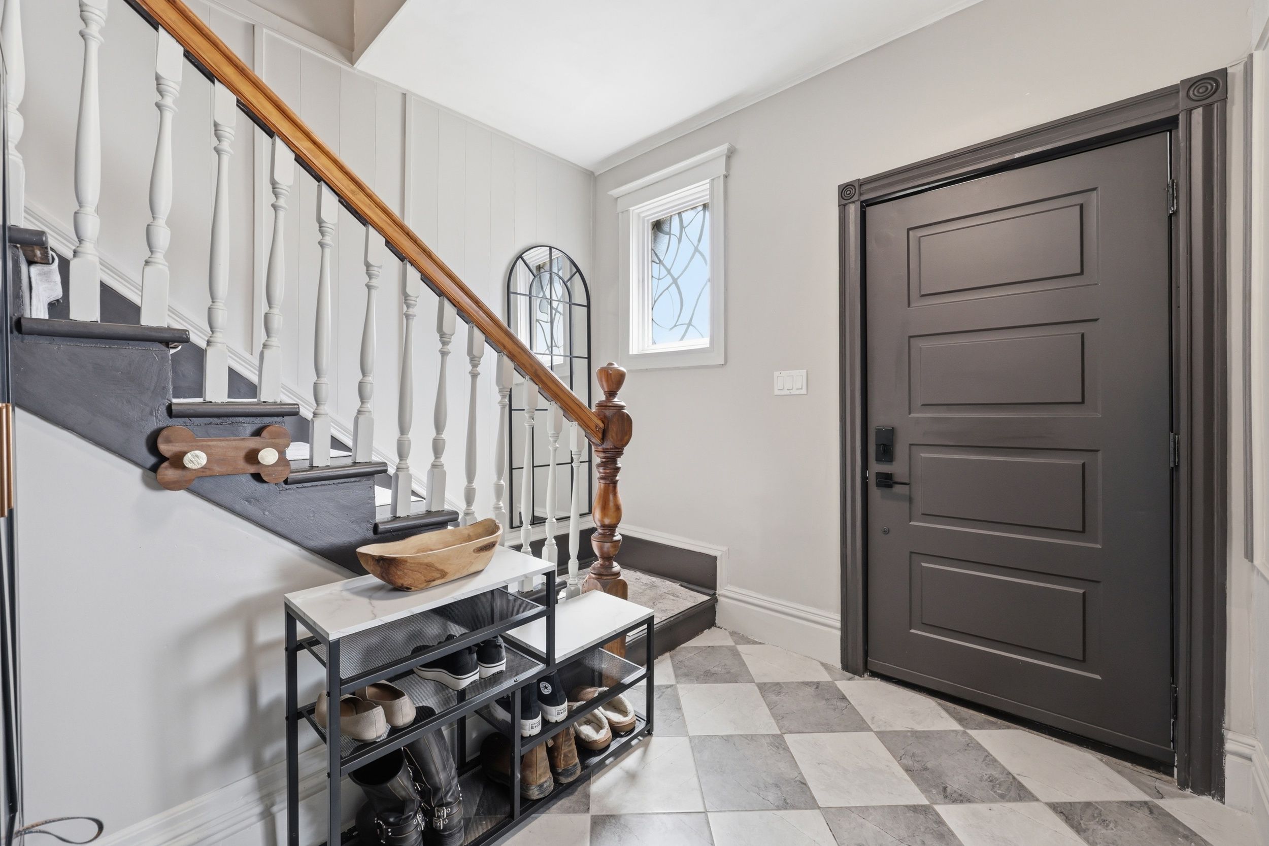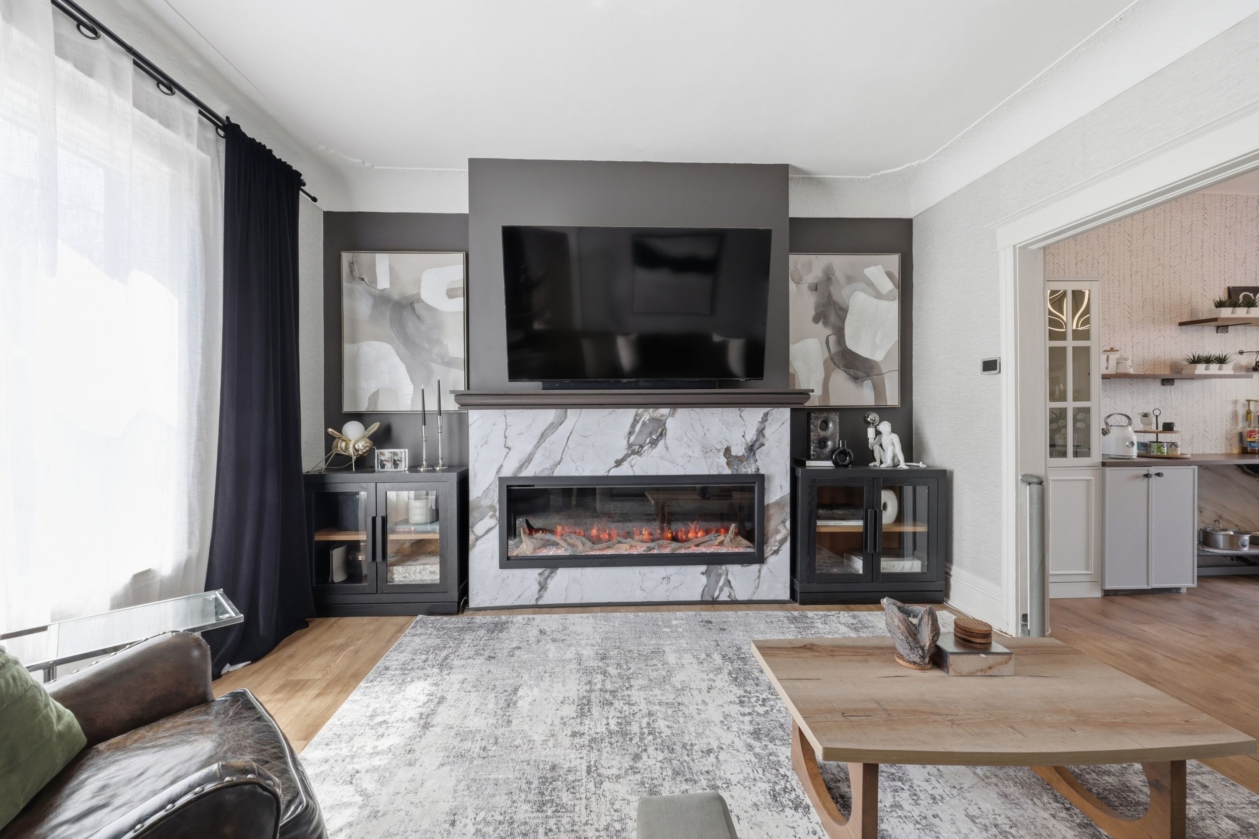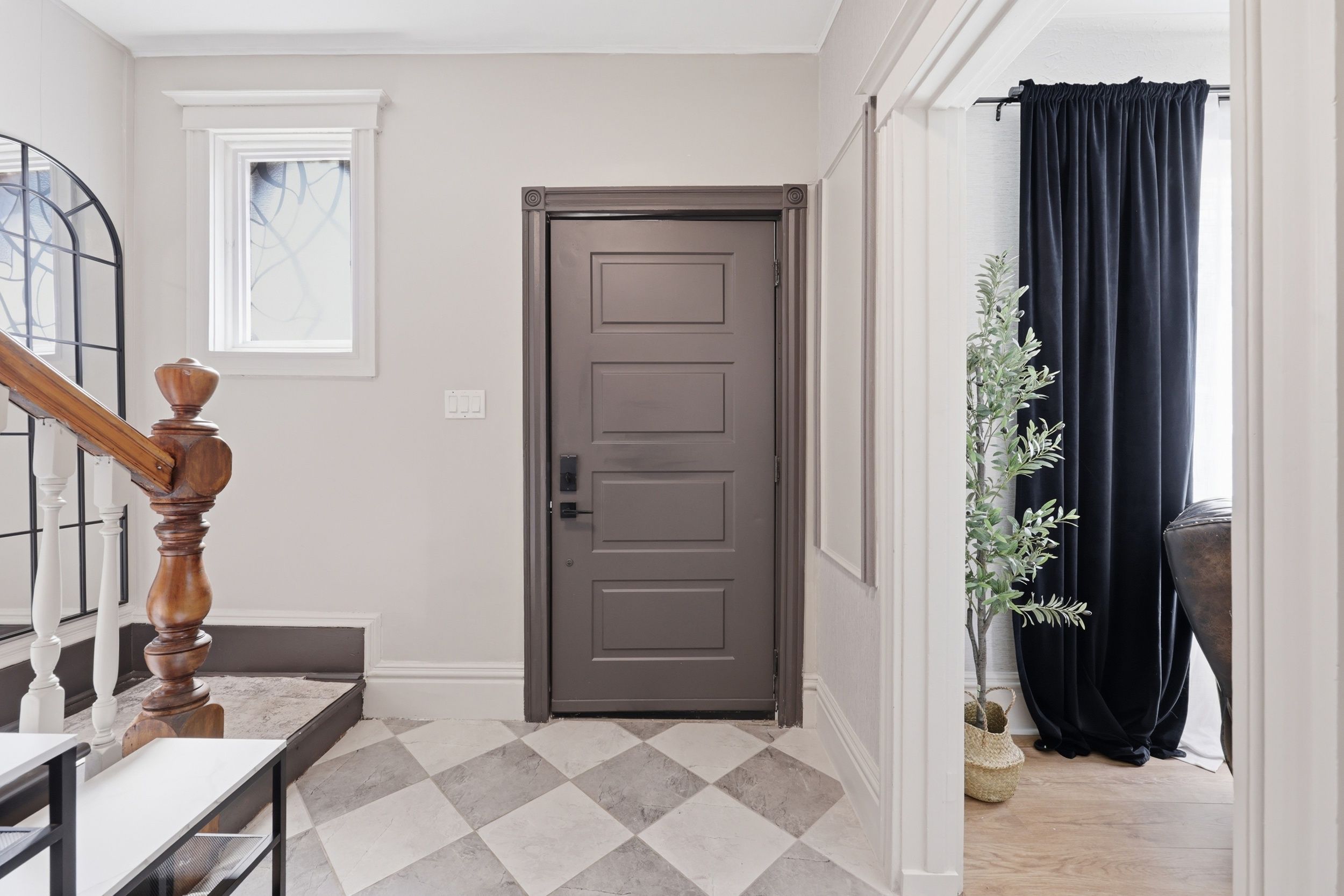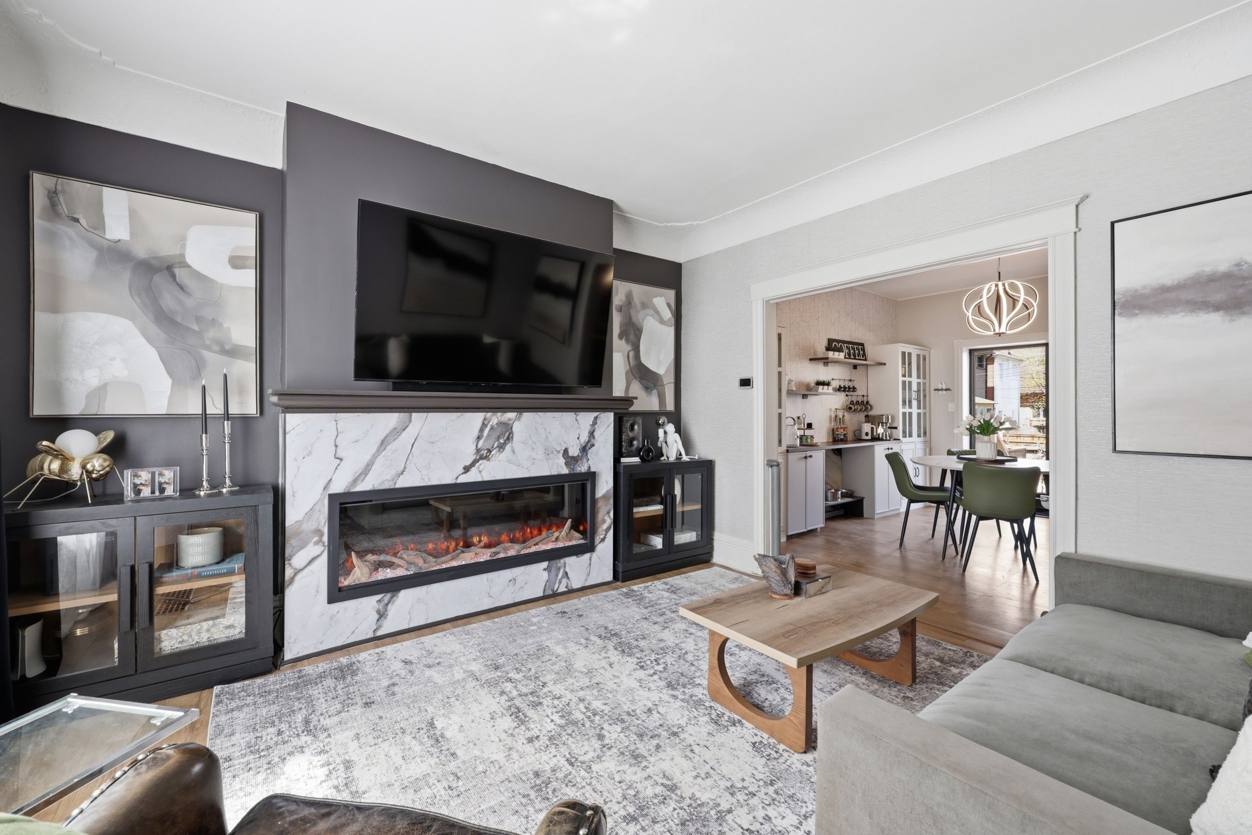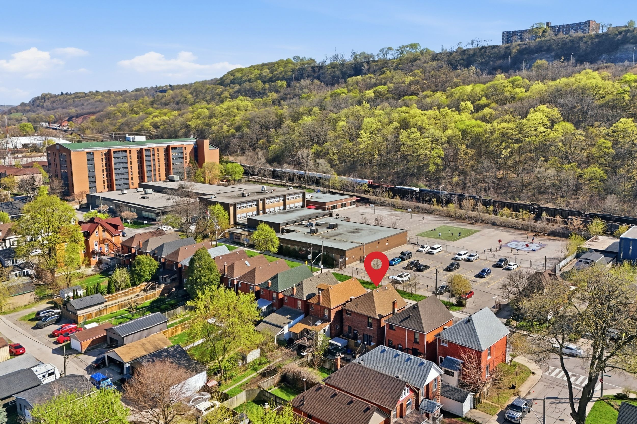 Experience the perfect fusion of 1899 character and modern design in this solid-brick victorian located in the sought-after blakeley neighborhood. The home opens with a striking checkered foyer leading into a sophisticated main floor, anchored by a living room featuring a sleek marble-patterned fireplace surround with elegant matte-black cabinets on either side. The heart of the home is the chef's kitchen, boasting premium white appliances, a navy center island with quartz counters, and custom cabinetry with stylish rattan inserts. This space flows seamlessly into a dedicated coffee bar and a sun-drenched dining area with sliding door access to the rear deck. Upstairs, the primary retreat offers a boutique atmosphere with custom wall paneling and gold sconce lighting. The spa-inspired bathroom is a true showstopper, featuring a freestanding soaking tub, a massive black-framed glass shower, and a double vanity set against a marble-veined feature wall. The outdoor oasis is designed for entertaining, featuring a multi-tier deck that leads to a private hot tub under a modern black pergola, all framed by custom planters and designer privacy fencing. This move-in-ready masterpiece offers a luxury lifestyle just steps from gage park and hamilton's best local amenities.