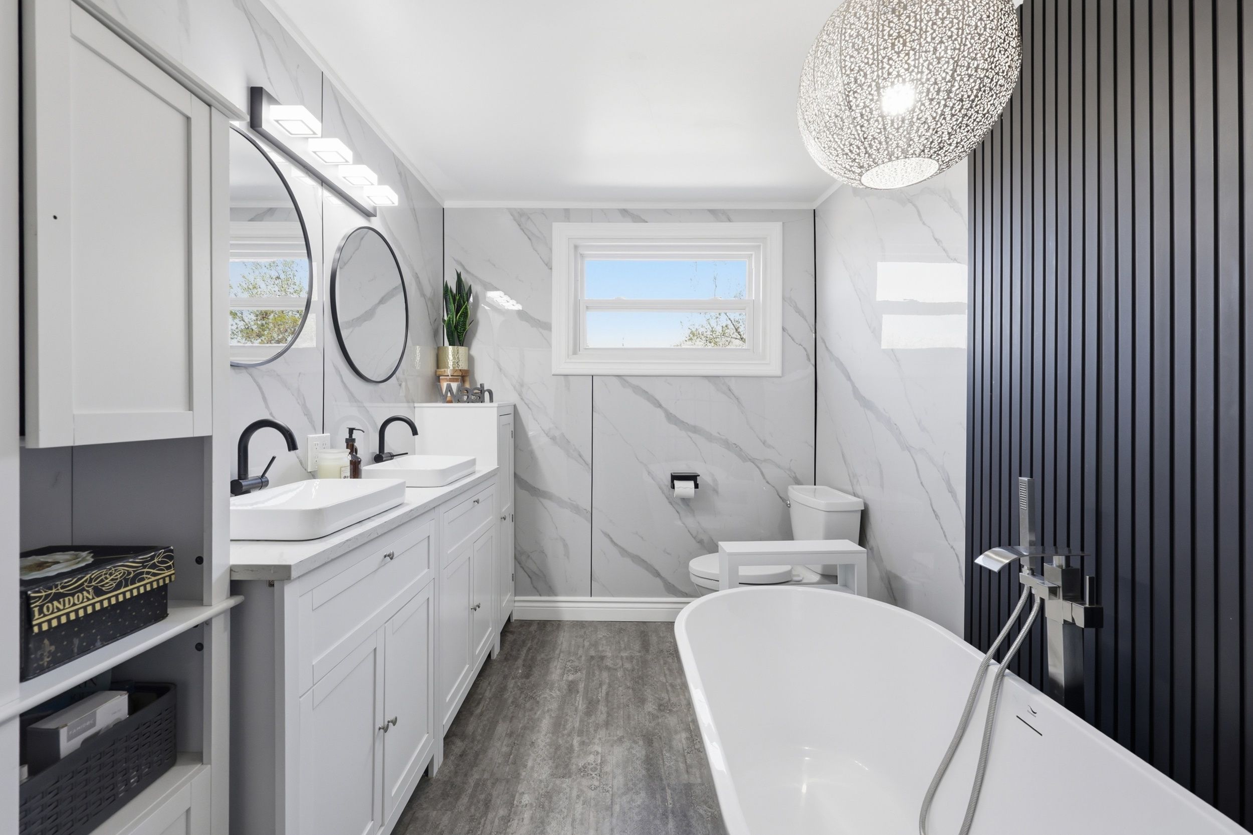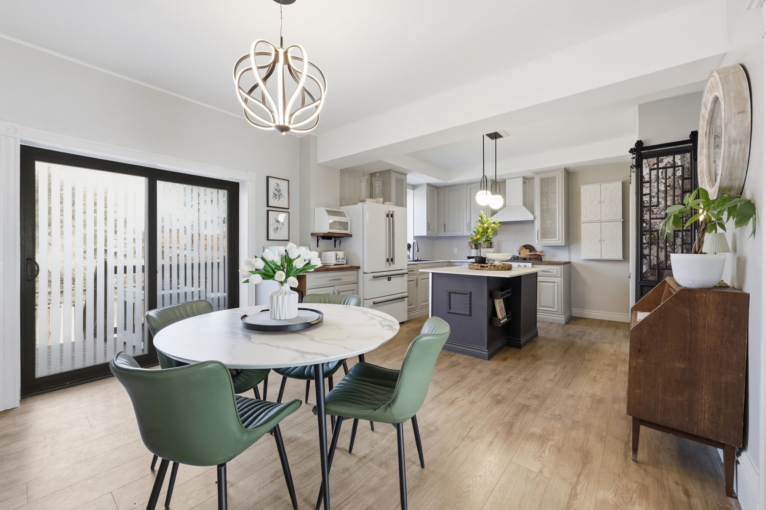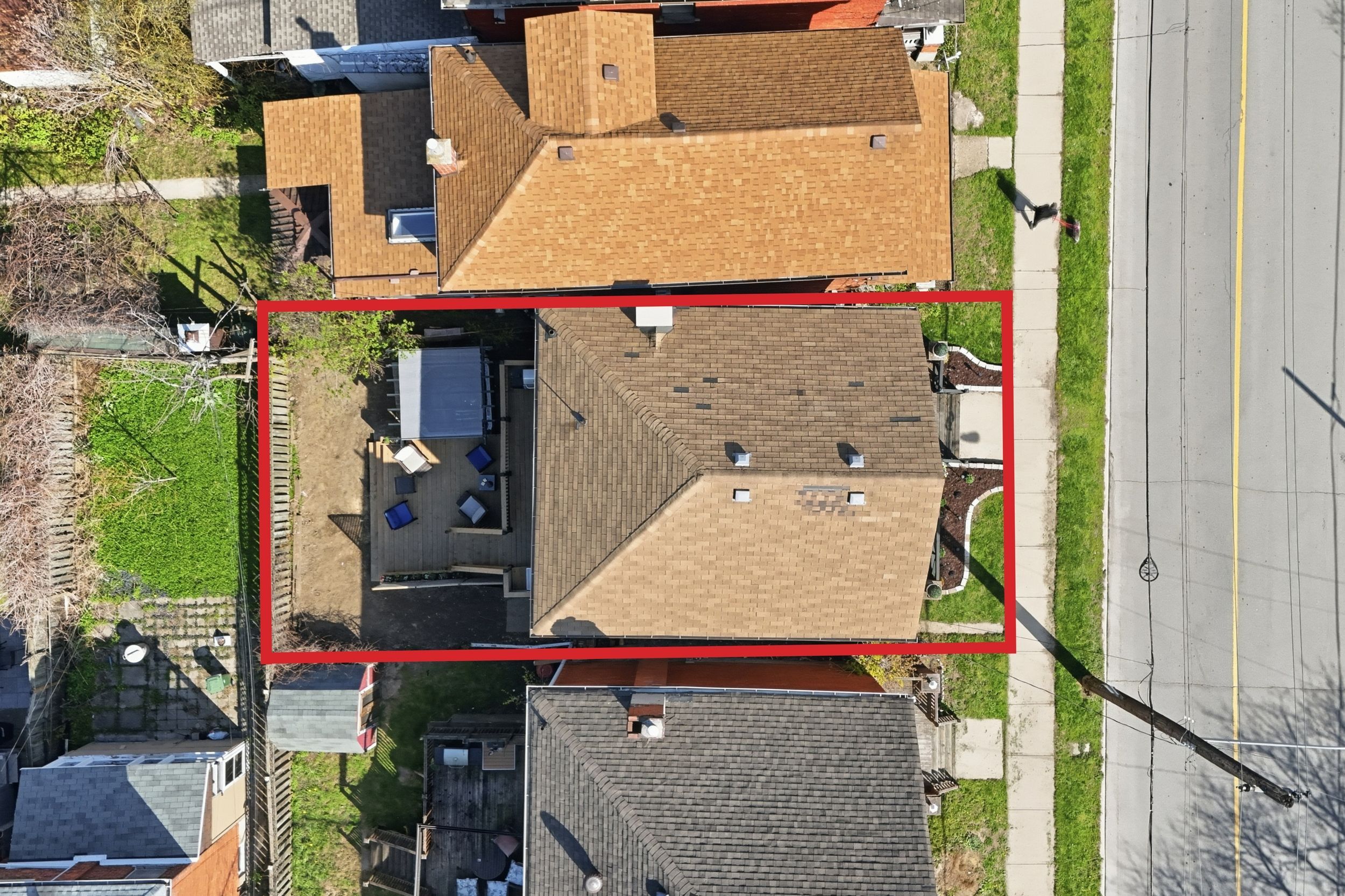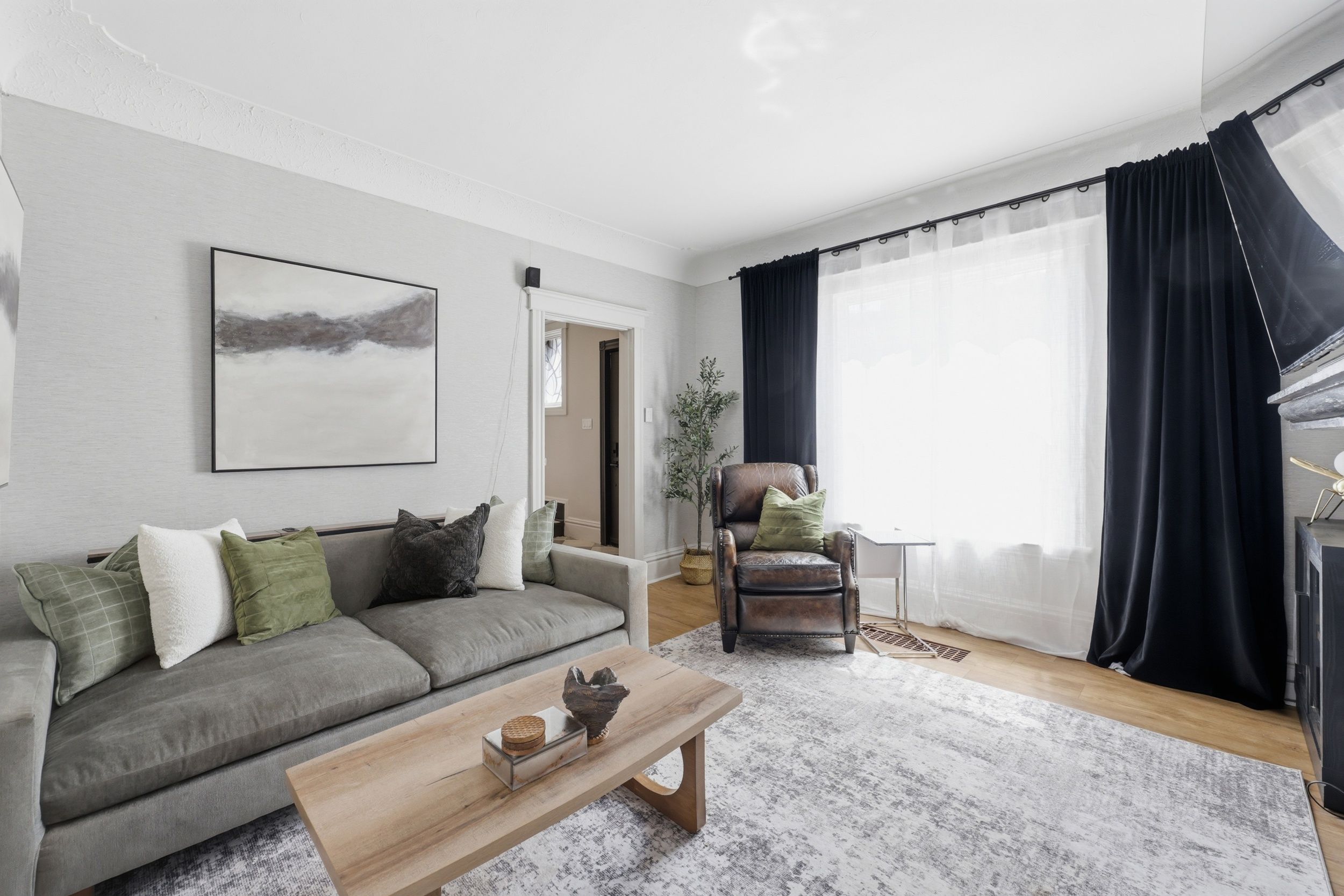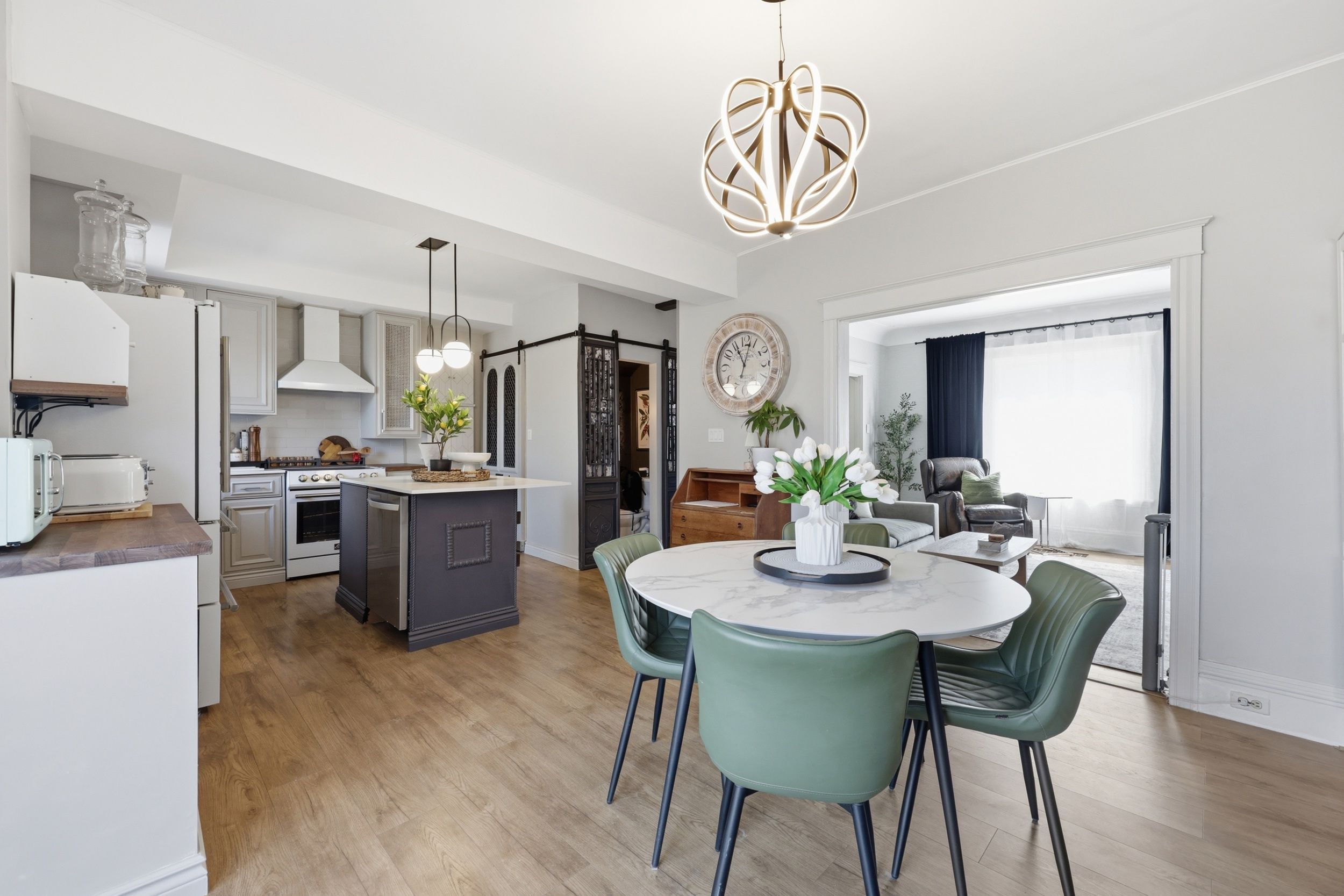 Experience the perfect fusion of 1899 character and modern design in this solid-brick victorian located in the sought-after blakeley neighborhood. The home opens with a striking checkered foyer leading into a sophisticated main floor, anchored by a living room featuring a sleek marble-patterned fireplace surround with elegant matte-black cabinets on either side. The heart of the home is the chef's kitchen, boasting premium white appliances, a navy center island with quartz counters, and custom cabinetry with stylish rattan inserts. This space flows seamlessly into a dedicated coffee bar and a sun-drenched dining area with sliding door access to the rear deck. Upstairs, the primary retreat offers a boutique atmosphere with custom wall paneling and gold sconce lighting. The spa-inspired bathroom is a true showstopper, featuring a freestanding soaking tub, a massive black-framed glass shower, and a double vanity set against a marble-veined feature wall. The outdoor oasis is designed for entertaining, featuring a multi-tier deck that leads to a private hot tub under a modern black pergola, all framed by custom planters and designer privacy fencing. This move-in-ready masterpiece offers a luxury lifestyle just steps from gage park and hamilton's best local amenities.