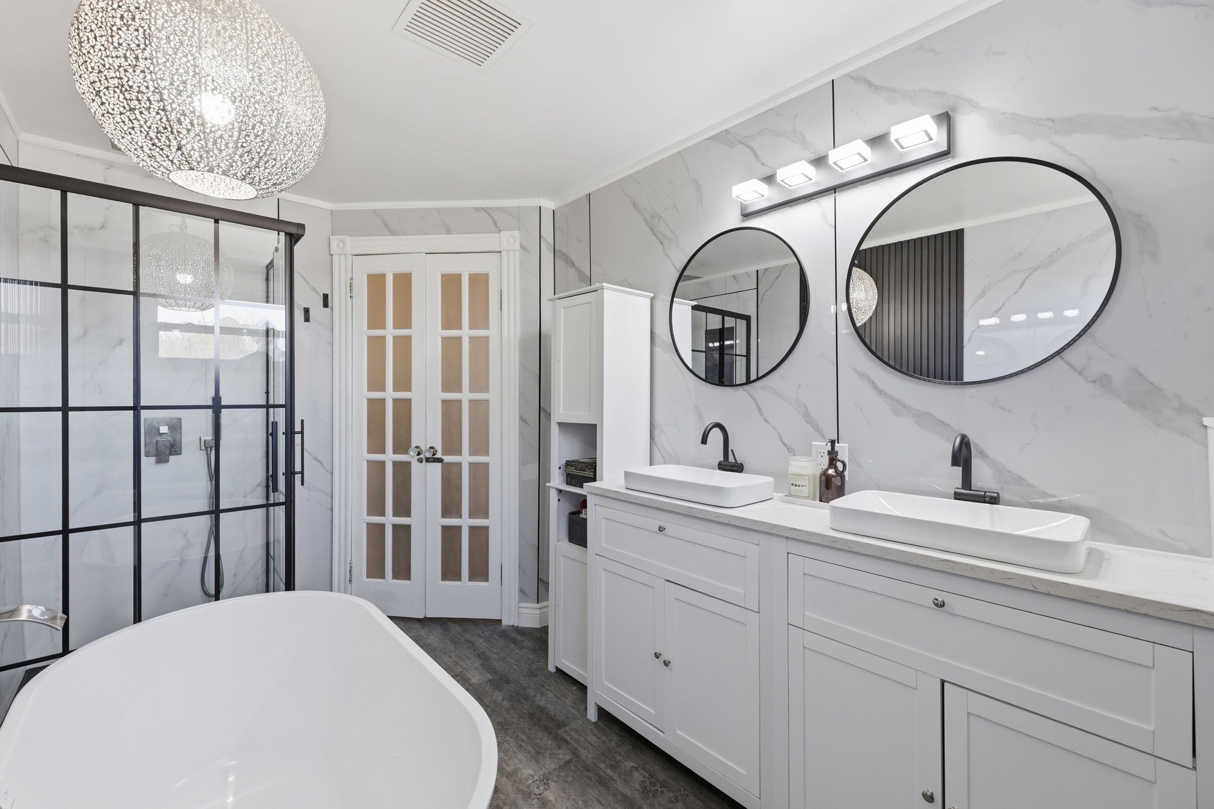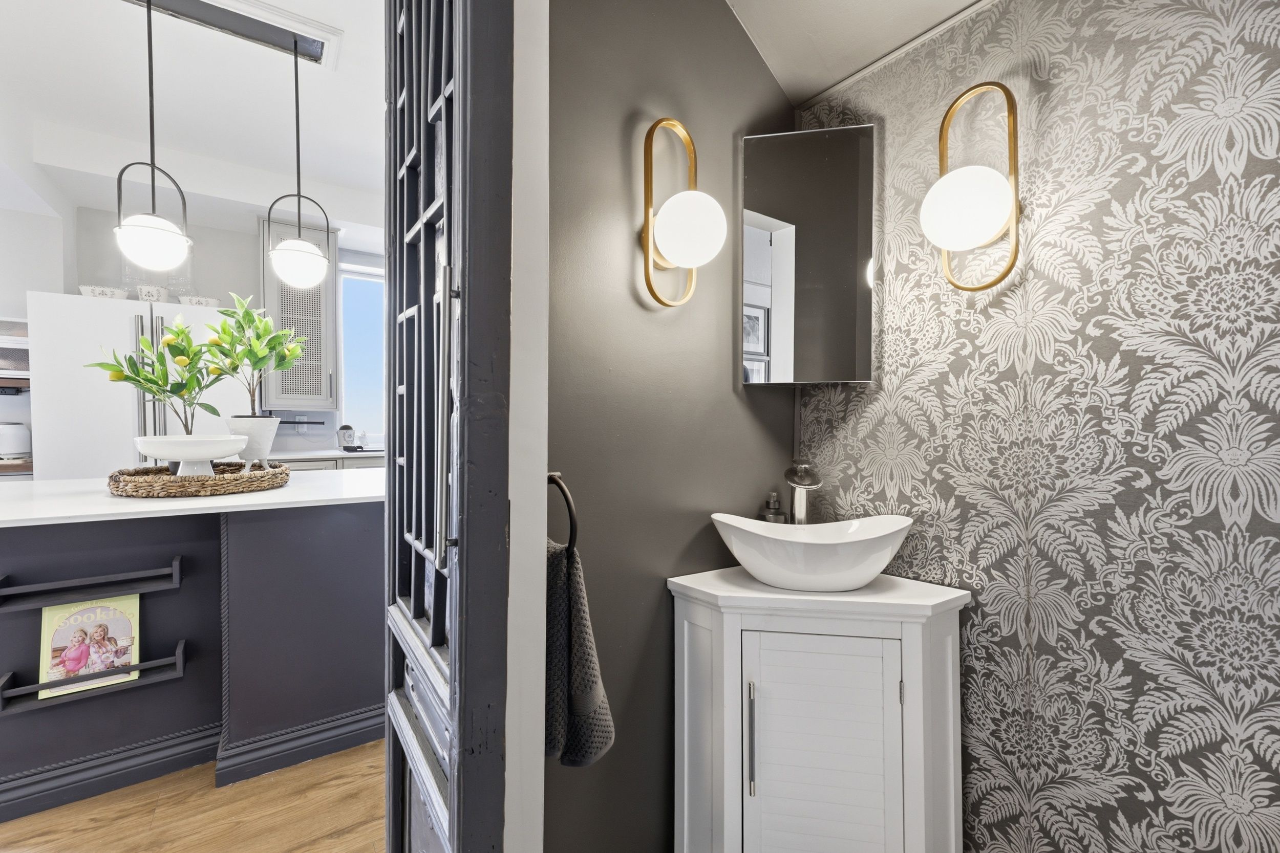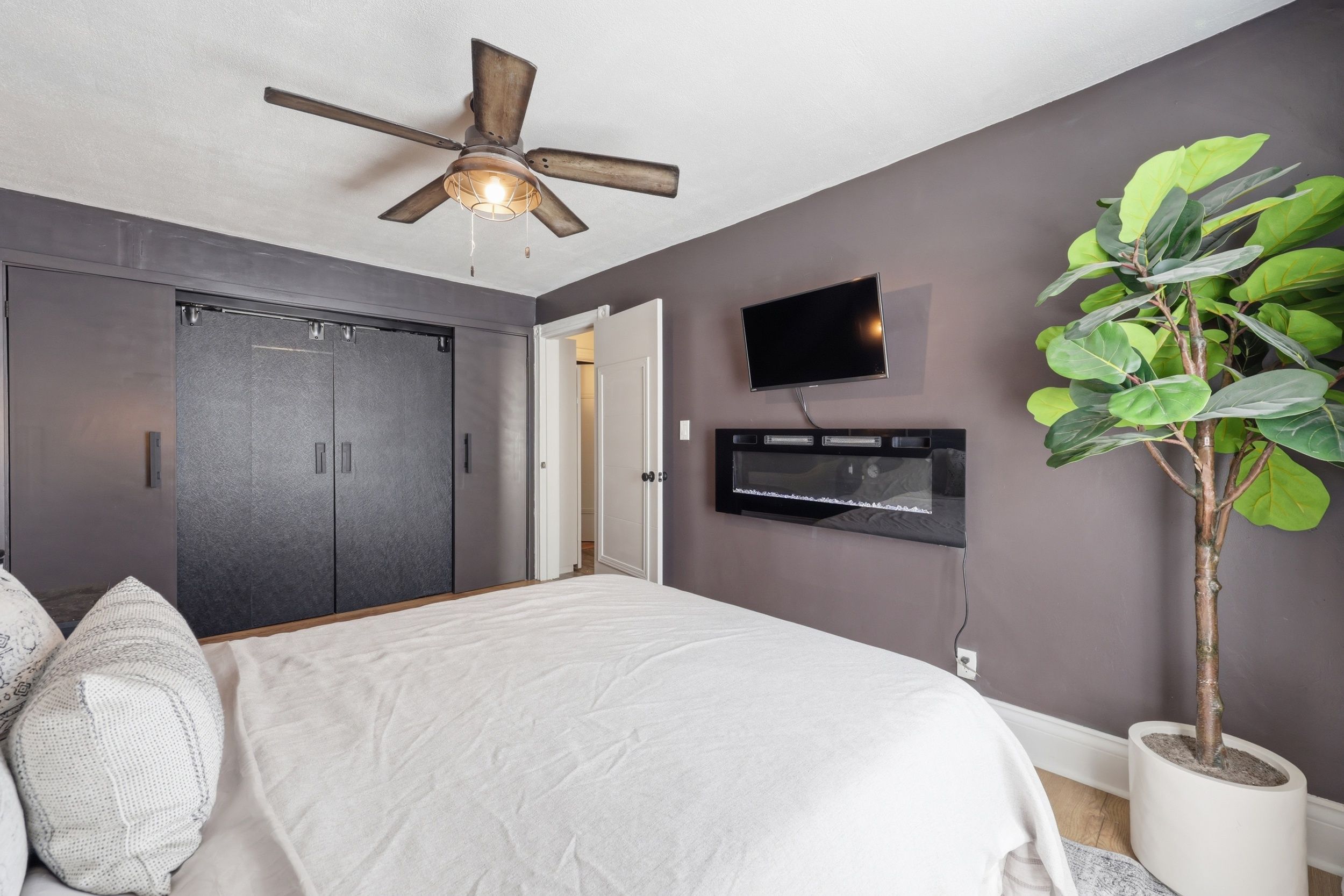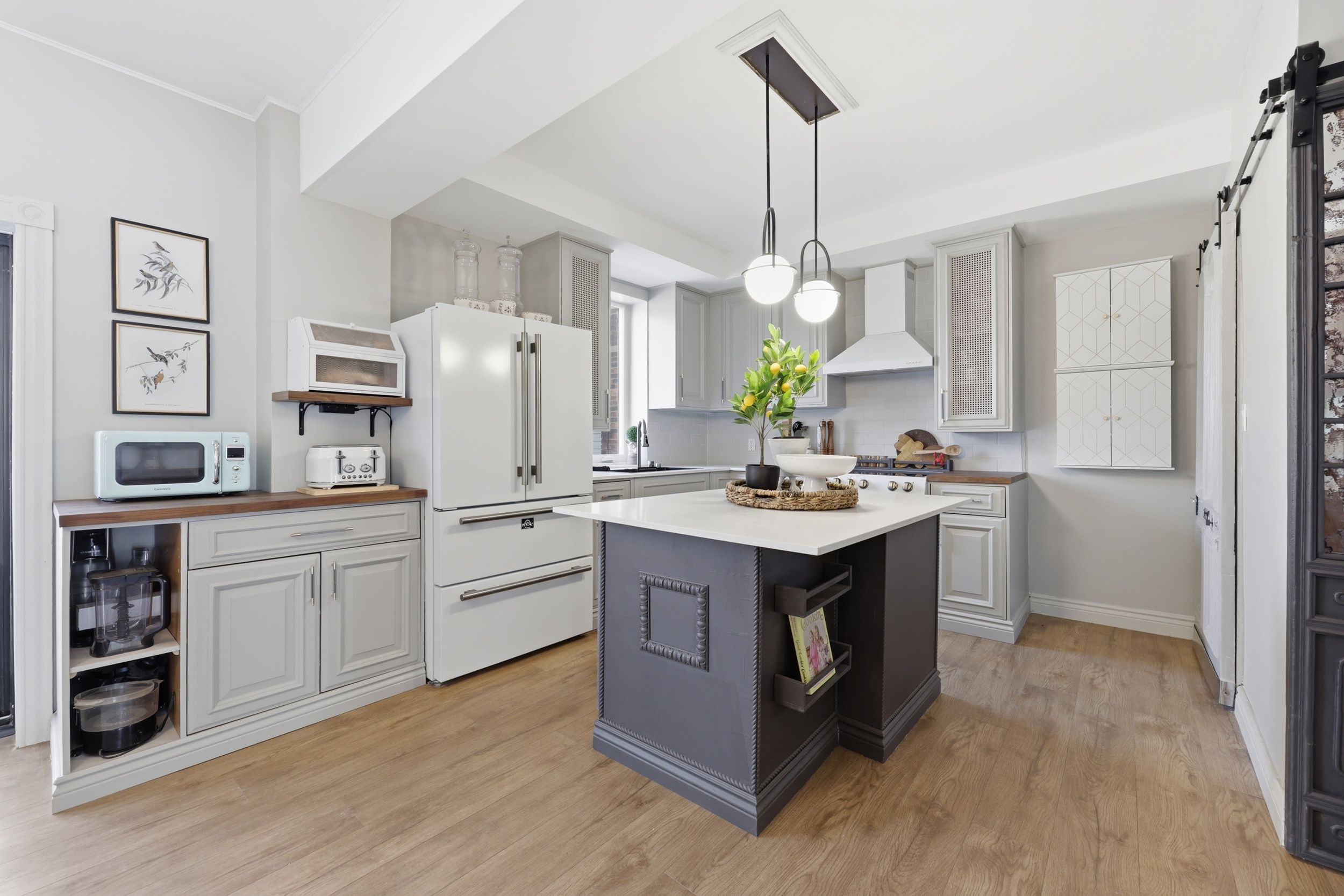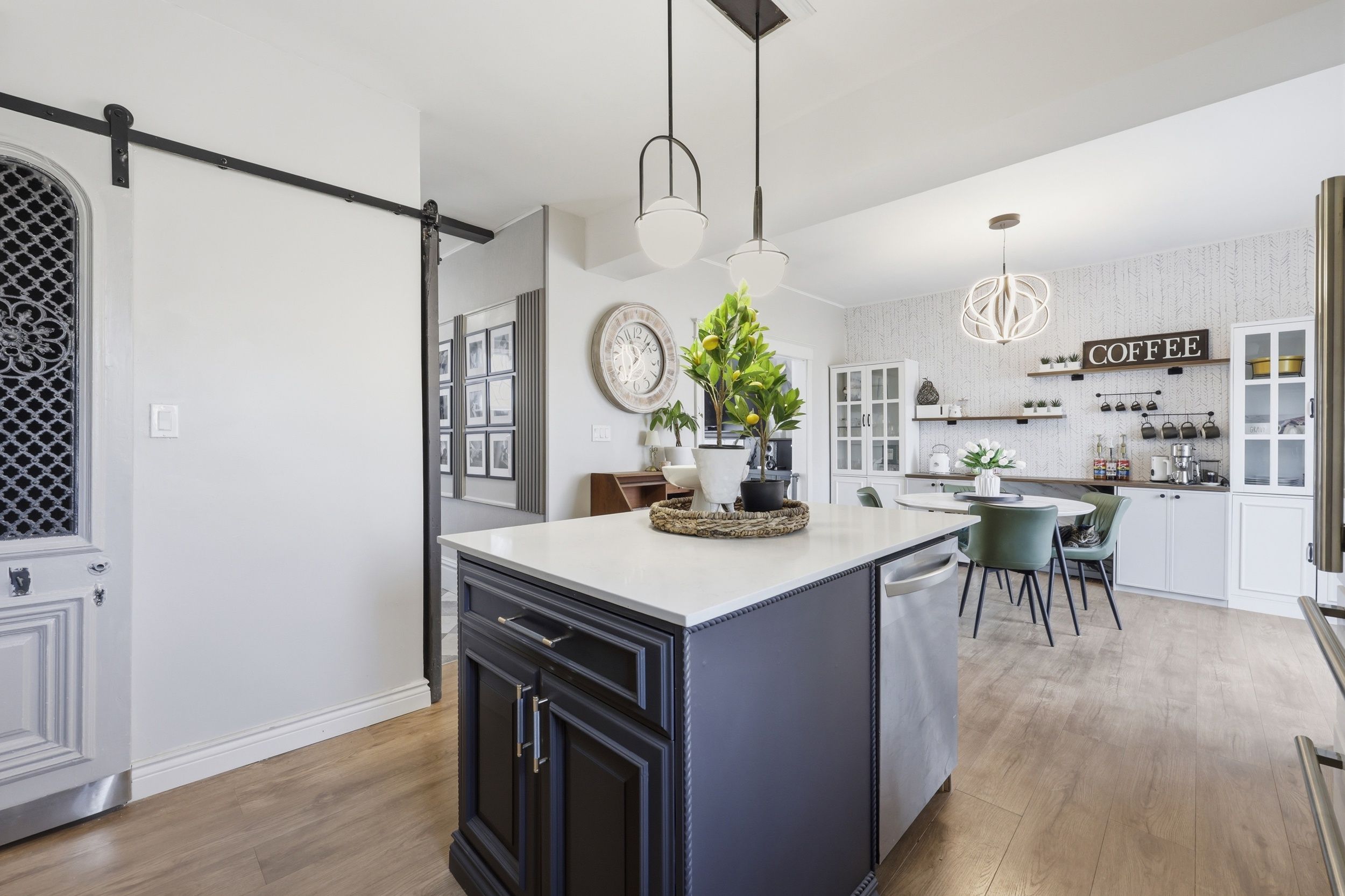 Experience the perfect fusion of 1899 character and modern design in this solid-brick victorian located in the sought-after blakeley neighborhood. The home opens with a striking checkered foyer leading into a sophisticated main floor, anchored by a living room featuring a sleek marble-patterned fireplace surround with elegant matte-black cabinets on either side. The heart of the home is the chef's kitchen, boasting premium white appliances, a navy center island with quartz counters, and custom cabinetry with stylish rattan inserts. This space flows seamlessly into a dedicated coffee bar and a sun-drenched dining area with sliding door access to the rear deck. Upstairs, the primary retreat offers a boutique atmosphere with custom wall paneling and gold sconce lighting. The spa-inspired bathroom is a true showstopper, featuring a freestanding soaking tub, a massive black-framed glass shower, and a double vanity set against a marble-veined feature wall. The outdoor oasis is designed for entertaining, featuring a multi-tier deck that leads to a private hot tub under a modern black pergola, all framed by custom planters and designer privacy fencing. This move-in-ready masterpiece offers a luxury lifestyle just steps from gage park and hamilton's best local amenities.