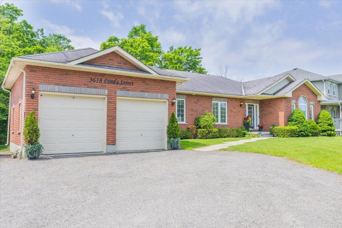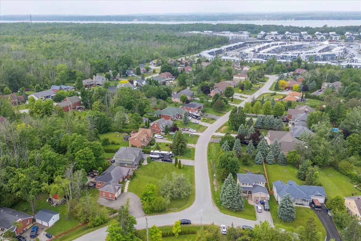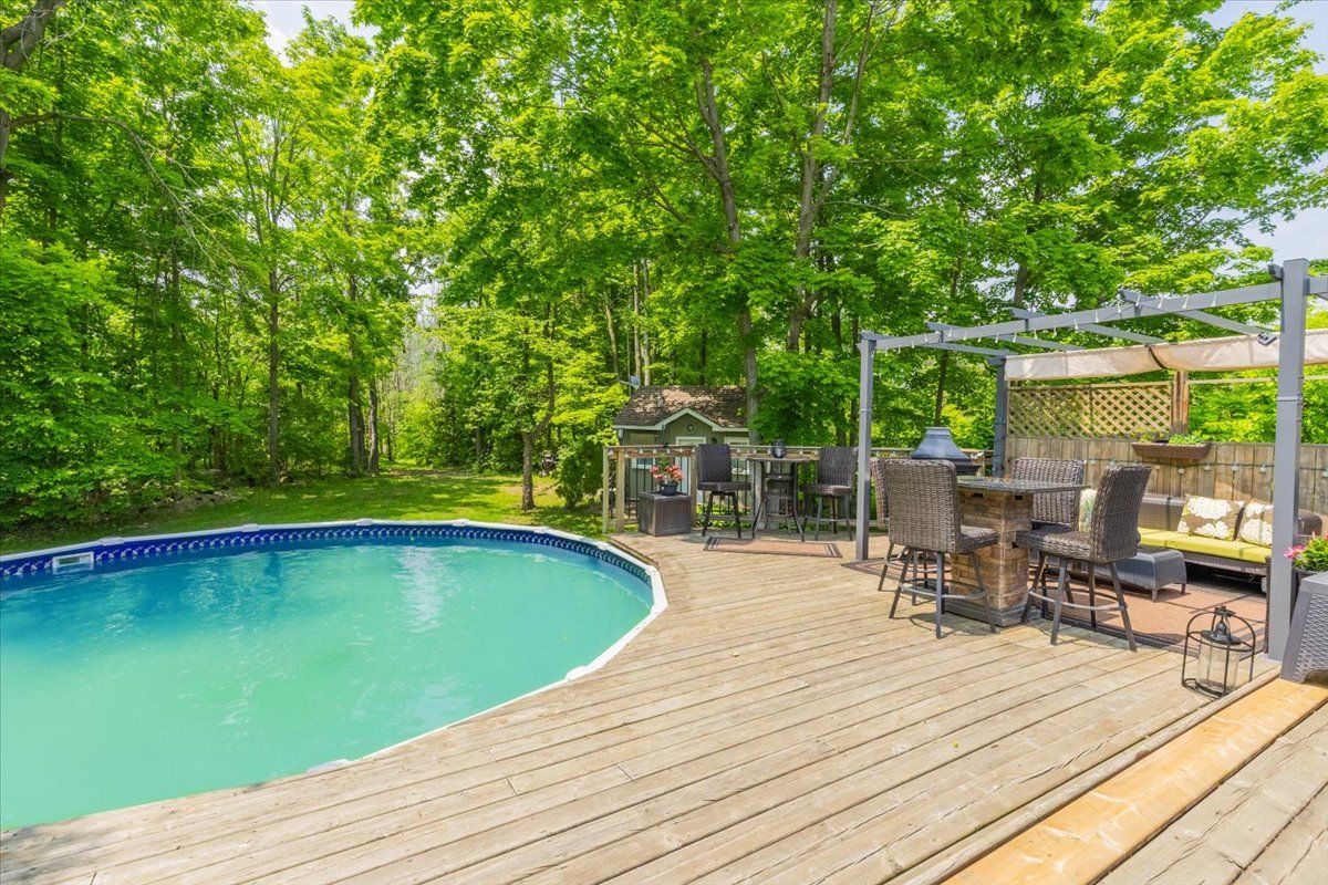 Beautiful all brick ranch bungalow steps from the shores of lake simcoe! Set on a private, treed corner lot backing onto forest, this a. N. T. Built home offers a peaceful retreat with space, style, and endless potential. Boasting 1,859 sqft the bright main level is highlighted by 9-foot ceilings, elegant crown moulding, and pot lighting throughout. The open-concept living area has a custom built fireplace and is ideal for both everyday comfort and entertaining, while 3 generously sized bedrooms provide exceptional flexibility. Two primary bedrooms feature ensuite access, creating ideal accommodations for guests or multi-generational living. The heart of the home is the large eat-in kitchen, complete with granite countertops, tiled backsplash, and a sliding glass door walkout to an expansive deck-perfect for summer dining overlooking the private backyard. The extensive basement boasts oversized windows and tall ceilings, presenting a blank canvas for additional living space, recreation, or a future in-law suite. Outside, mature trees surround the property, offering a serene, cottage-like setting while backing onto green space. A landscaped yard with a 24' round above-ground heated pool on the expansive multi level deck has a gazebo and thoughtfully placed lighting to set the stage for evening gatherings. The yard is equipped with a workshop/shed with both a man door and a custom garage door for storage. Enjoy walking or biking with the public trail at the end of the road or enjoy the vibrant friday harbour resort just minutes away. Other notable features: roof (2024 and newer), a/c (2024), hot water tank (2012), smart thermostat, solar panels for pool heater mounted on roof, 200 amp electrical panel. This home is a rare opportunity to enjoy space, privacy, and the outdoors with a close proximity to the lake!