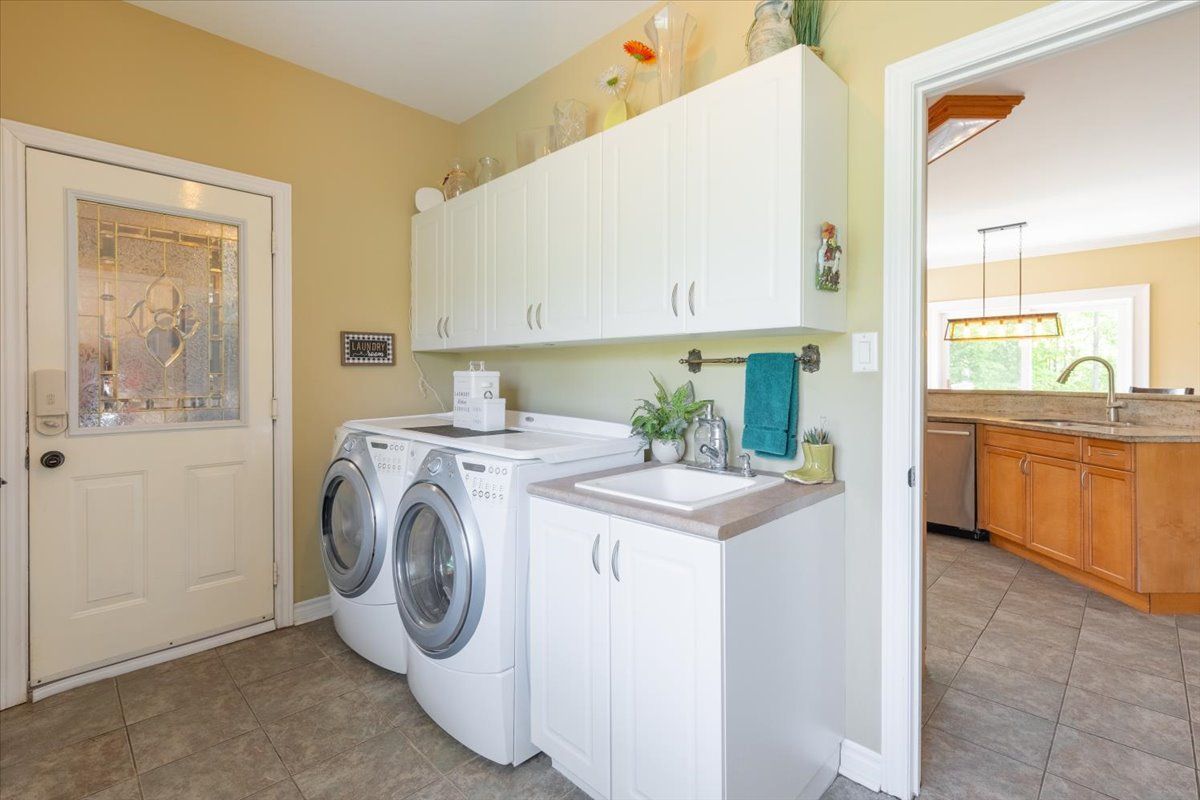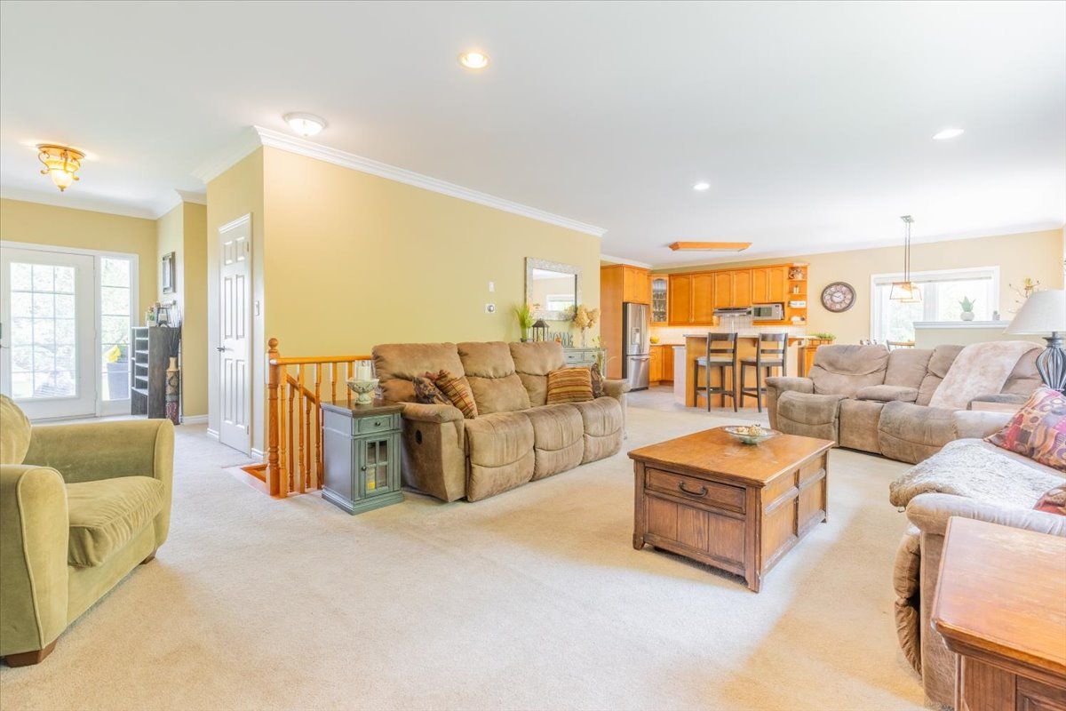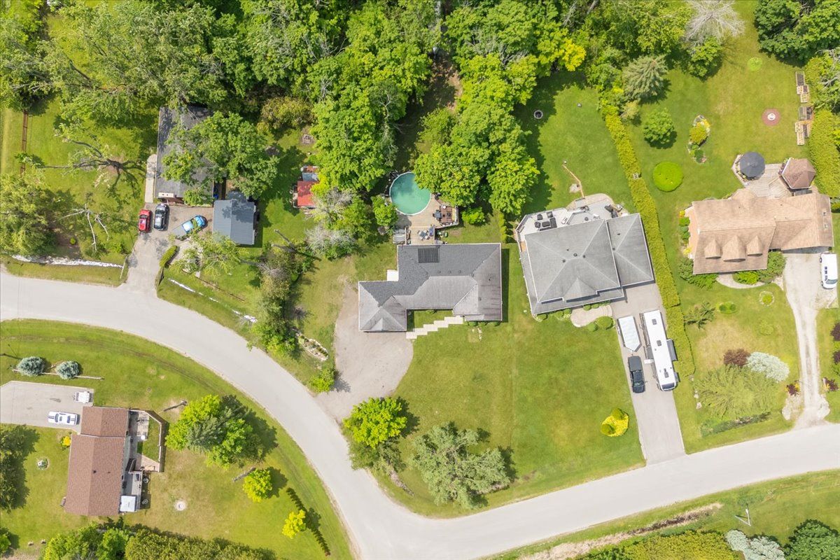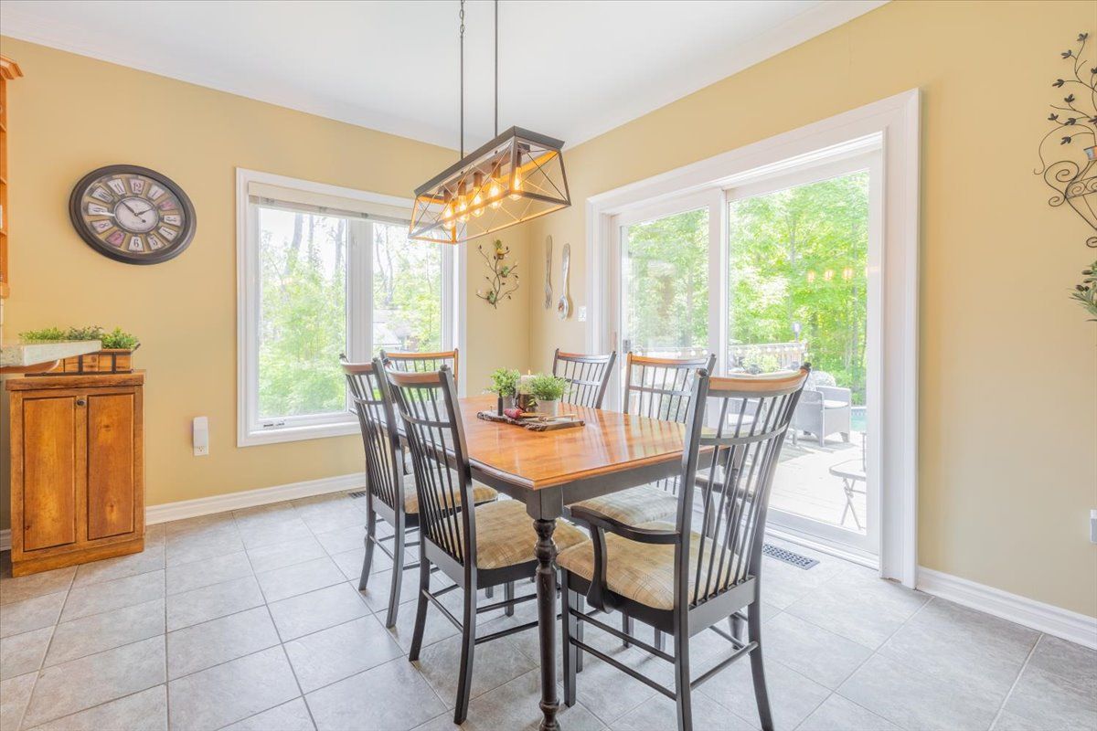 Beautiful all brick ranch bungalow steps from the shores of lake simcoe! Set on a private, treed corner lot backing onto forest, this a. N. T. Built home offers a peaceful retreat with space, style, and endless potential. Boasting 1,859 sqft the bright main level is highlighted by 9-foot ceilings, elegant crown moulding, and pot lighting throughout. The open-concept living area has a custom built fireplace and is ideal for both everyday comfort and entertaining, while 3 generously sized bedrooms provide exceptional flexibility. Two primary bedrooms feature ensuite access, creating ideal accommodations for guests or multi-generational living. The heart of the home is the large eat-in kitchen, complete with granite countertops, tiled backsplash, and a sliding glass door walkout to an expansive deck-perfect for summer dining overlooking the private backyard. The extensive basement boasts oversized windows and tall ceilings, presenting a blank canvas for additional living space, recreation, or a future in-law suite. Outside, mature trees surround the property, offering a serene, cottage-like setting while backing onto green space. A landscaped yard with a 24' round above-ground heated pool on the expansive multi level deck has a gazebo and thoughtfully placed lighting to set the stage for evening gatherings. The yard is equipped with a workshop/shed with both a man door and a custom garage door for storage. Enjoy walking or biking with the public trail at the end of the road or enjoy the vibrant friday harbour resort just minutes away. Other notable features: roof (2024 and newer), a/c (2024), hot water tank (2012), smart thermostat, solar panels for pool heater mounted on roof, 200 amp electrical panel. This home is a rare opportunity to enjoy space, privacy, and the outdoors with a close proximity to the lake!