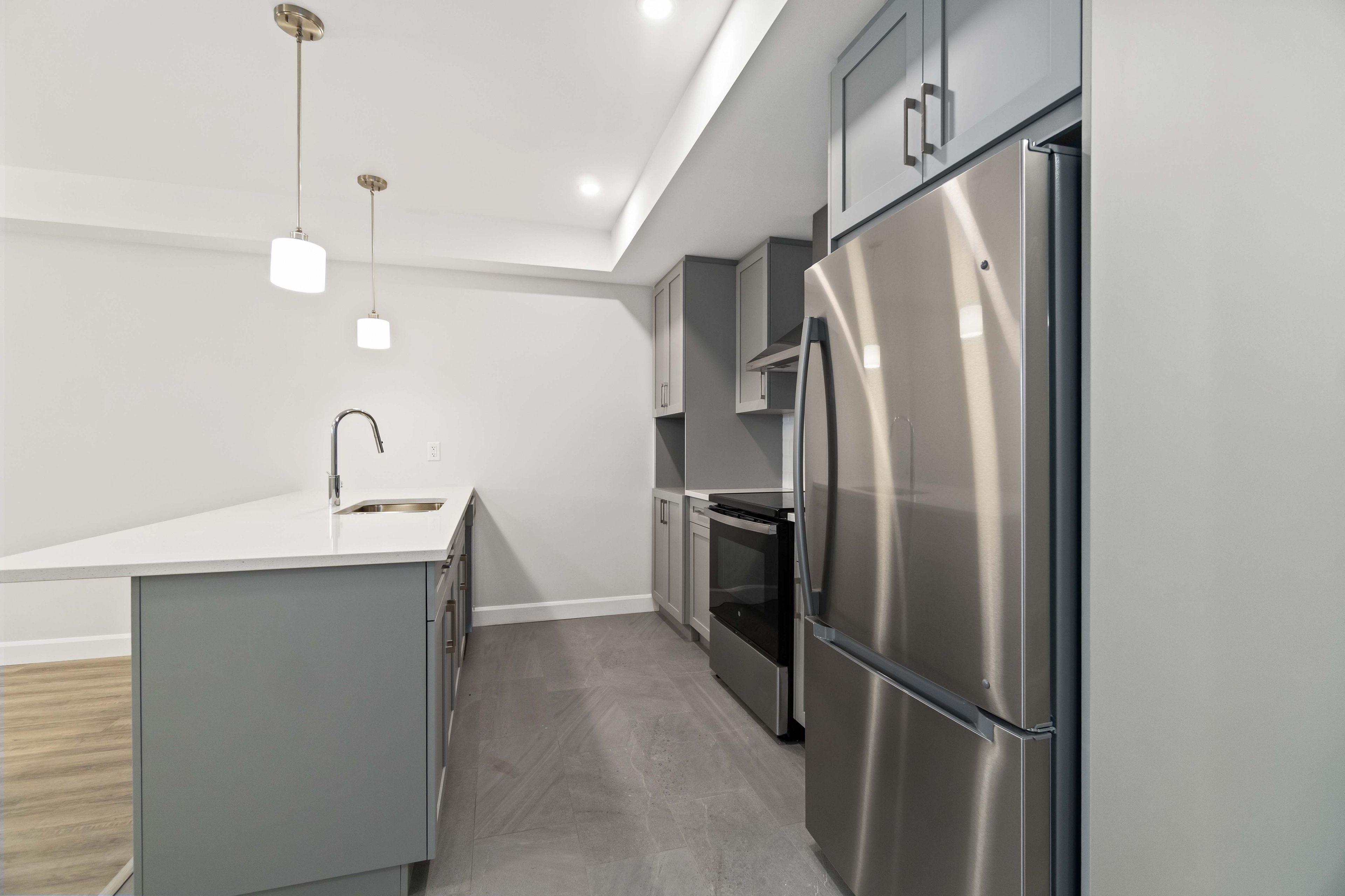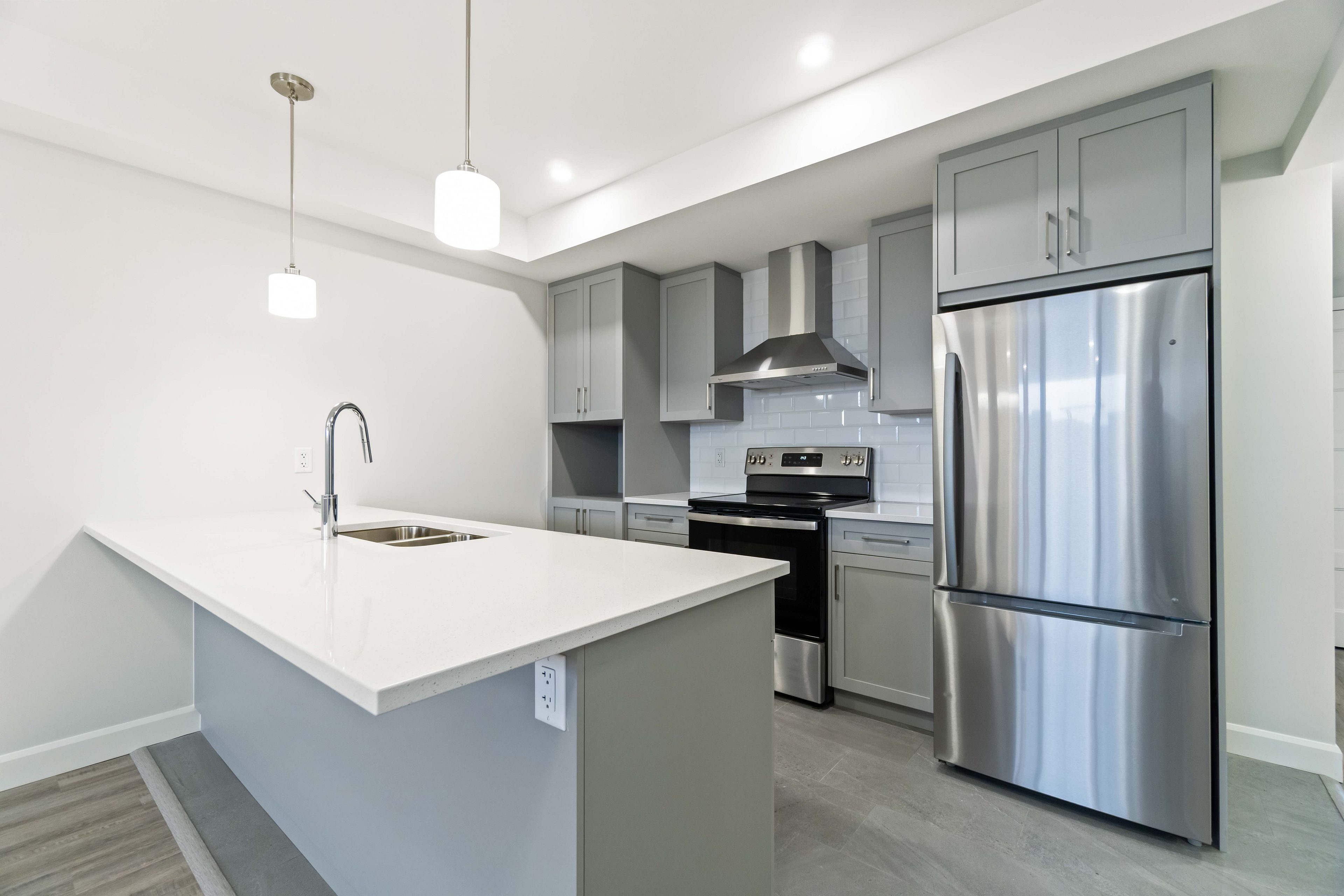 • Modern kitchen with quartz countertops and brand-new stainless-steel appliances.