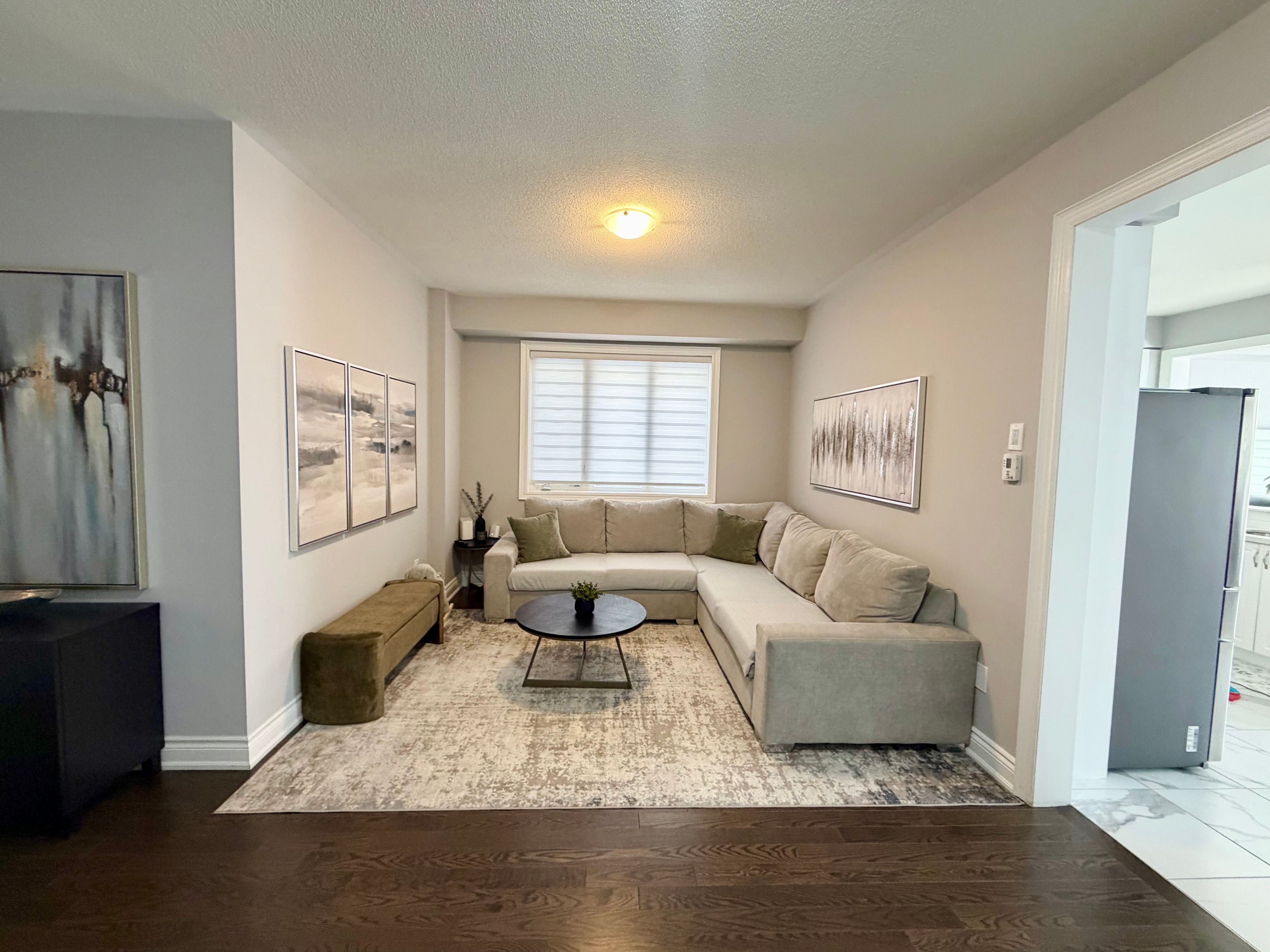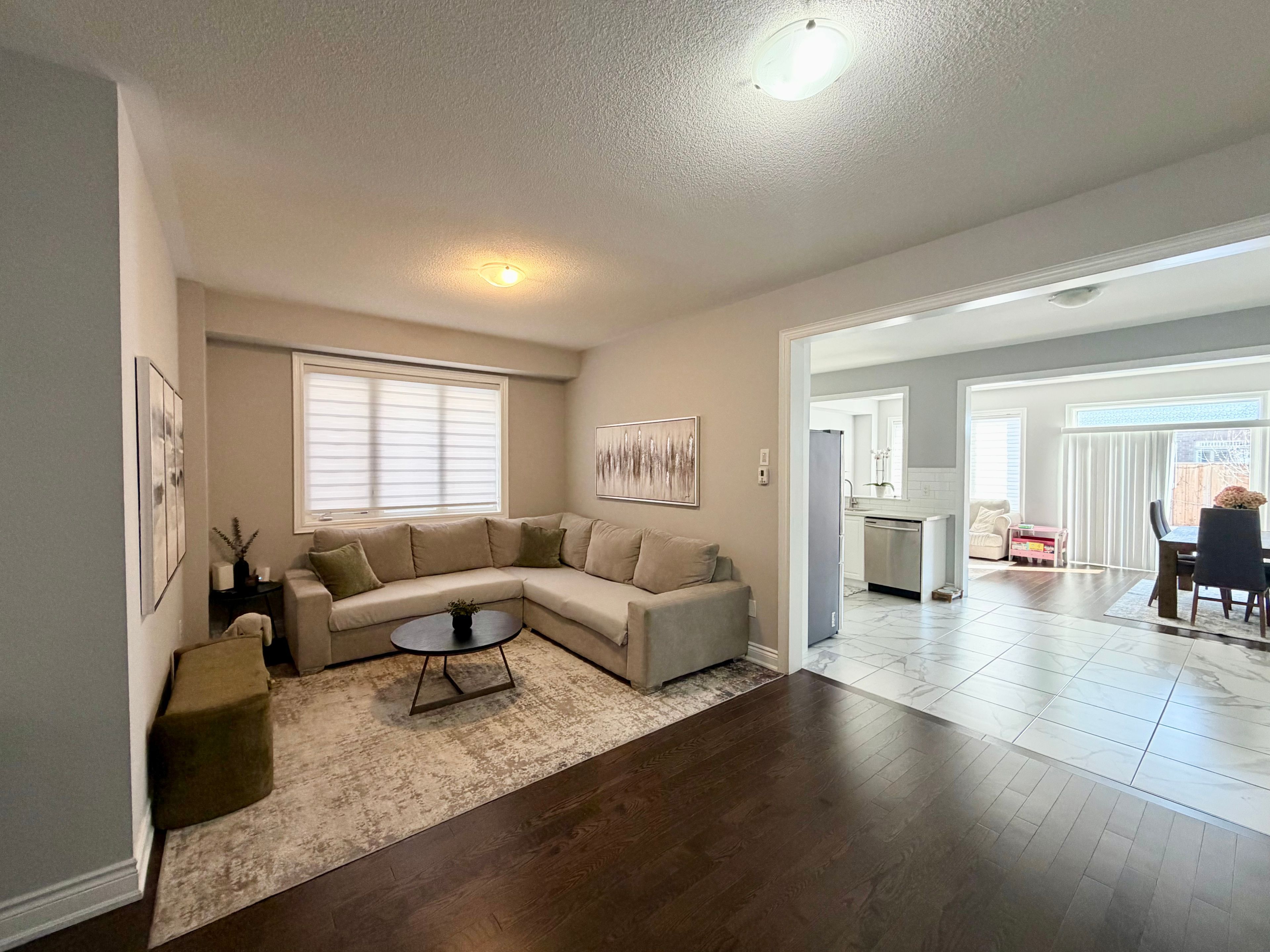 This spacious semi-detached home in the cedarwood community offers over 2,500 sq ft of well-designed living space, featuring 9-ft ceilings on the main level. The modern kitchen is equipped with stainless steel appliances and granite countertops. Hardwood flooring runs throughout the main and second floors, complemented by an elegant oak staircase. Located just steps to costco, armadale square, home depot, sunny foodmart, banks, top-rated schools, and a nearby golf and country club. Enjoy quick and easy access to hwy 407.