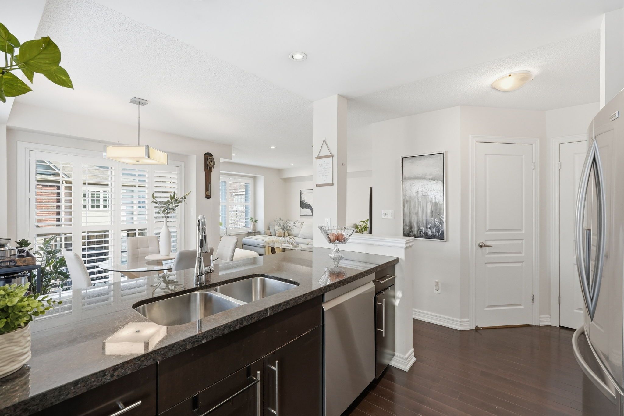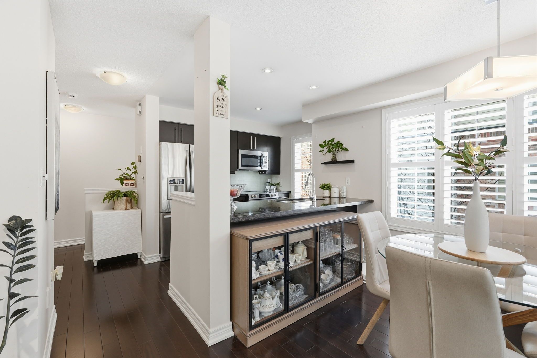 Welcome welcome to stylish, low-maintenance living in this beautifully maintained 3-storey end unit townhome in burlington's sought-after mosaic community. Offering approximately 1,425 sq ft, this bright and spacious home is ideal for first-time buyers, professionals, and commuters looking for comfort and convenience. The open-concept second level is designed for everyday living and entertaining, featuring hardwood floors, pot lights, and a modern kitchen with upgraded granite countertops, stainless steel appliances, and breakfast bar seating. The kitchen is further enhanced with brand-new 2026 stove and microwave, along with custom closet by design built-ins in the pantry, providing exceptional storage and organization. Large windows with california shutters fill the space with natural light. Upstairs, the home offers three well-sized bedrooms featuring closet by design custom built-ins, maximizing functionality and style. The comfortable primary retreat includes an updated ensuite with a glass shower and jet shower head. New laminate flooring on the first and third floors adds a fresh, modern touch throughout. Additional highlights include stainless steel appliances, a new furnace, in-suite laundry with lg thinq washer and dryer, and direct access to the garage. Located in an unbeatable burlington location just minutes to aldershot go station, downtown burlington, the waterfront, parks, trails, shopping, restaurants, schools, and major highways, this home delivers the perfect balance of modern style and everyday convenience. Experience everything this fantastic home and location have to offer.
