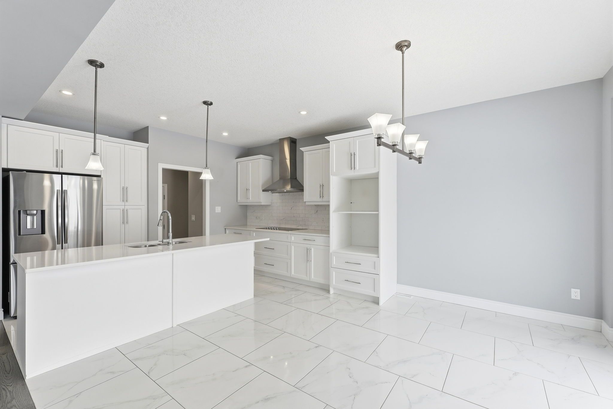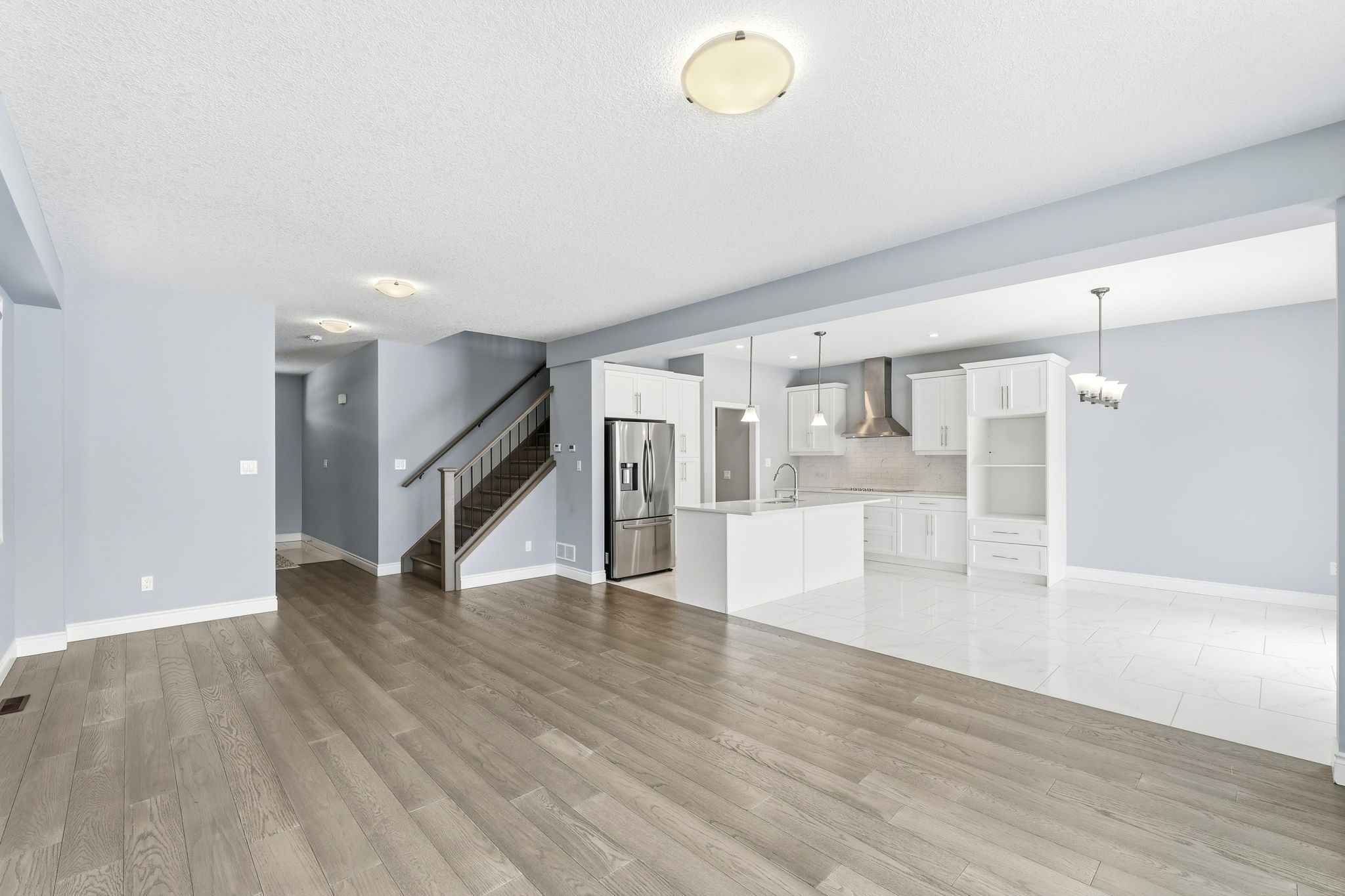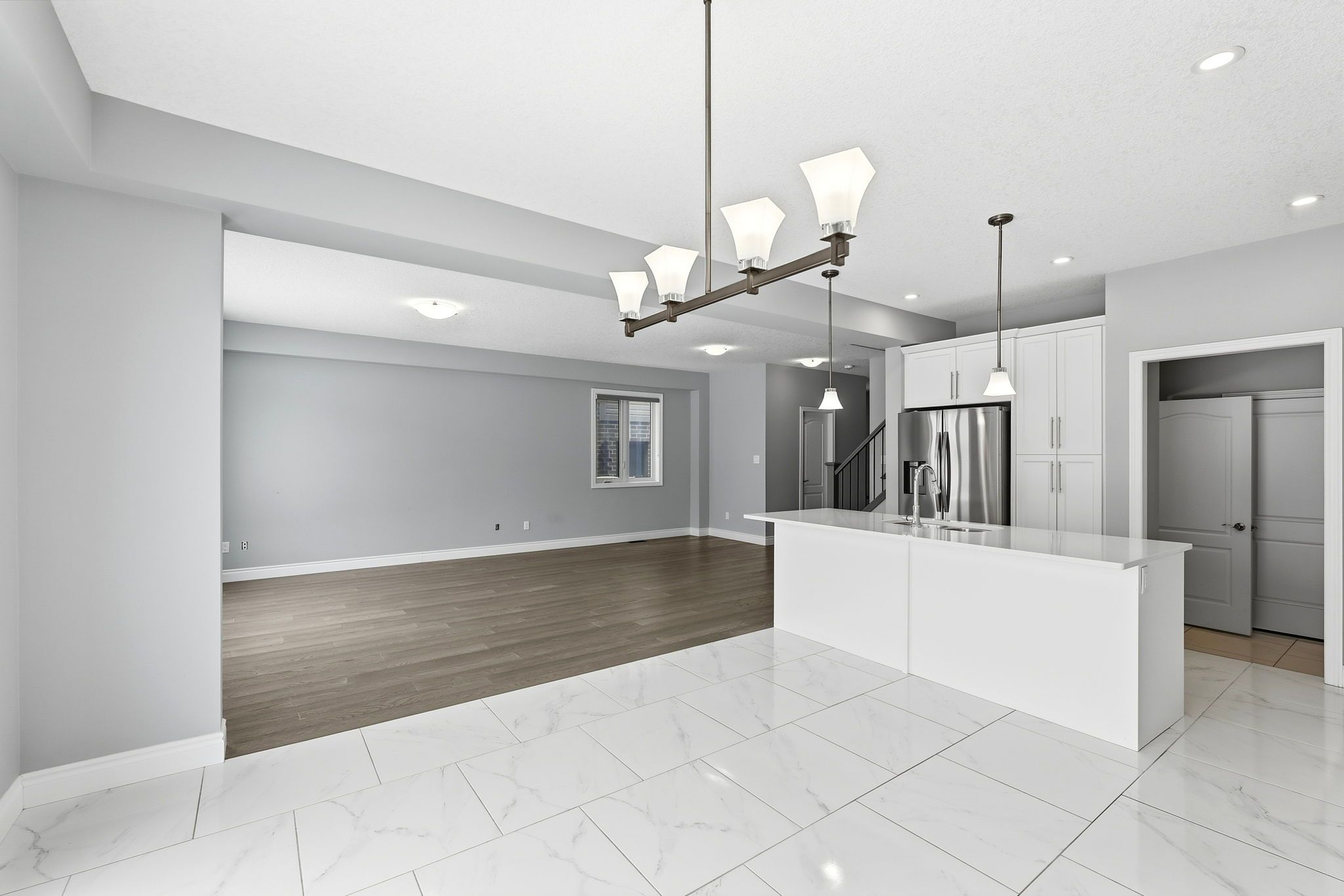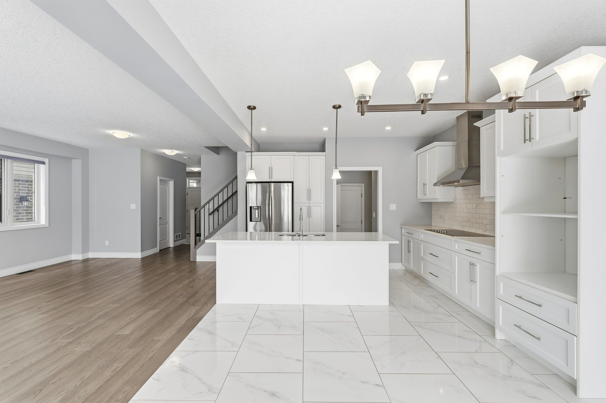 • Open-concept kitchen with granite countertops and premium stainless steel appliances.