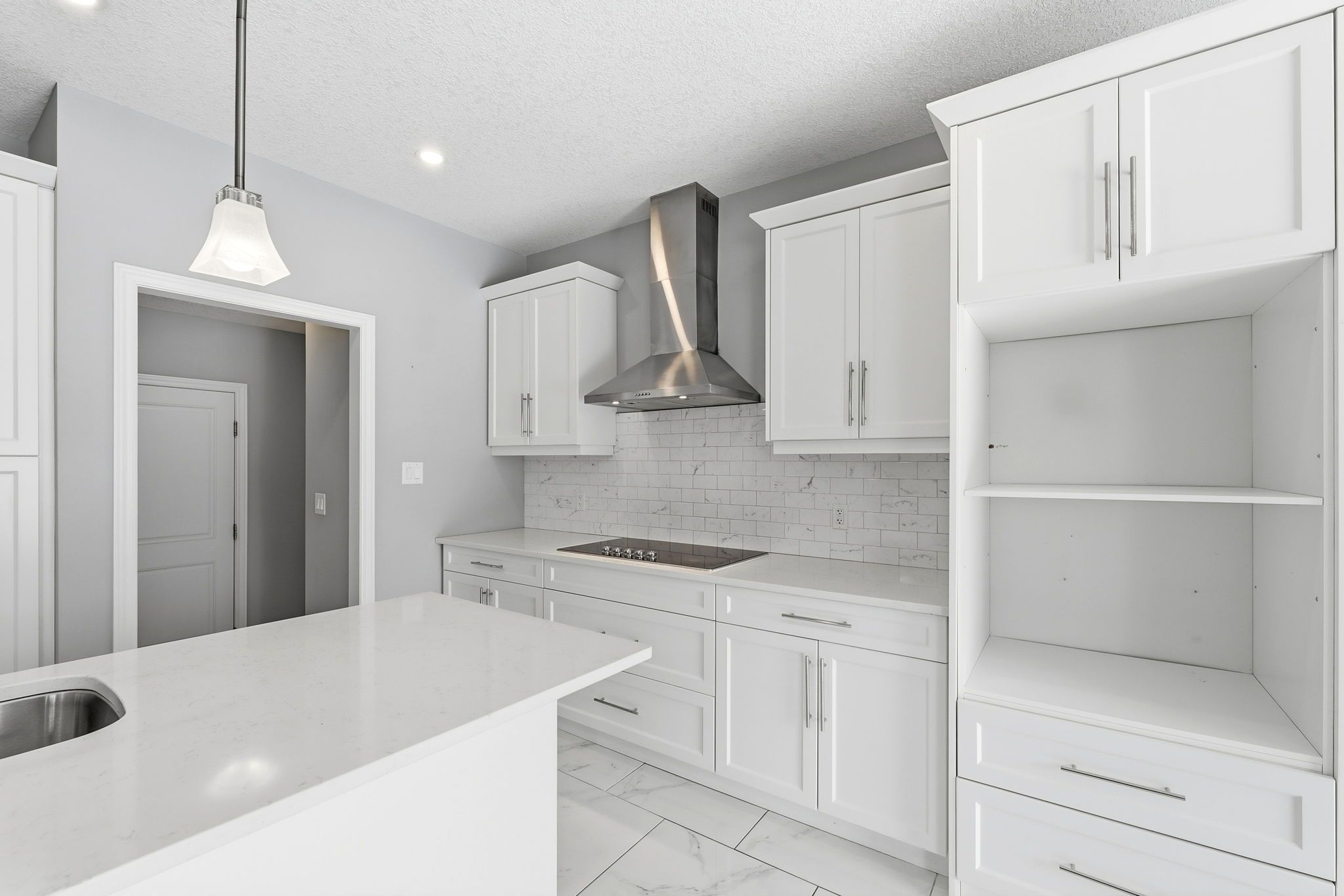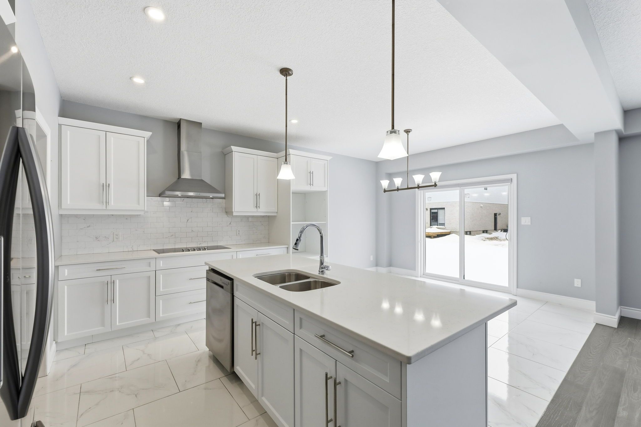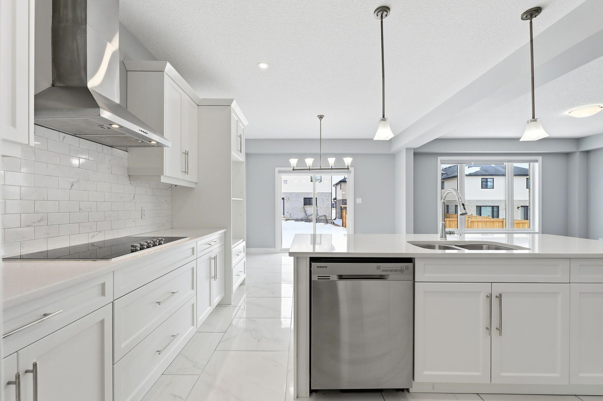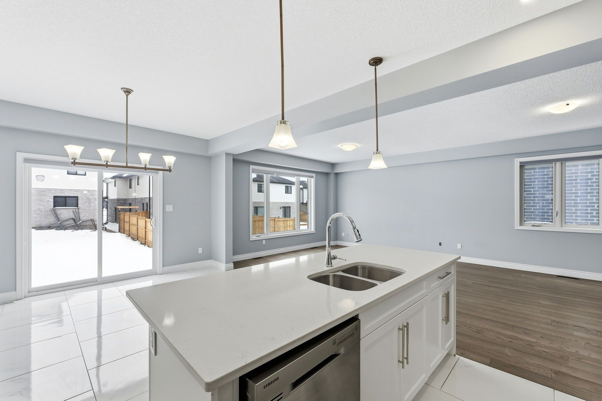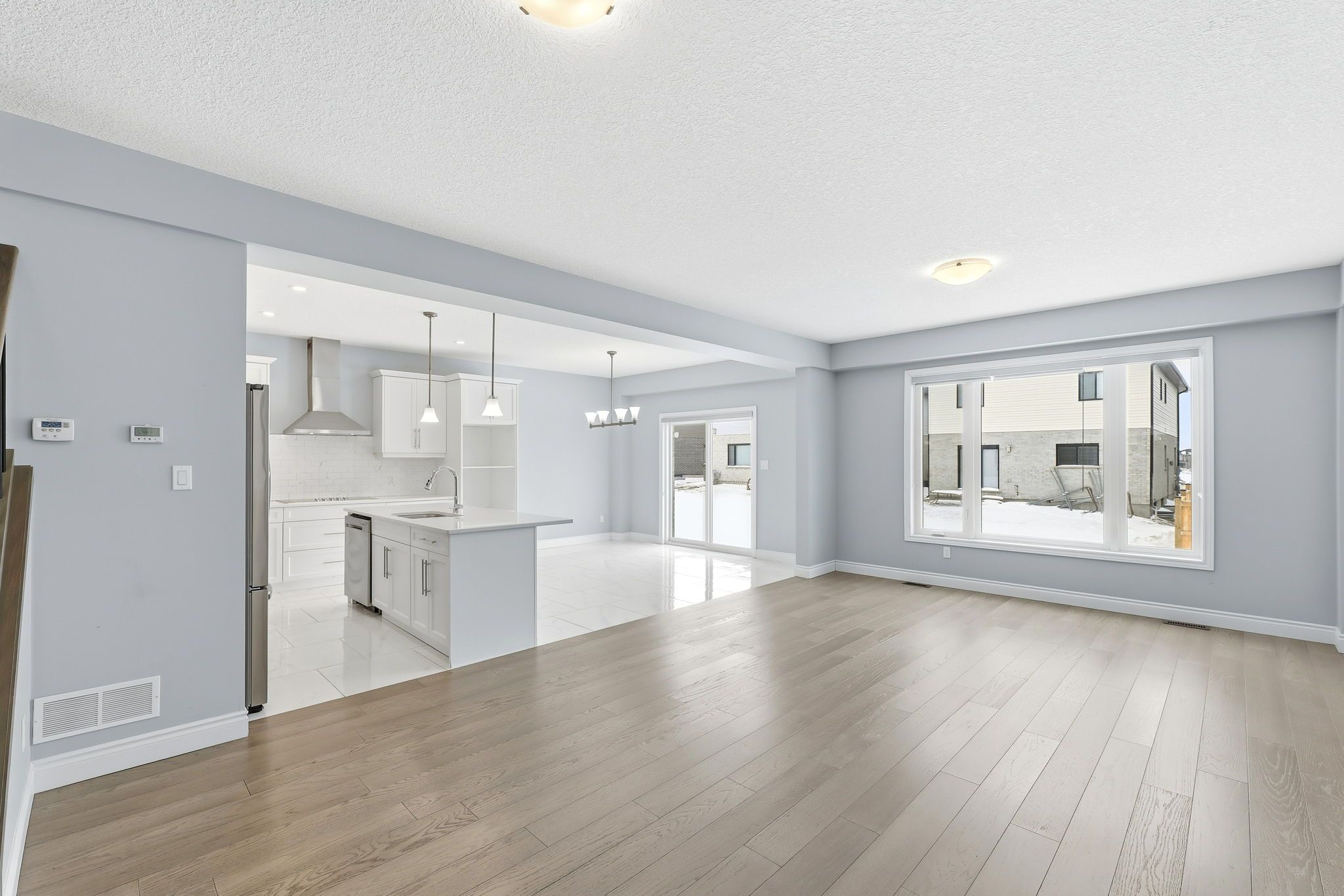 • Open-concept kitchen with granite countertops and premium stainless steel appliances.