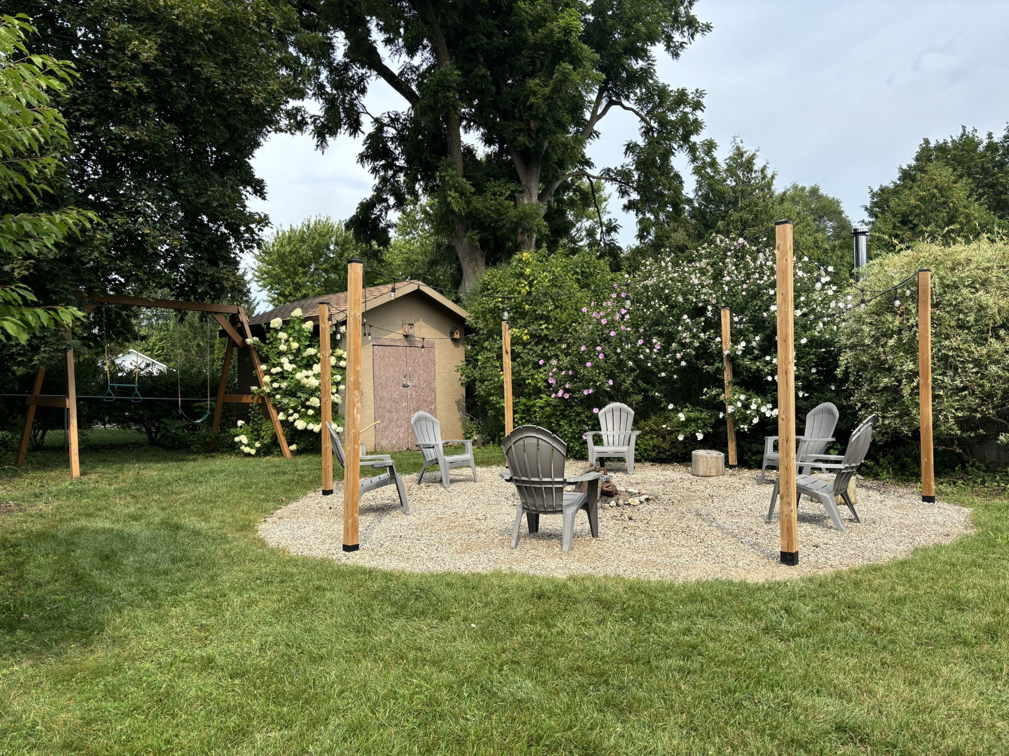 • Fully fenced backyard featuring a scenic firepit and mature trees.