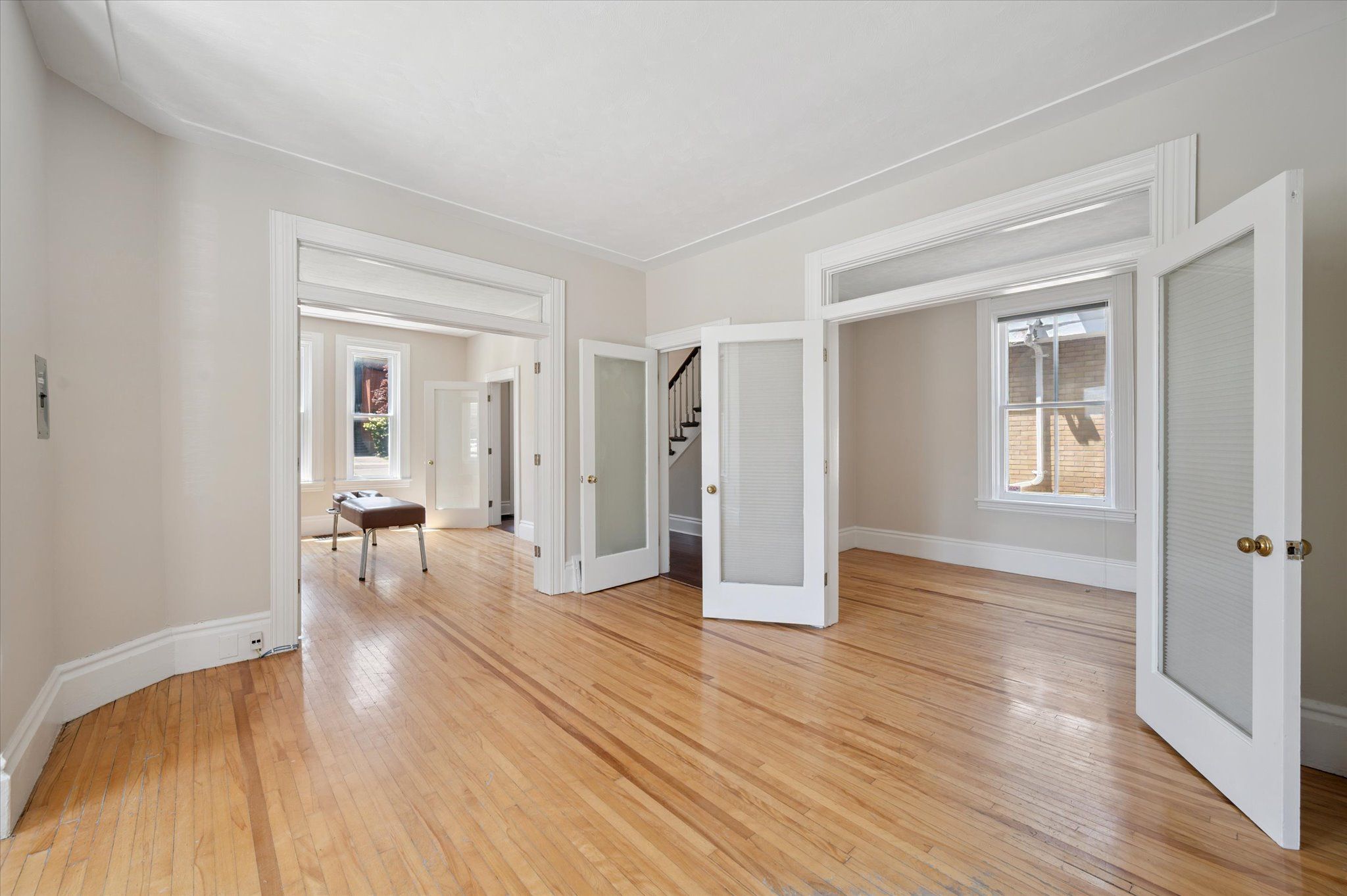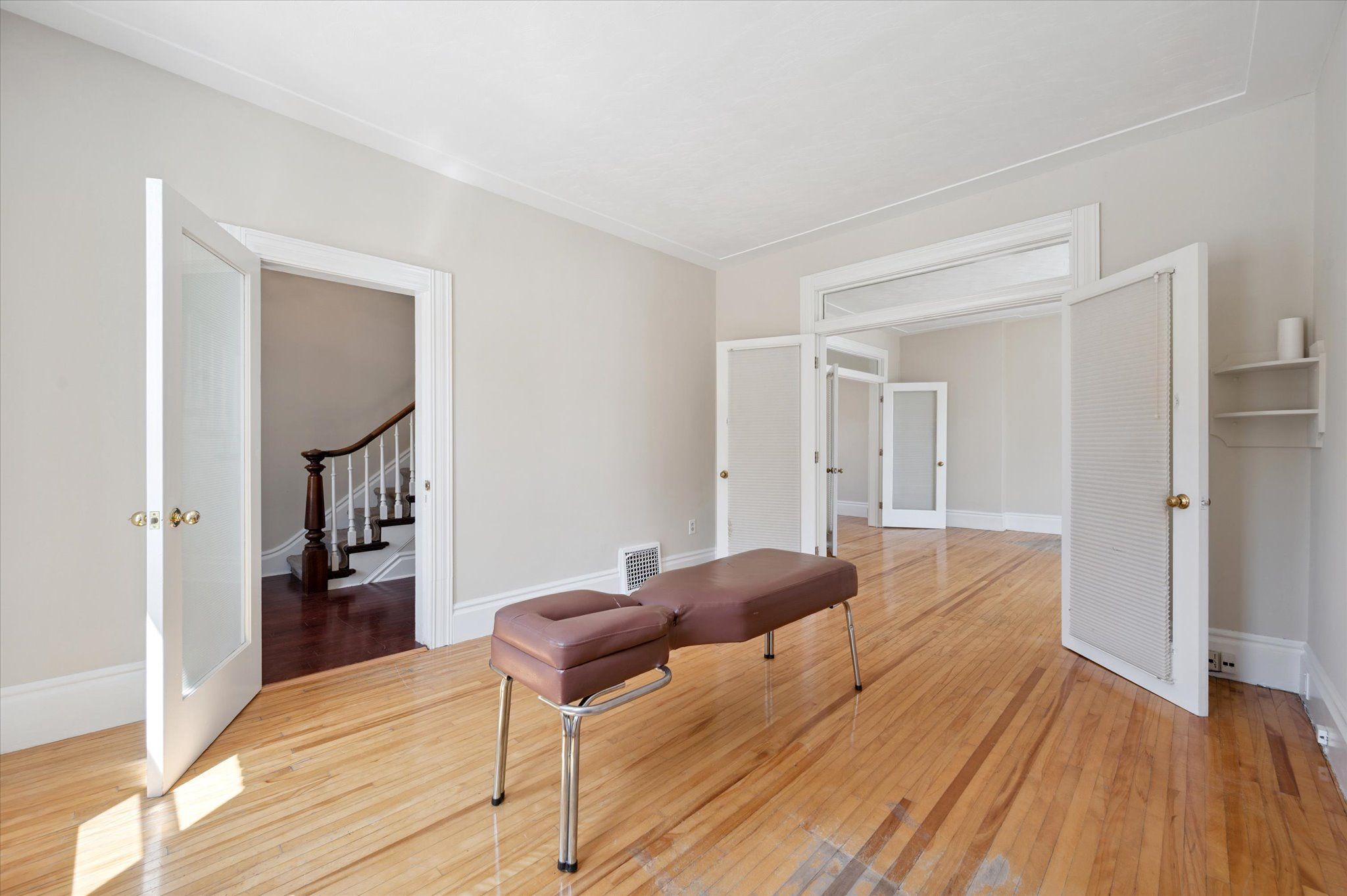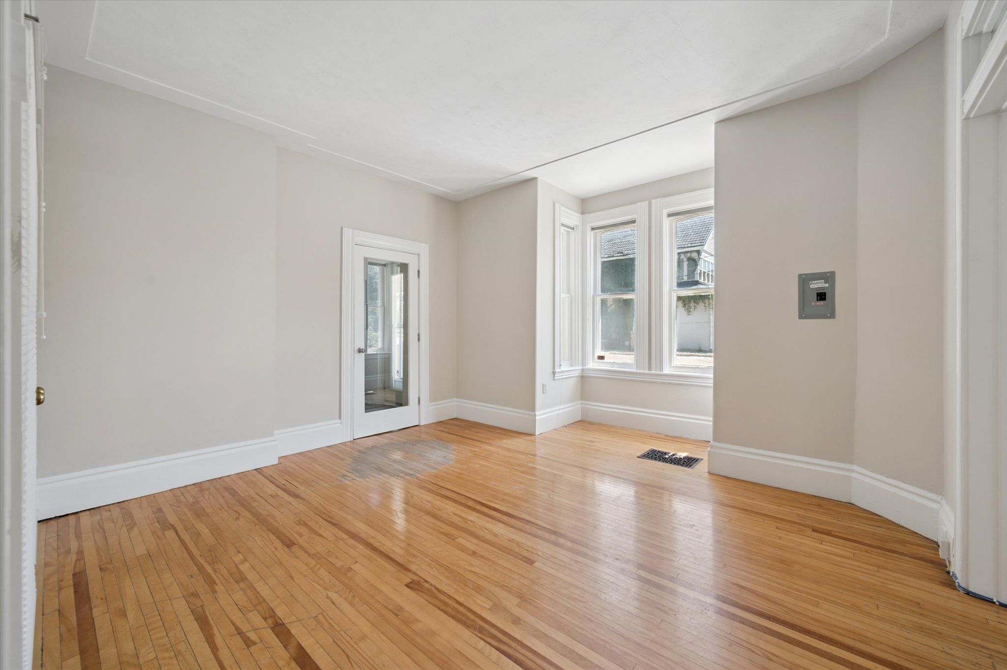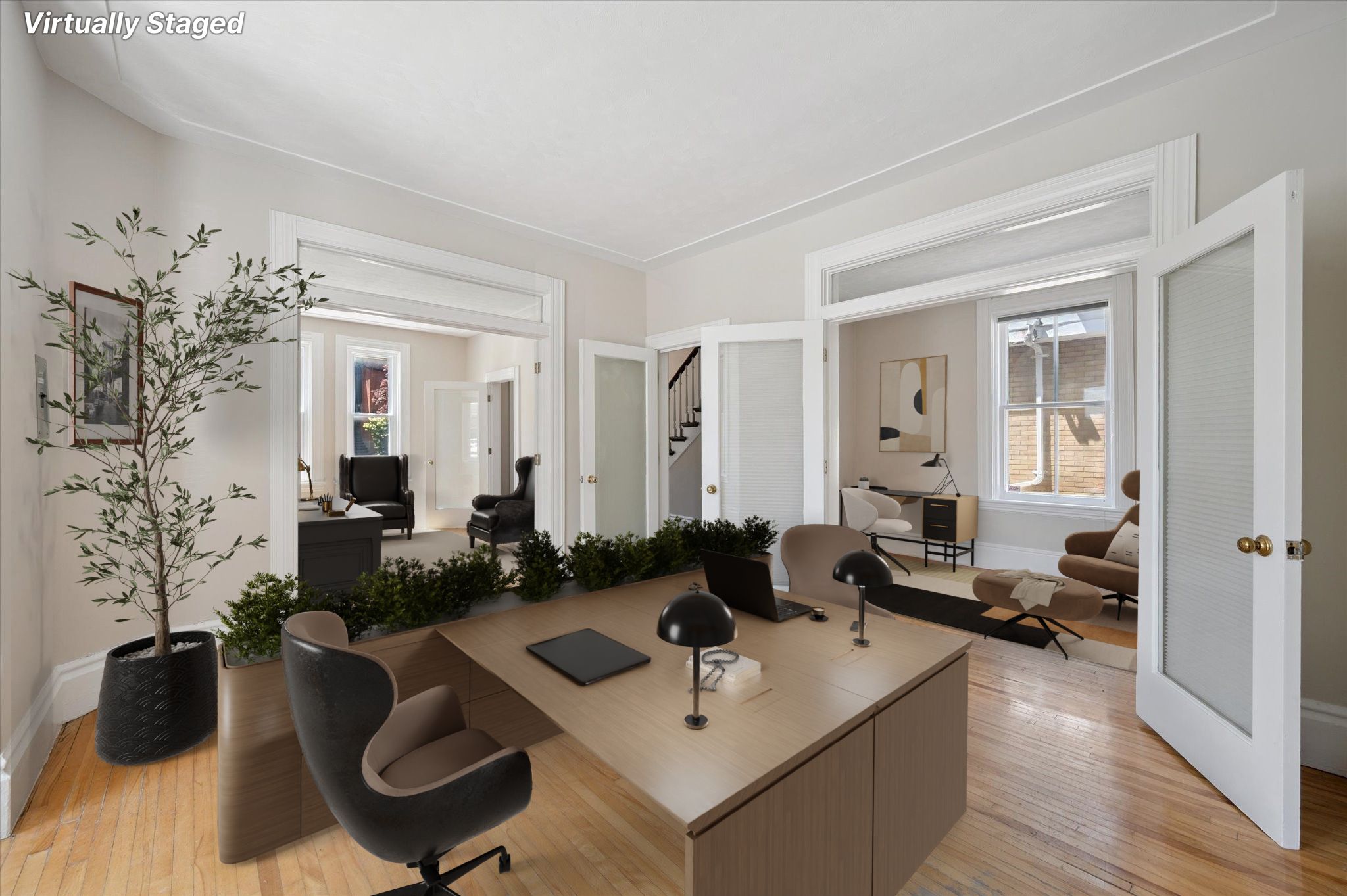 • Interior features adaptable layout with hardwood flooring and large windows.