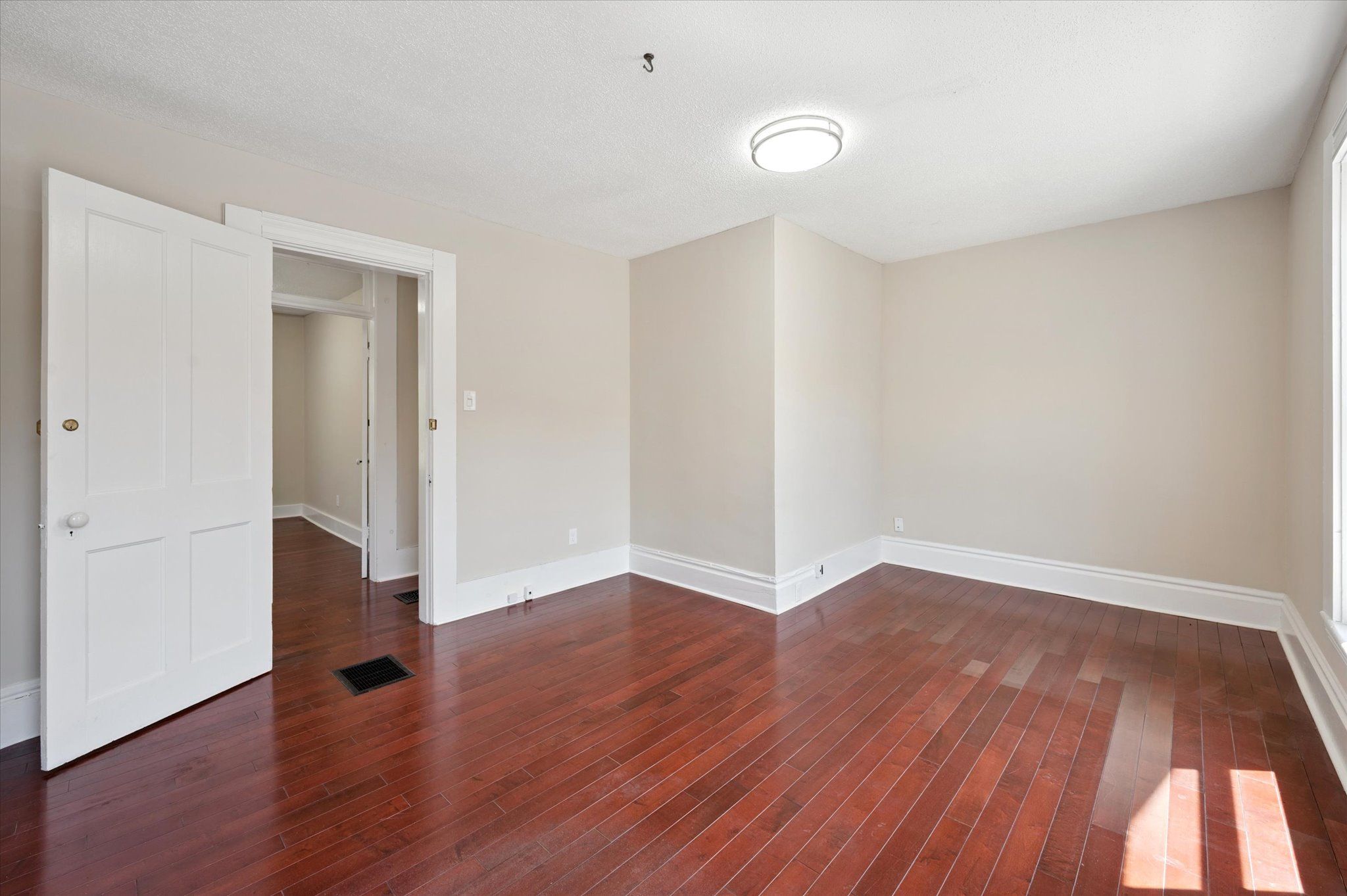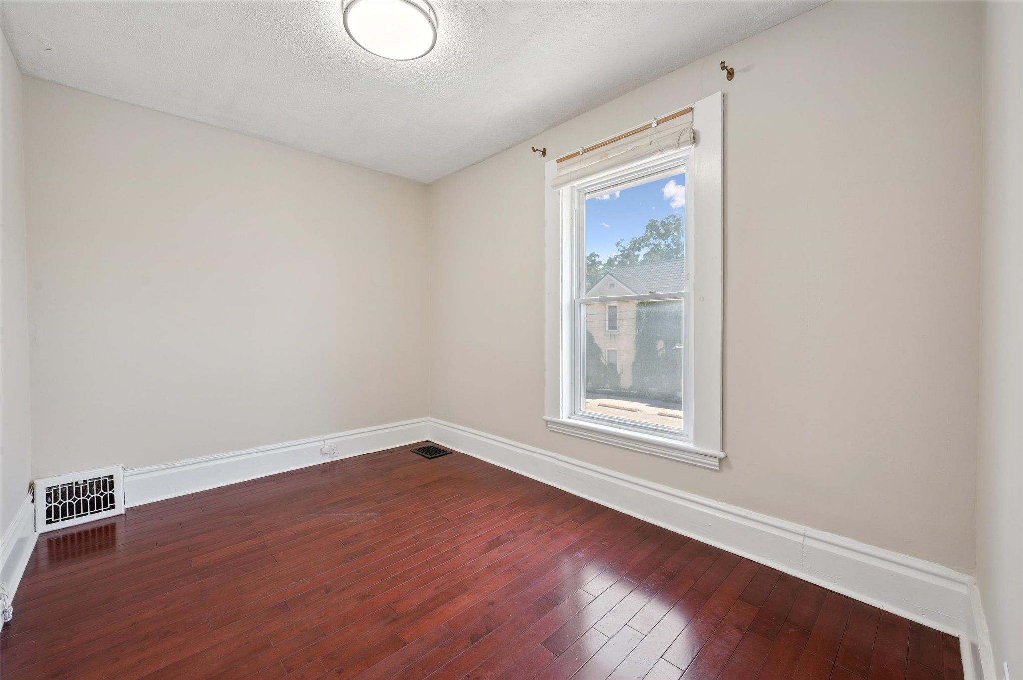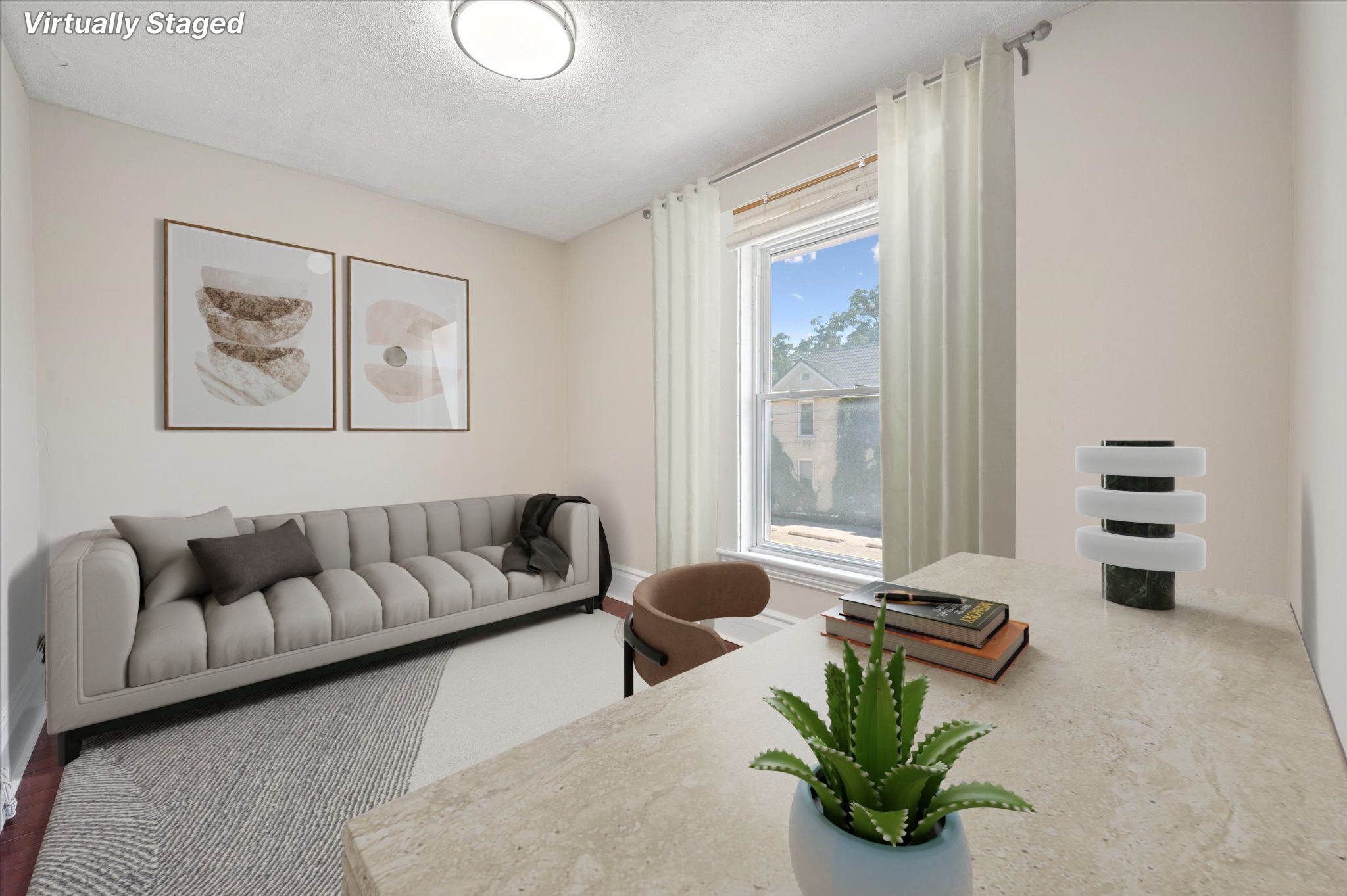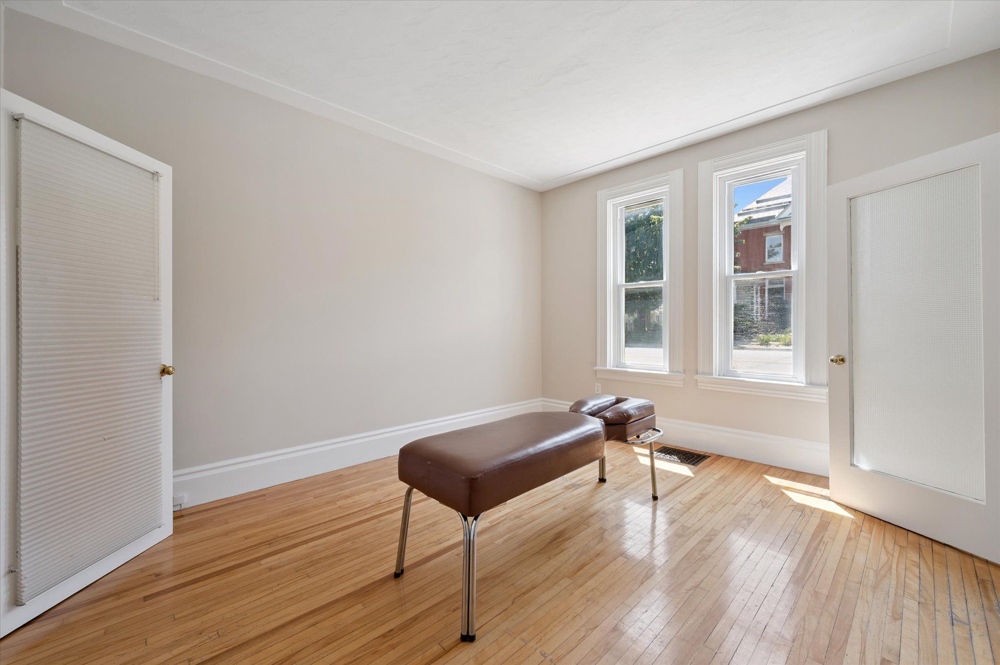• Interior features adaptable layout with hardwood flooring and large windows.