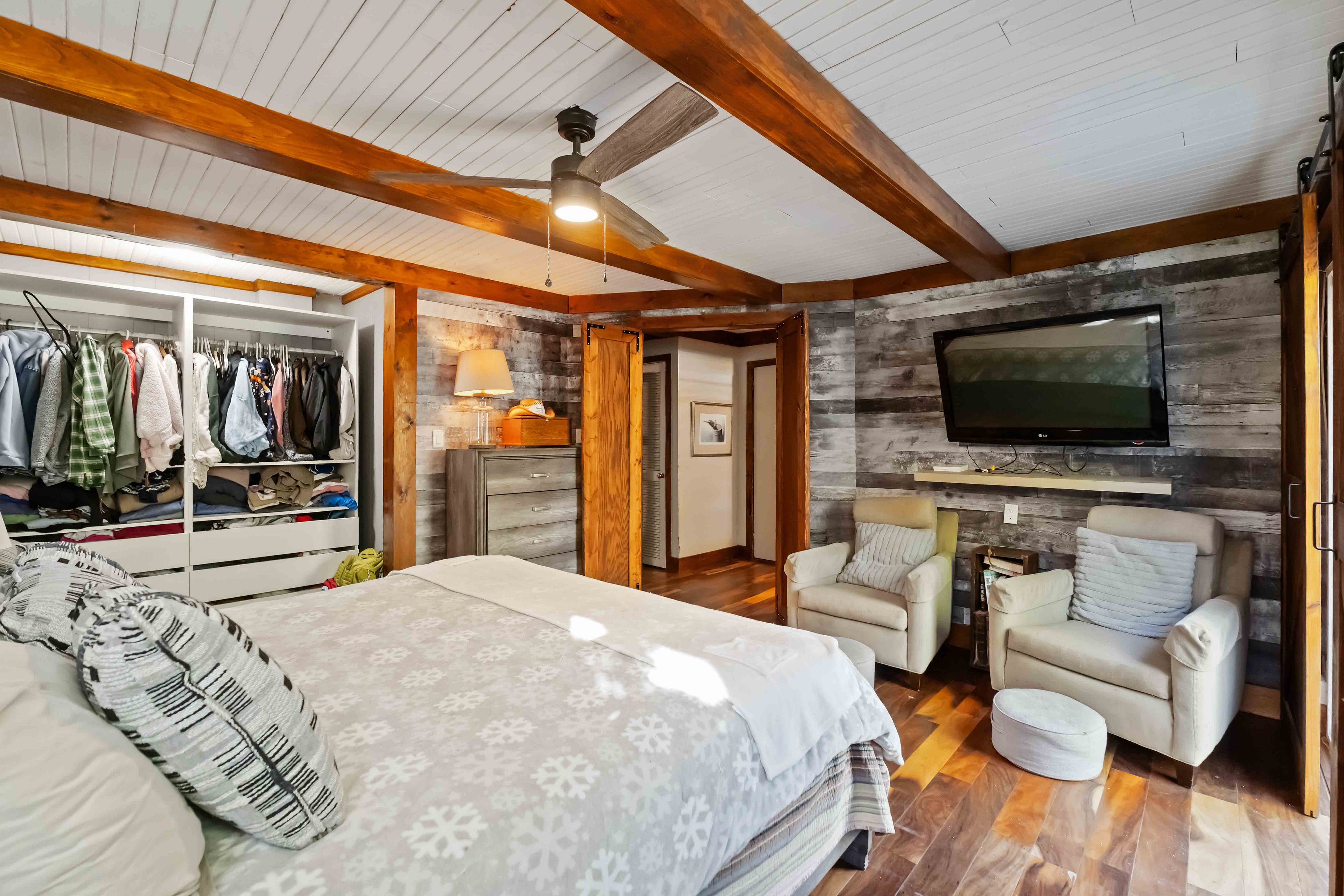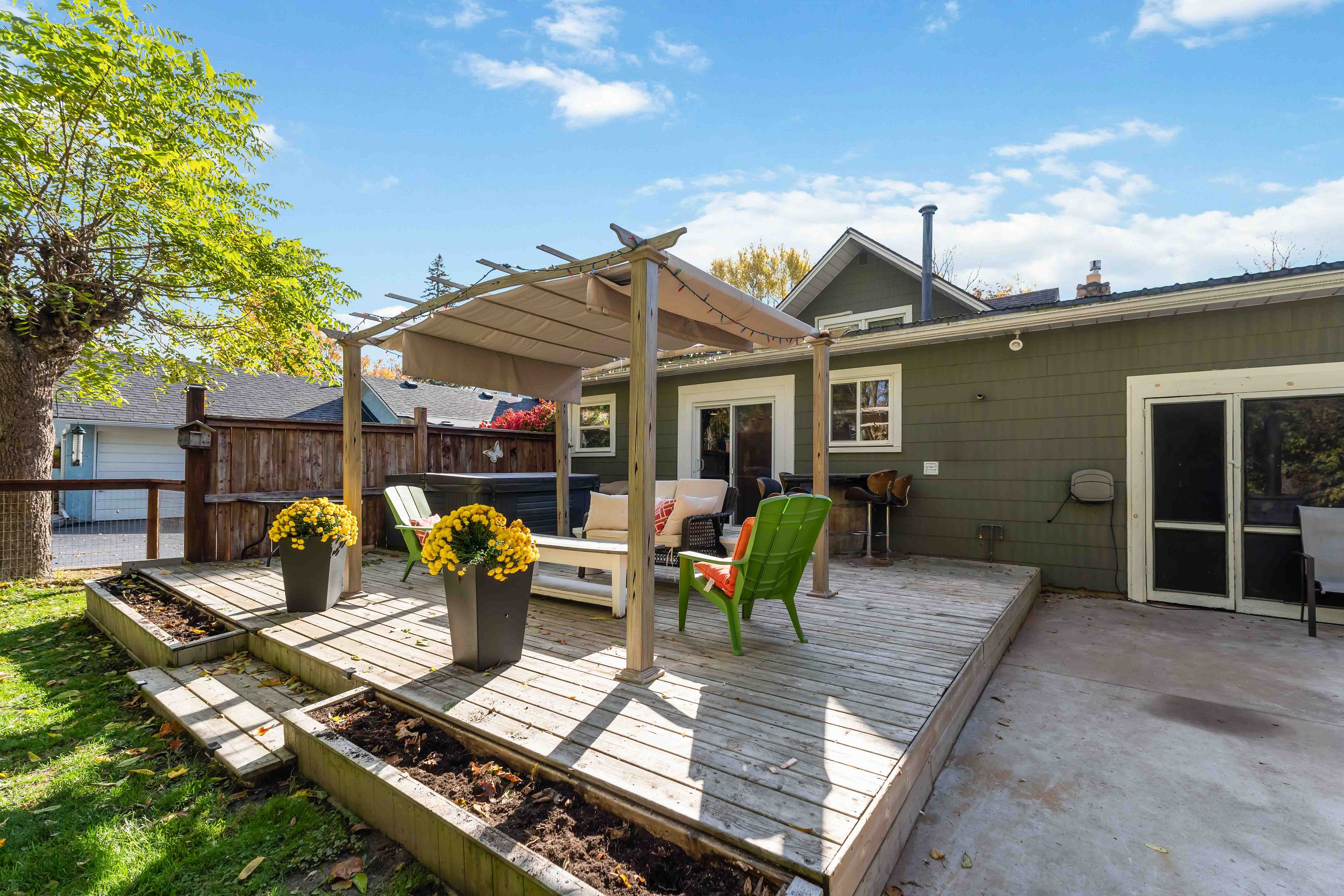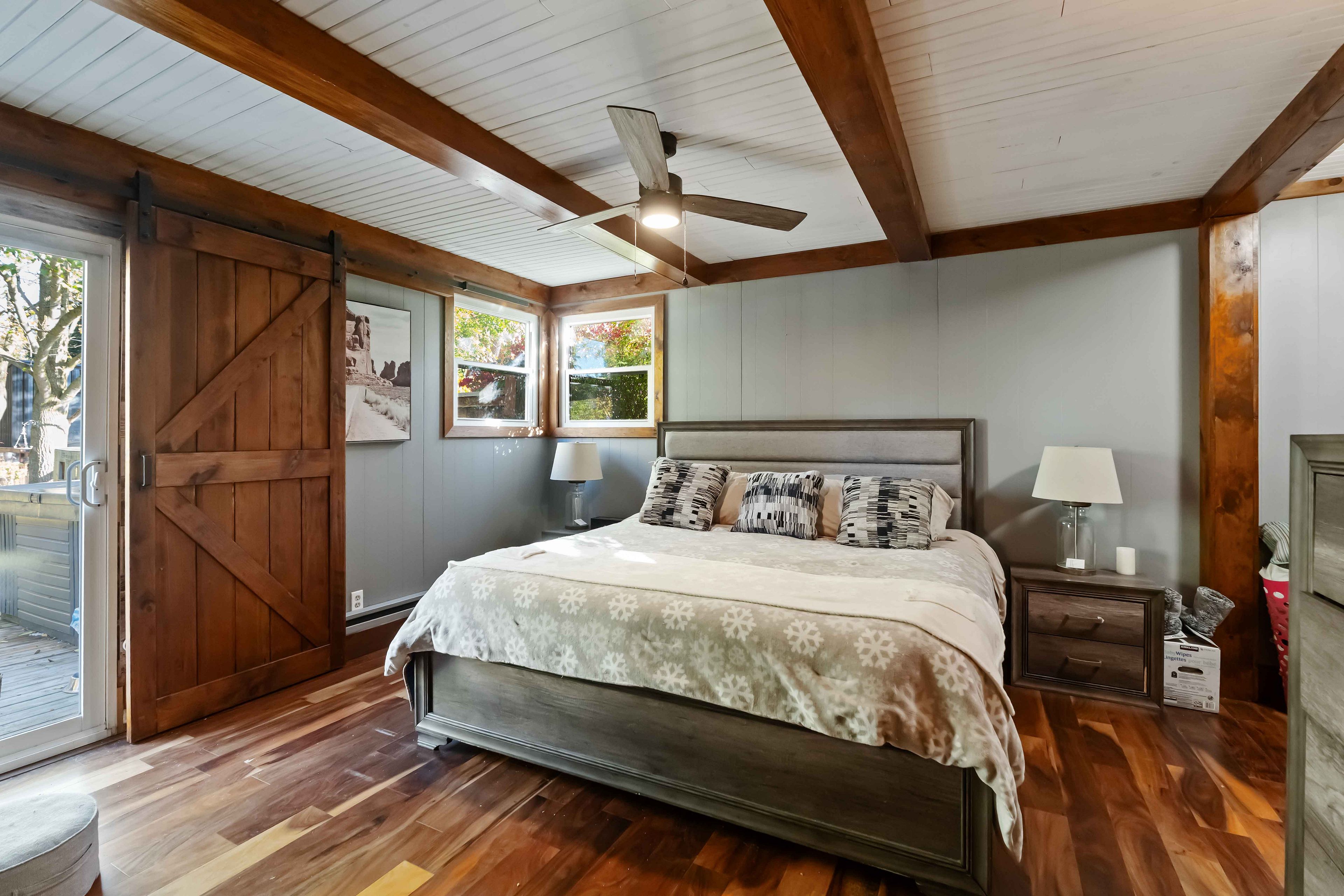 • Main-floor primary bedroom with patio doors leading to a deck and hot tub.