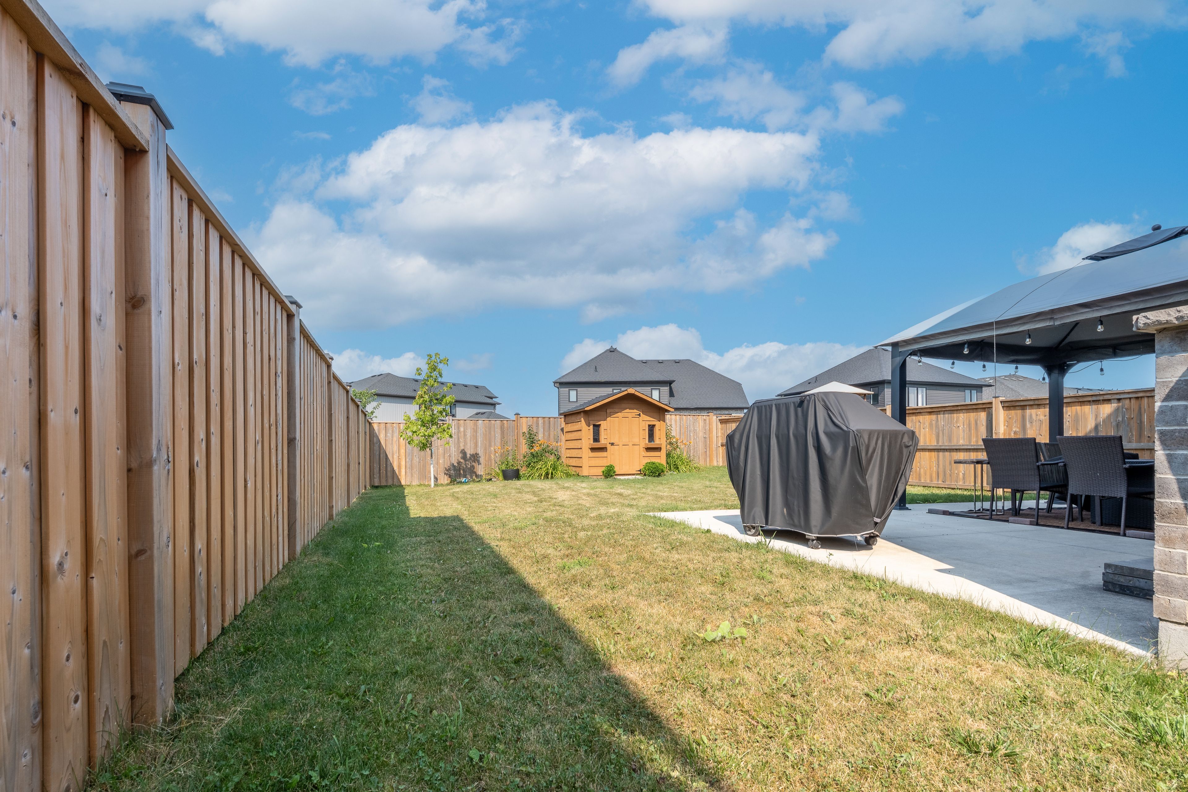 • Professionally landscaped yard with new concrete pad and vibrant gardens.