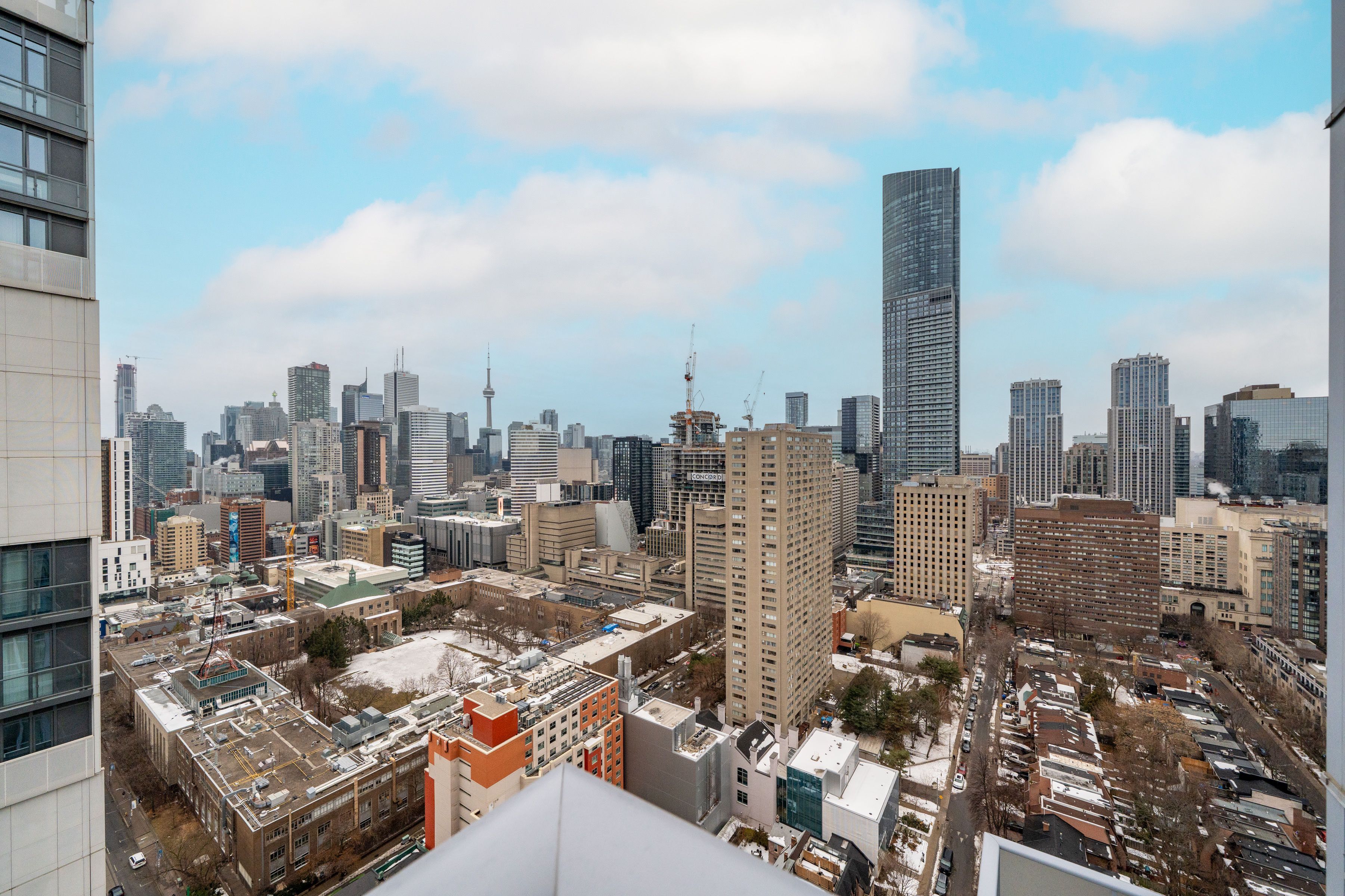 Bright 2 + 1 corner unit with panoramic southwest & cn tower views! This like-new, freshly painted unit boasts a very efficient layout with 2+1 bedrooms, 2 baths, and a den can be 3rd bedroom or office with large windows, door & closet-a huge upgrade from the builder. Every room has windows, filling the home with natural light. Enjoy panoramic skyline views from the large balcony, and hardwood floors throughout complete this stunning space. Locker included. Amenities: rooftop bbq, rooftop lounge, party room, theatre, yoga & tv rooms, gym, study, guest suites, pet wash, 24-hr concierge. Steps from yonge & dundas, ttc (college subway & carlton), restaurants, shops, loblaws, lcbo, toronto metropolitan u, university of toronto. A must-see unit perfect for owners or investors seeking style, convenience, and spectacular city views.