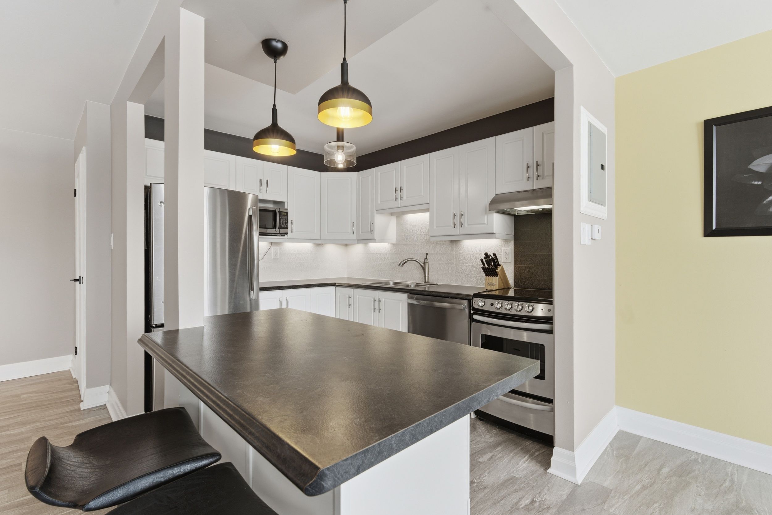 • Modern kitchen boasts stainless steel appliances and functional island.