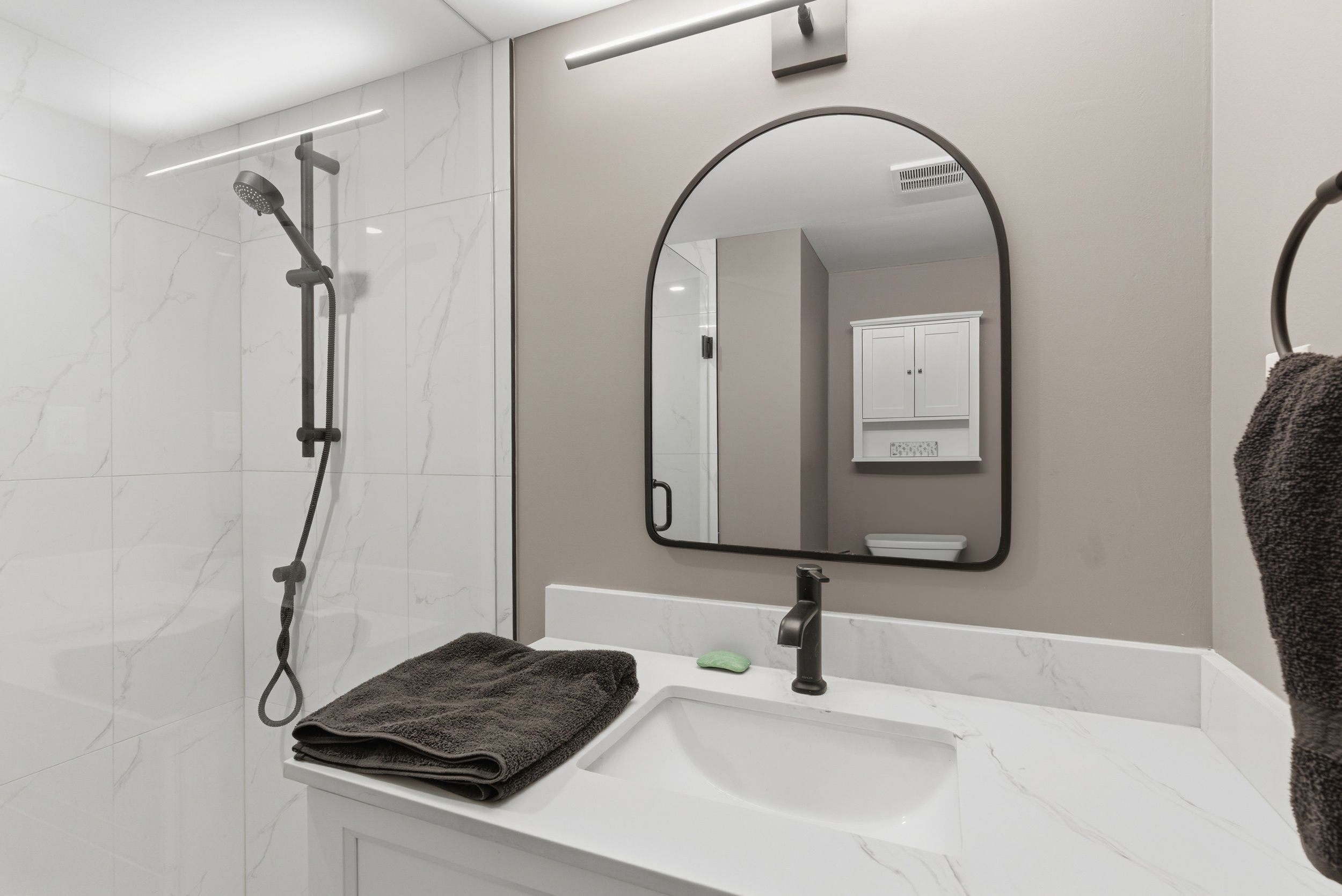 • Renovated bathroom features sleek glass shower and contemporary tiles.