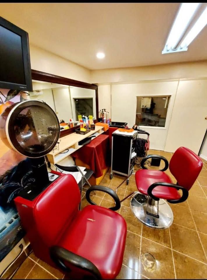 • Fully finished with styling chairs, shampoo sink, and waiting area.