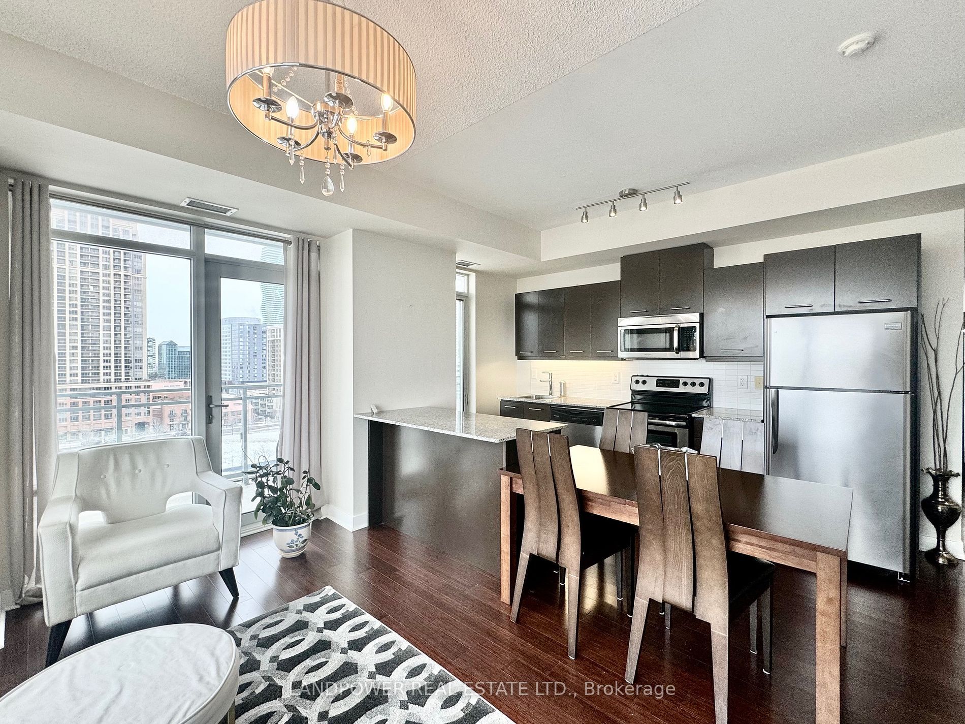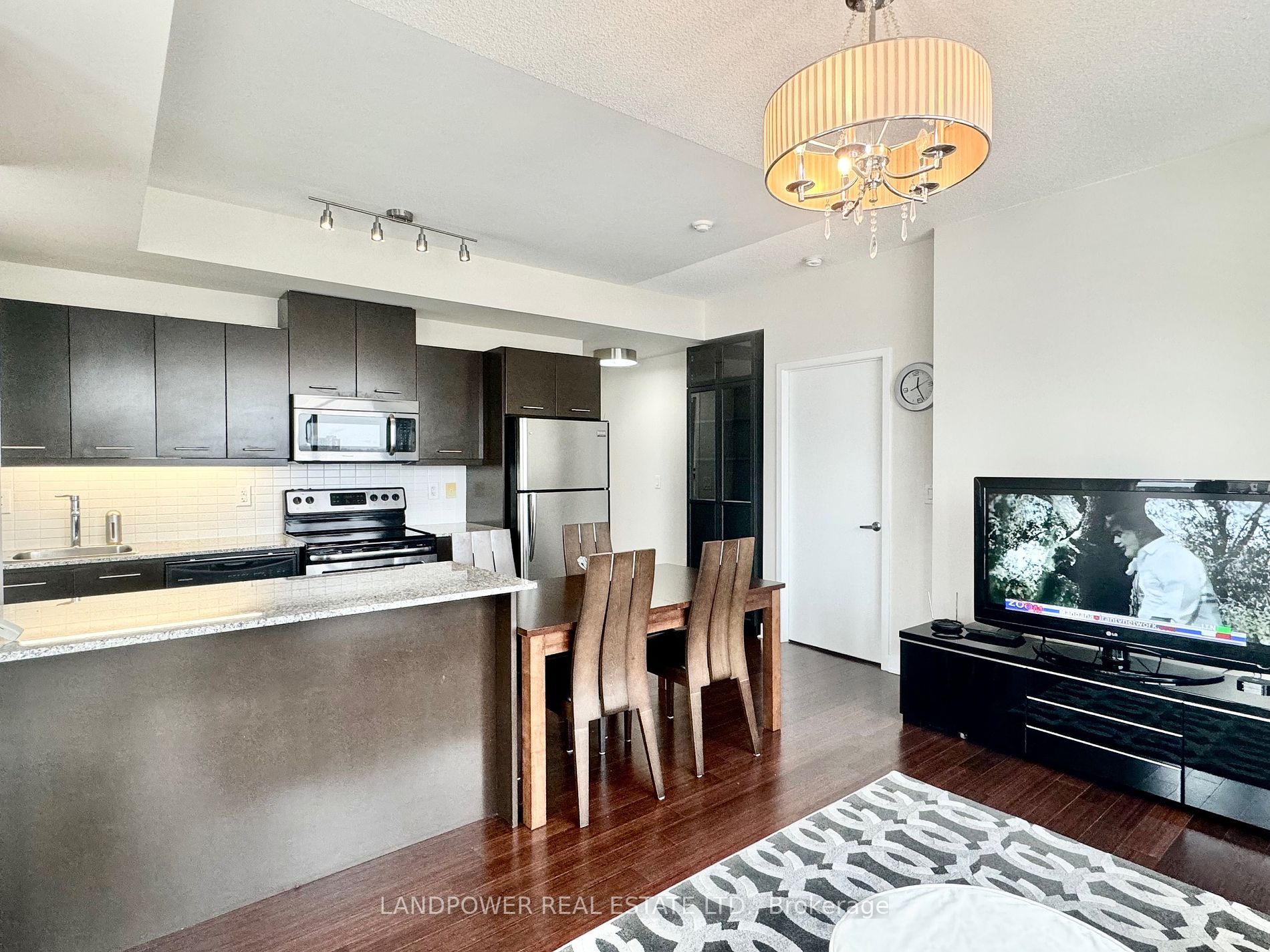 • Modern kitchen features granite counters and stainless steel appliances.
