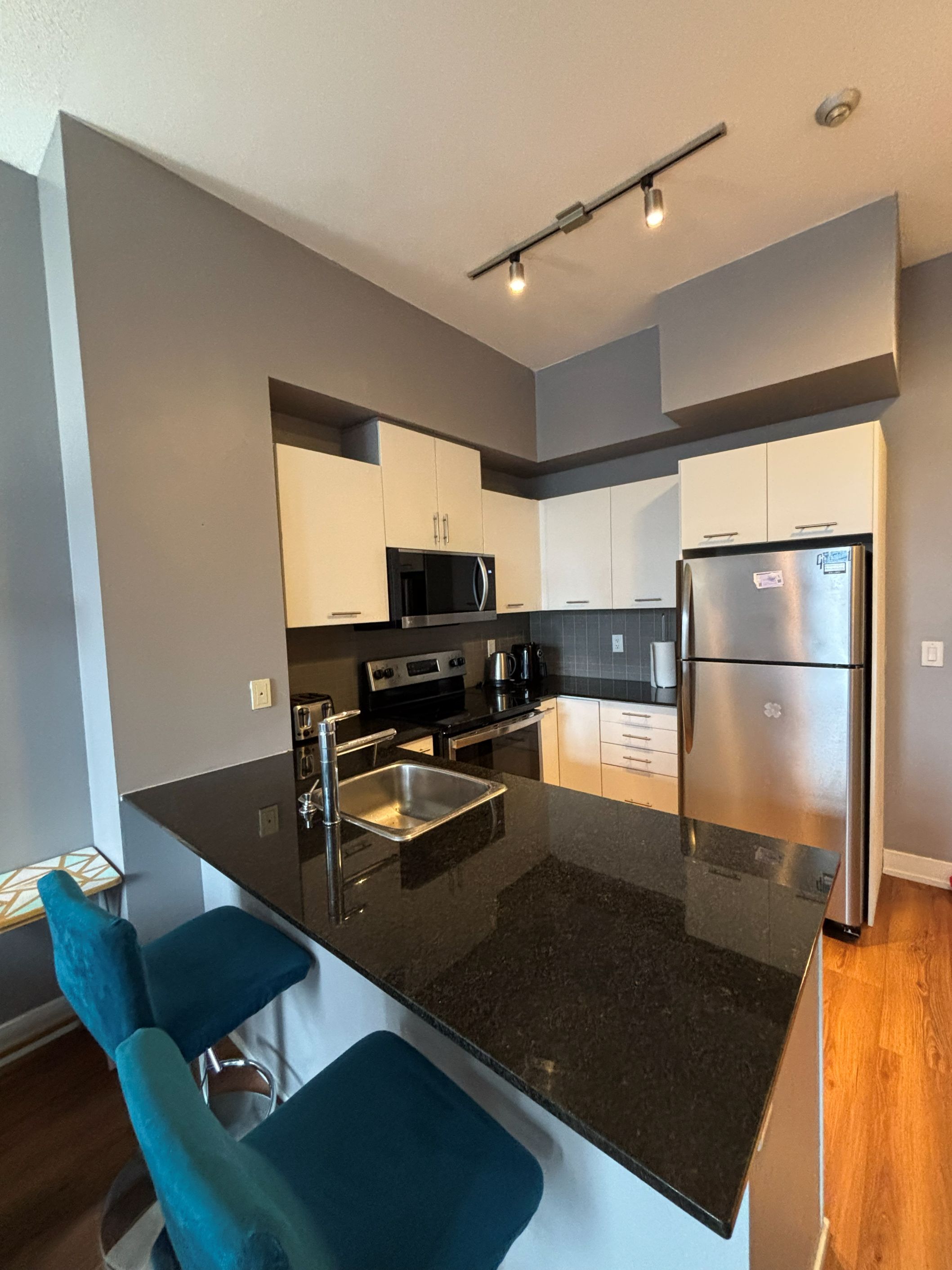 Fully furnished spectacular condo in downtown mississauga!! 10 ft ceilings, 2 full bathrooms, den, terrace. Beautiful kitchen w/black counter tops. This unit is steps away from sheridan college, square one shopping centre, the ymca, gyms, and parks, minutes away from highways, yet tucked away from the busier streets. With state-of-the-art amenities like basketball court, gym, rooftop patio, and more, you will love living here! Luxury at its best! Private terrace!!! All utilities (heat, hydro, water) and internet included. Tenant responsible for phone and cable. One parking spot included.