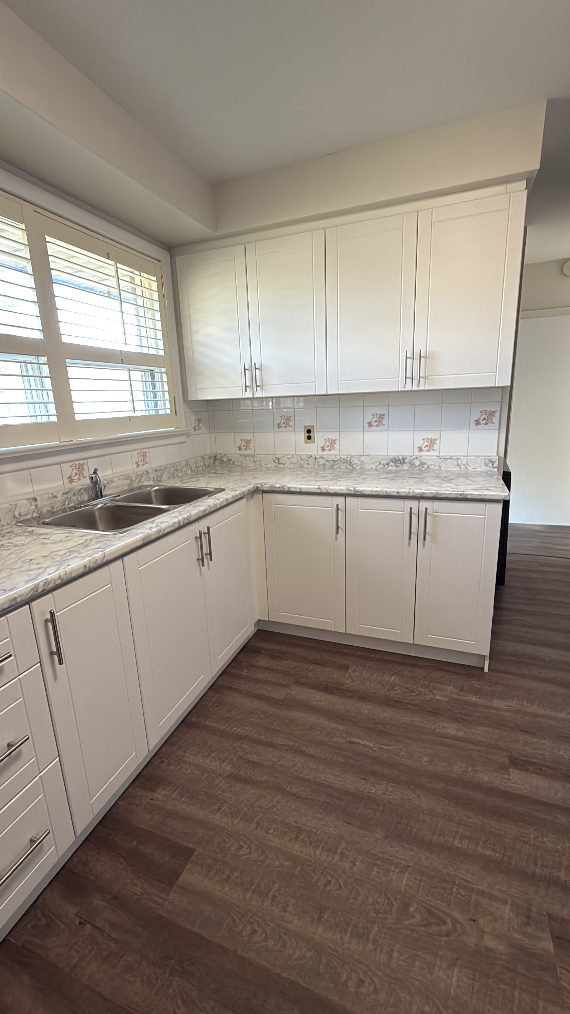 • Modern kitchen with stainless steel appliances and backyard access.