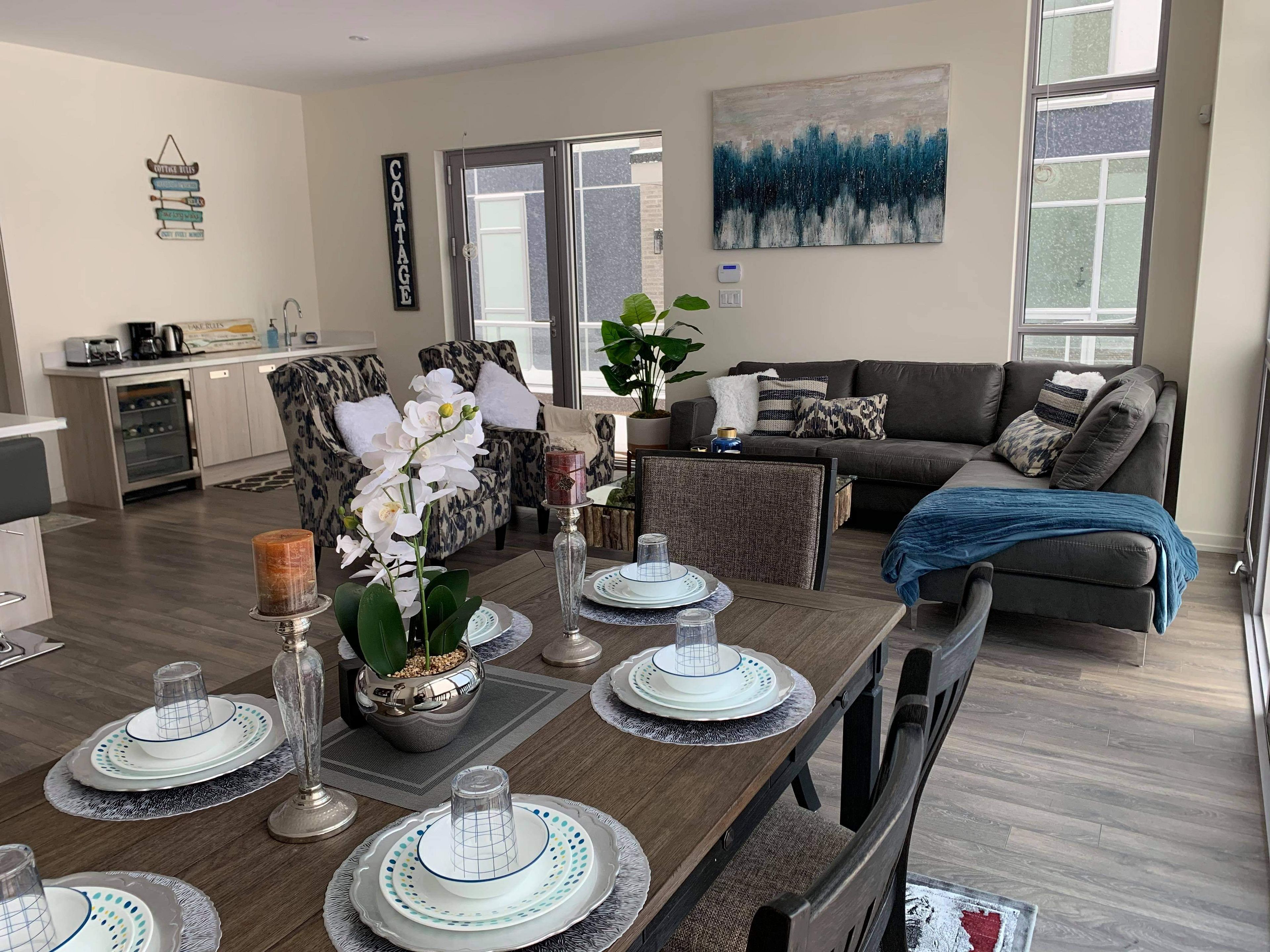 Rare opportunity to own breathtaking fully furnished island corner townhome. Luxury urban style cottage townhome in prominent friday harbour resort with water access through large private dock/boat slip with pedestal supplying water & electricity on the south exposure shoreline for the most sunlight. Experience luxury lakeside living at friday harbour resort with this stunningly bright three-storey lake home, offering over 2,731 sqft of beautifully designed space with a gourmet kitchen on the main floor, 12 foot kitchen island and custom led lighting. Perfectly positioned in ontario's premier all-season resort community, main floor 10' ceiling, laminate flooring/oak stairs throughout open concept design living/dining/kitchen walkout to deck in front with direct access to 2-car garage & 2-car drive way at rear, second floor 9' ceiling are 3 bedroom with prime ensuite bathroom & walkout to balcony, all floor-to-ceiling windows, top floor with 4th bedroom with prime ensuite bathroom and loft great room, an entertainment centre with wet bar & walkout to rooftop terrace overlooking water. Designer luxury finishings top to bottom. Step to club house & island pool, upscale retail shops & classy restaurants. Closed by world class golf course & 200 acre nature conservation & shopping malls etc. **extras** stainless steel ( subzero fridge, wolf gas stove, asko dishwasher, range hood, microwave), washer & dryer, electric light fixtures, window coverings, gas furnace & equipment, central air conditioning, electric garage door opener.