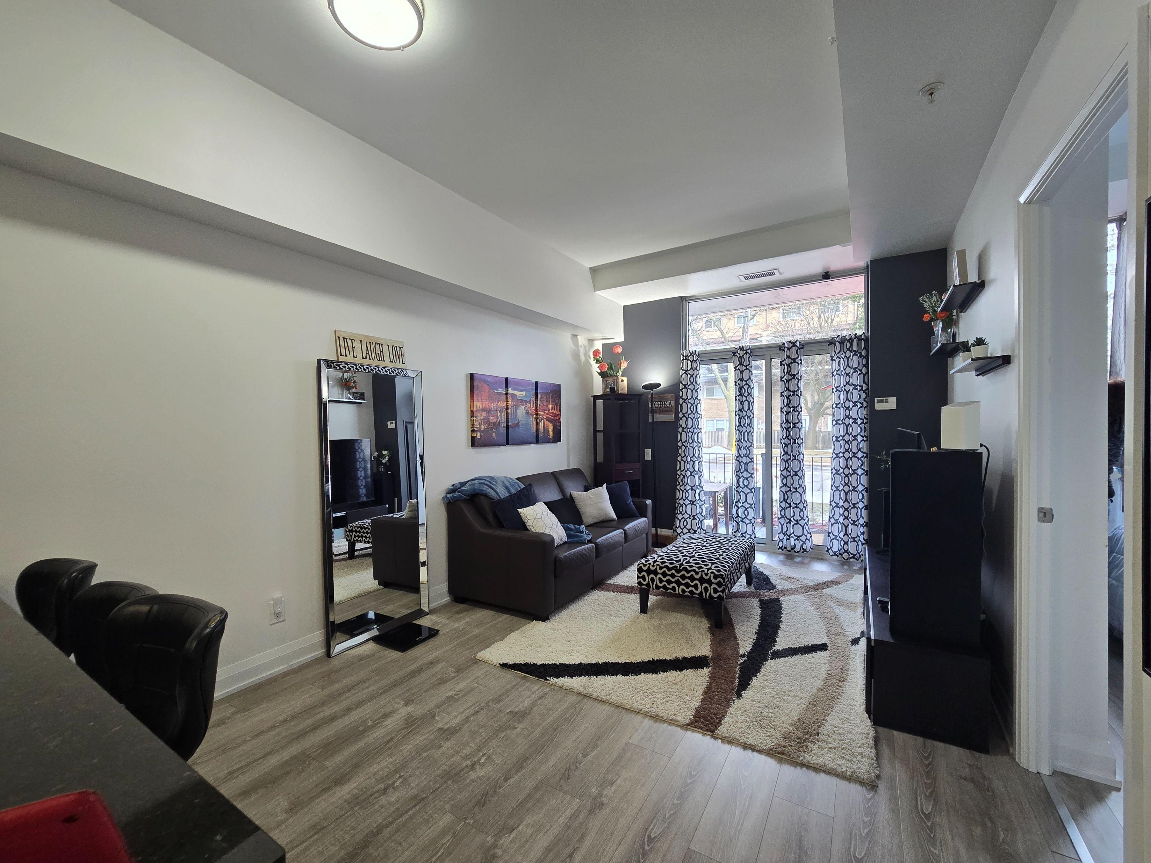 Welcome to this beautifully appointed ground-level suite, where modern design meets effortless living in one of scarborough's most vibrant communities. This stylish one-bedroom home offers a bright, open-concept layout that feels both spacious and inviting. Large windows bring in an abundance of natural light, highlighting the clean lines, contemporary finishes, and carpet-free interior throughout. The sleek kitchen is thoughtfully designed with built-in appliances and ample cabinetry, flowing seamlessly into the living and dining space-perfect for hosting friends, enjoying quiet evenings at home, or working comfortably in a modern setting. The bedroom offers a peaceful retreat, while the well-finished bathroom and in-suite laundry complete this move-in-ready package. Step outside and discover a neighbourhood that truly has it all. You're surrounded by excellent transit options, everyday conveniences, and a growing mix of cafés, shops, and restaurants. Nearby waterfront trails, parks, and green spaces provide beautiful outdoor escapes just minutes away. Whether you're commuting, running errands, or enjoying a relaxing walk by the lake, everything you need is right at your fingertips. This is a perfect opportunity for first-time buyers, downsizers, or savvy investors looking to secure a home in a well-connected and fast-growing area. Although this unit does not include parking or a storage locker, both are available for purchase separately, giving buyers the flexibility to add these features as needed. Parking and storage can be arranged for an addtional cost.