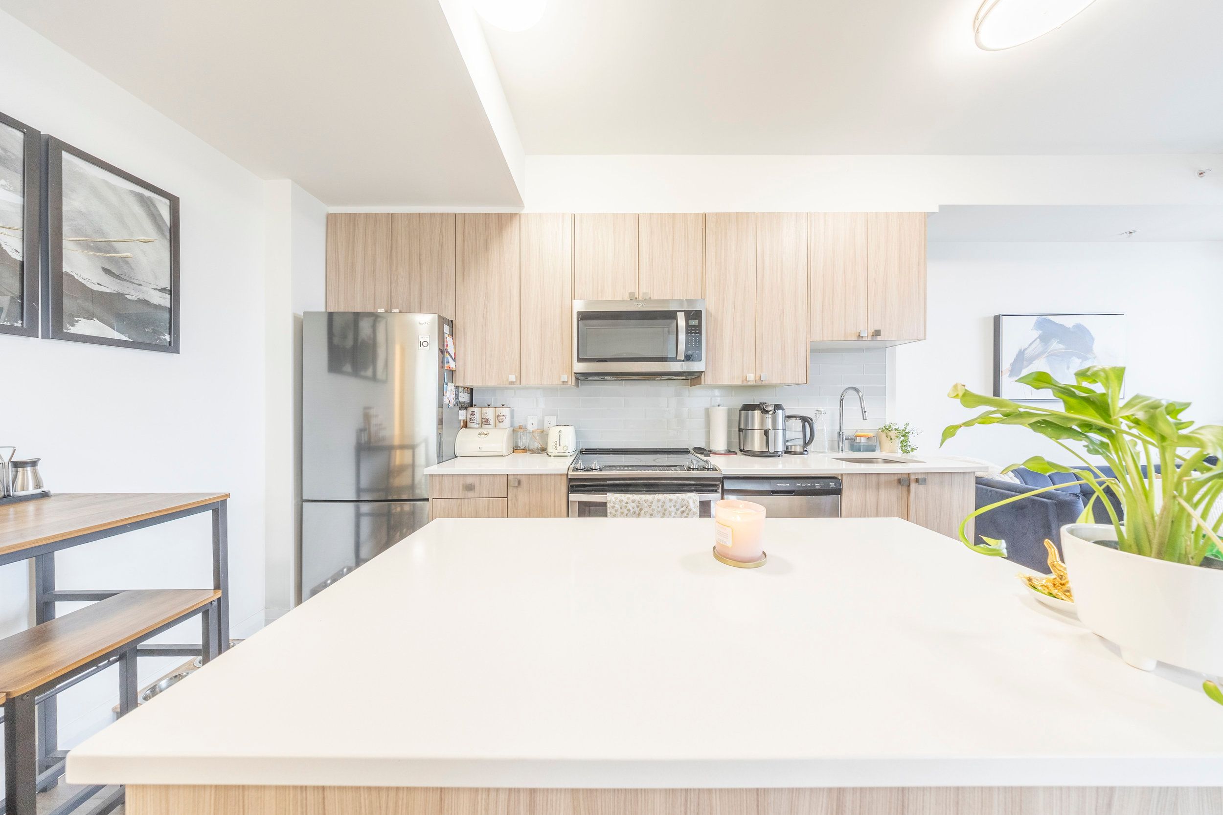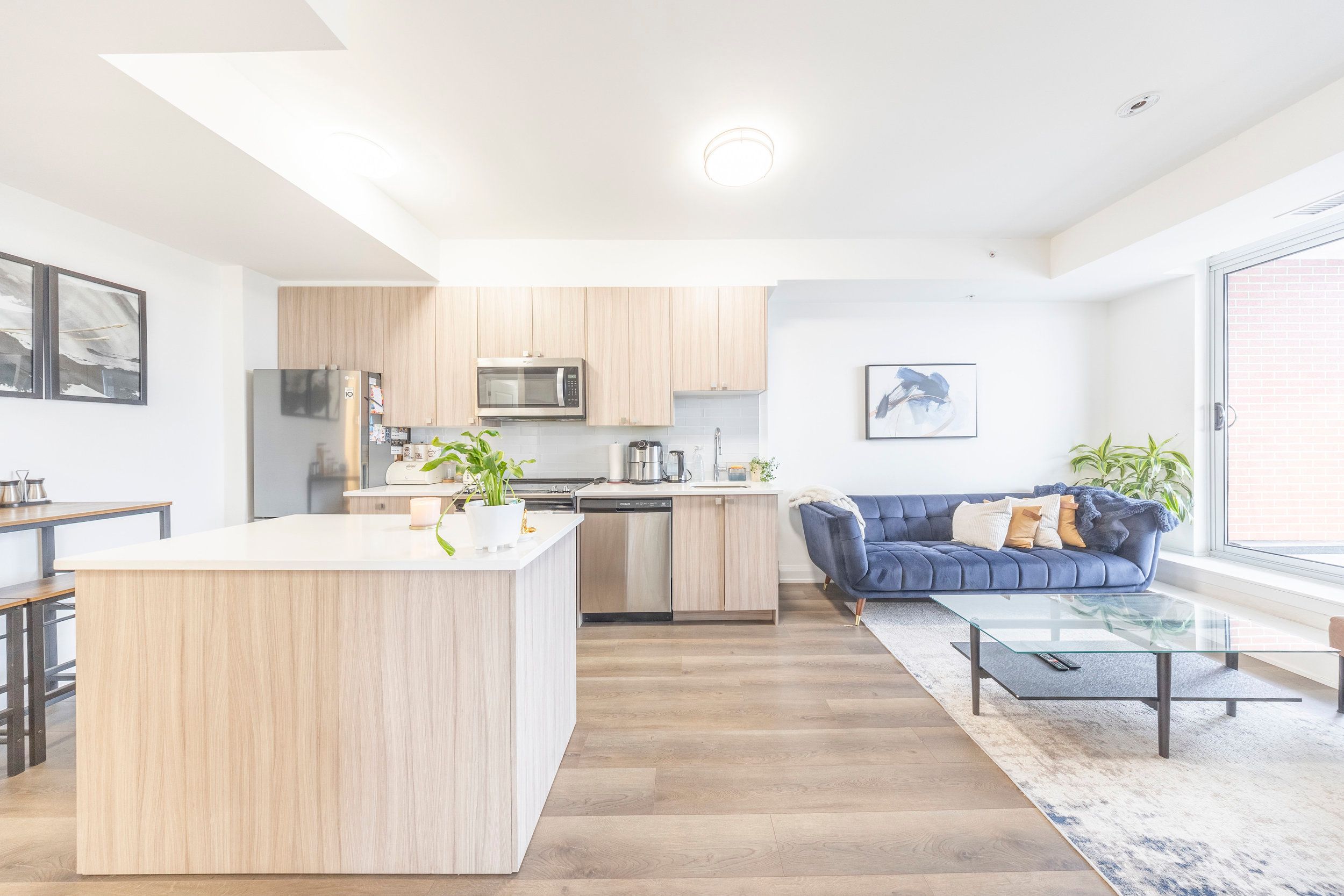 • Open-concept floorplan with a sleek kitchen and large island.