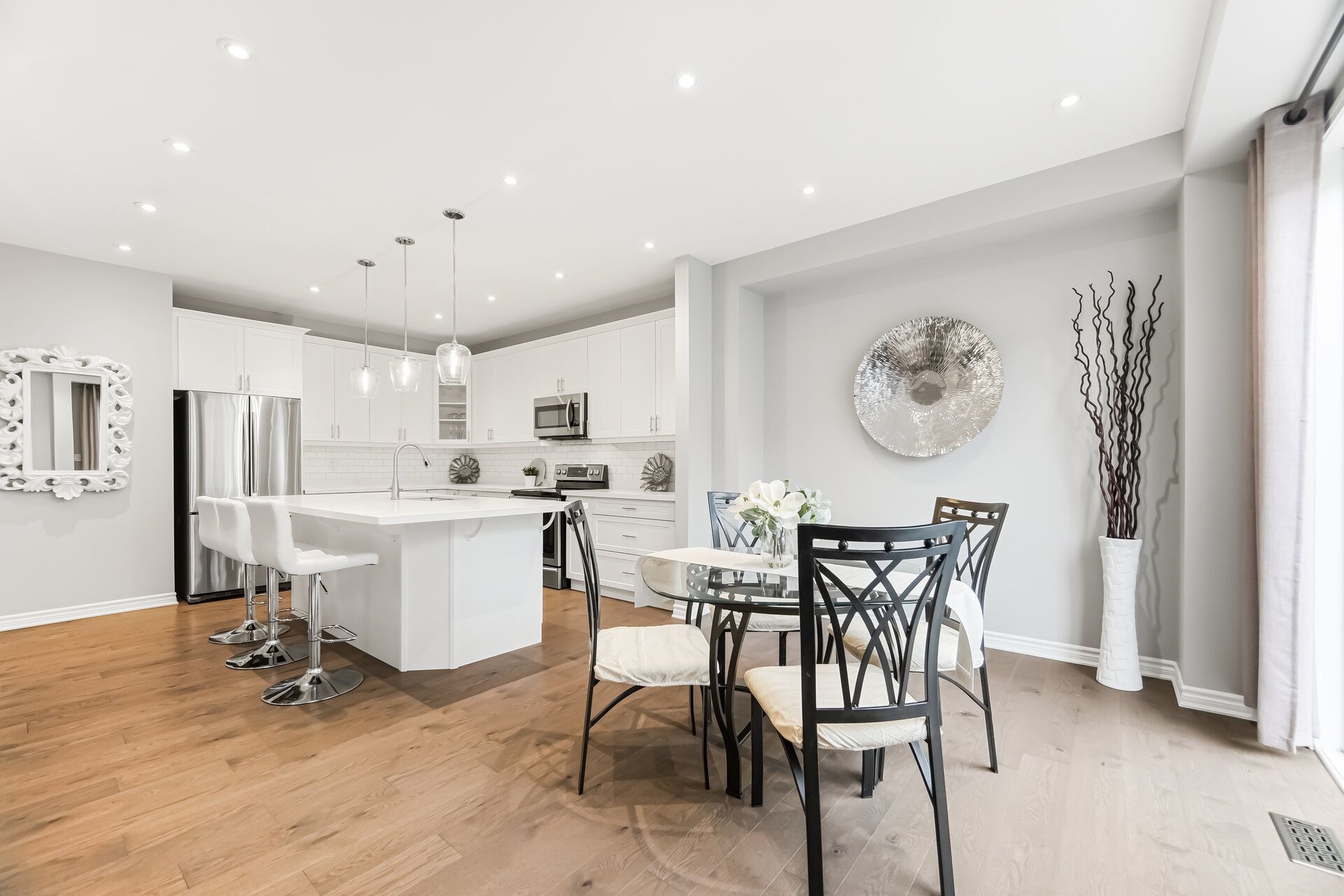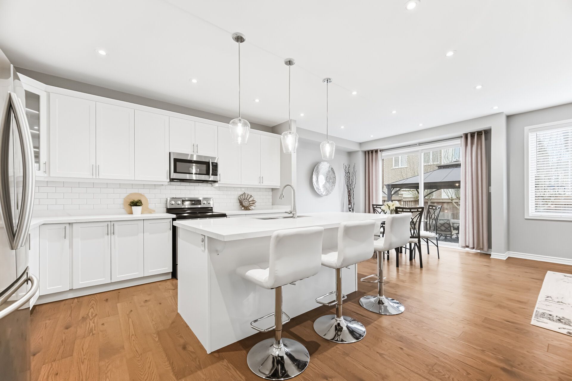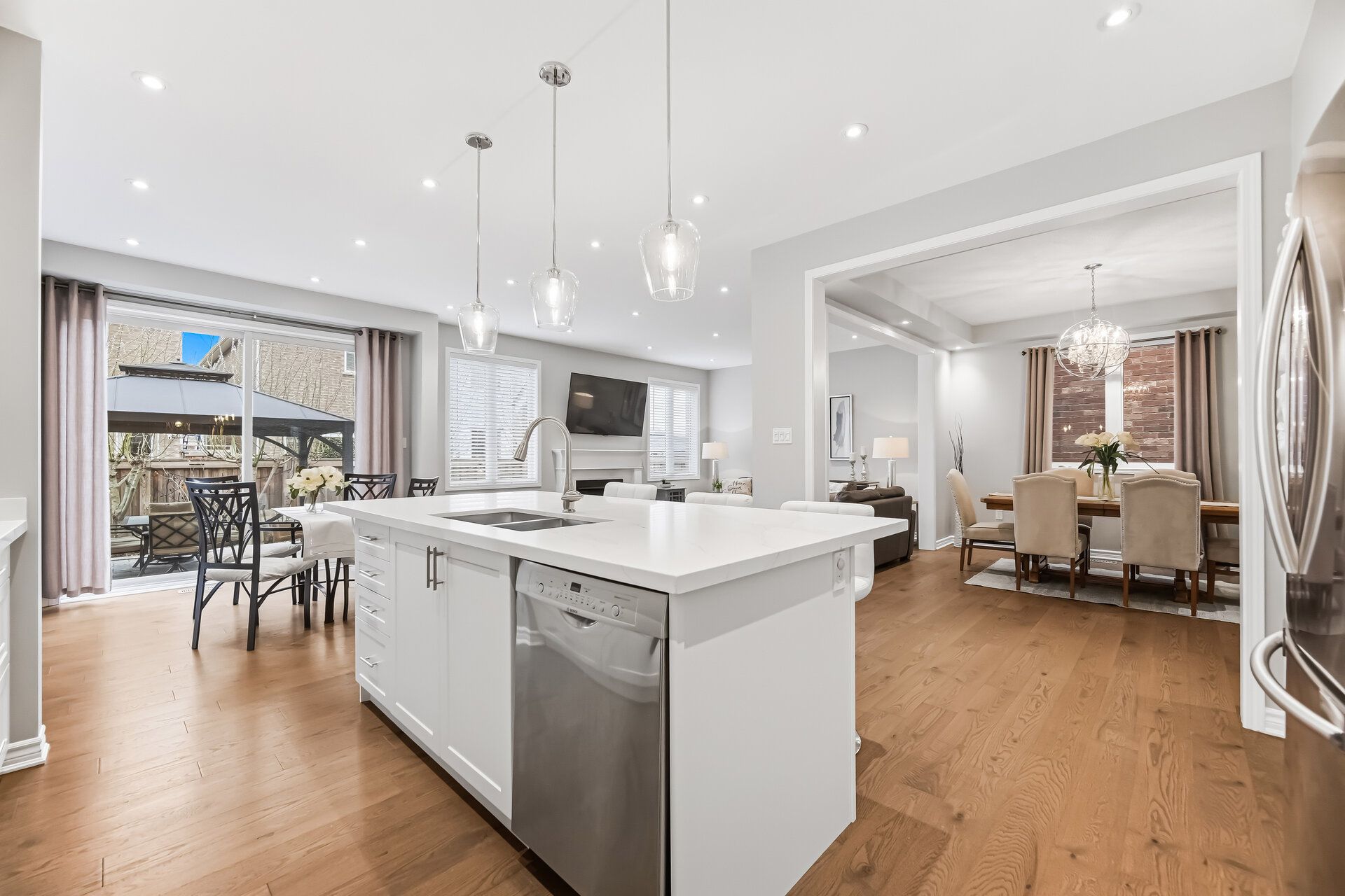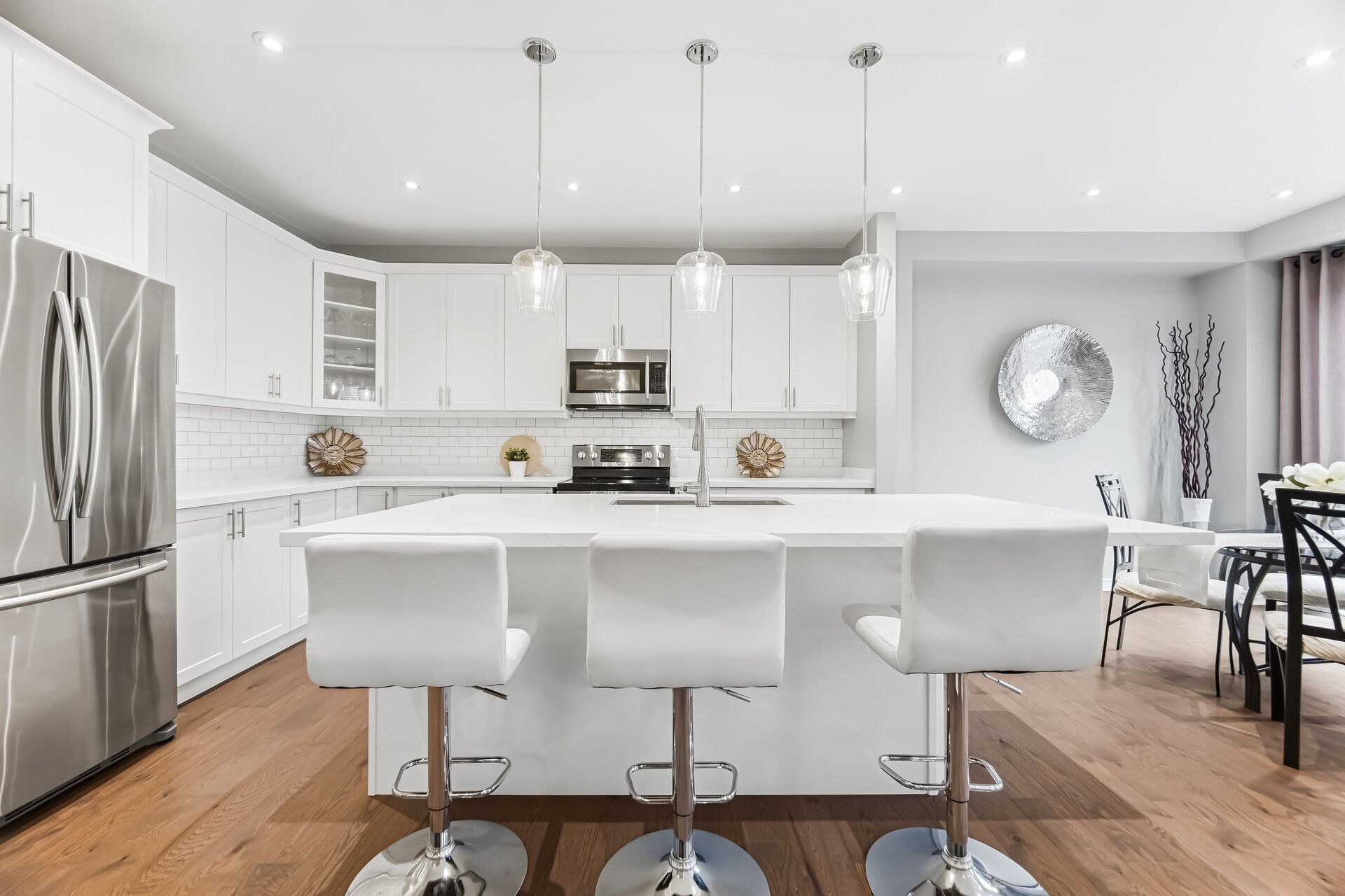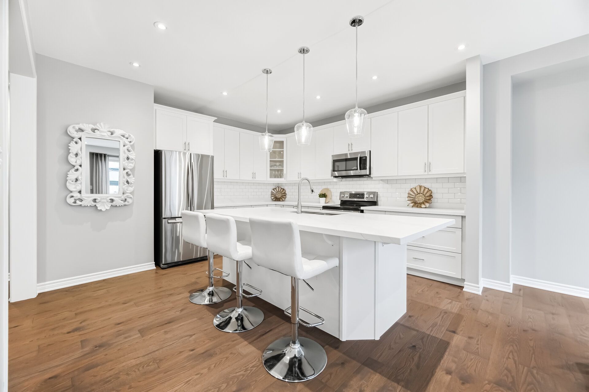 • Modern white kitchen with quartz countertops and stainless steel appliances.