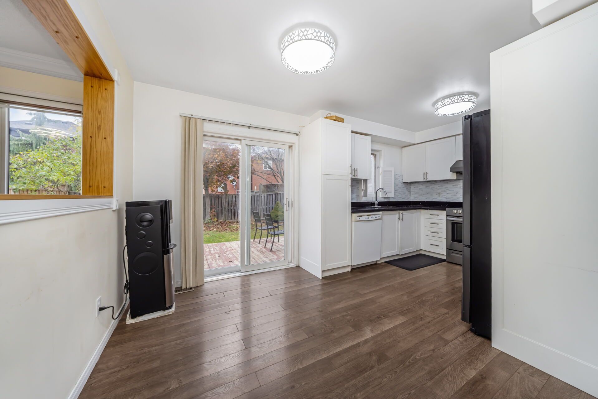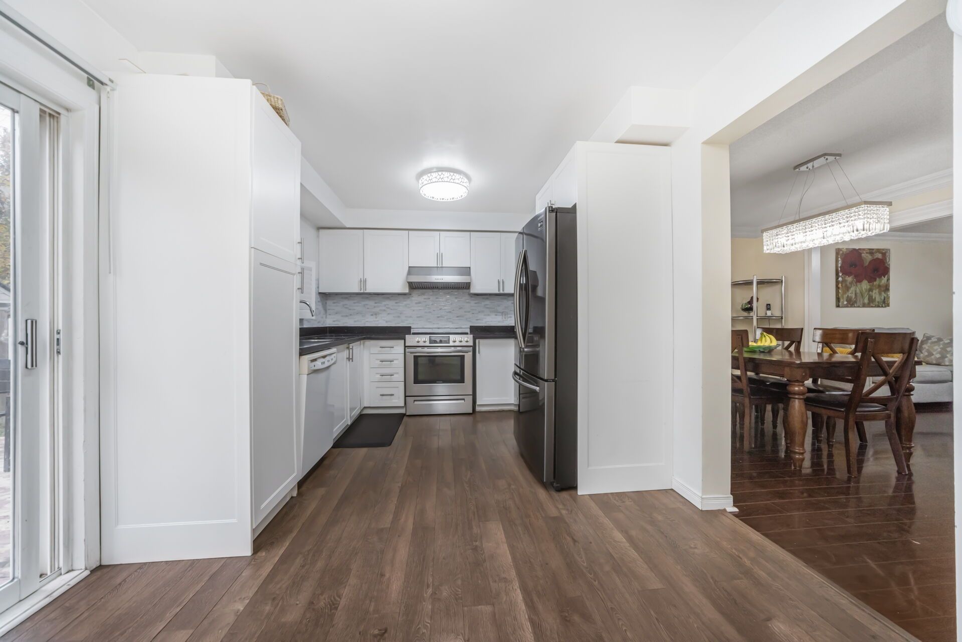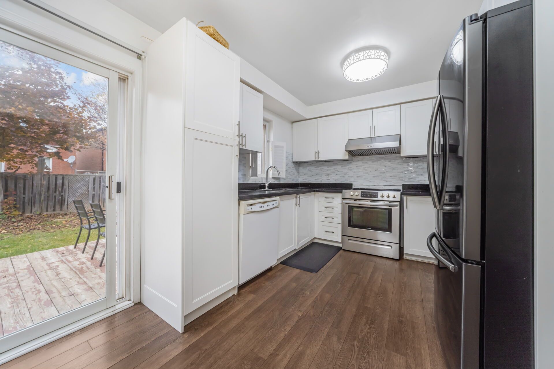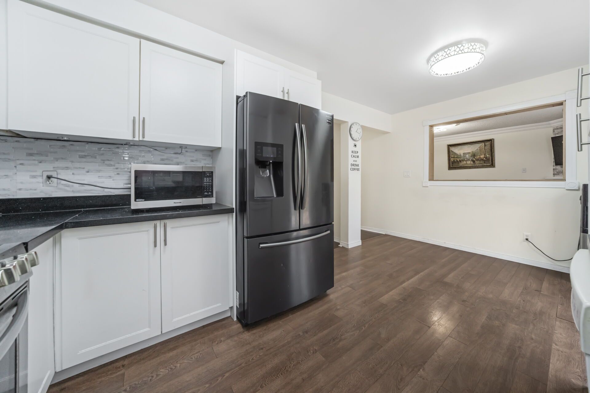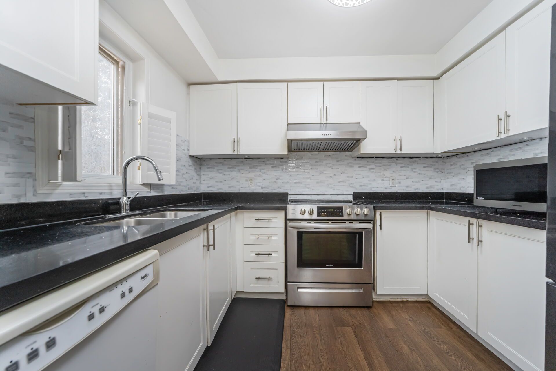 • Renovated eat-in kitchen with granite countertops and stainless steel appliances.