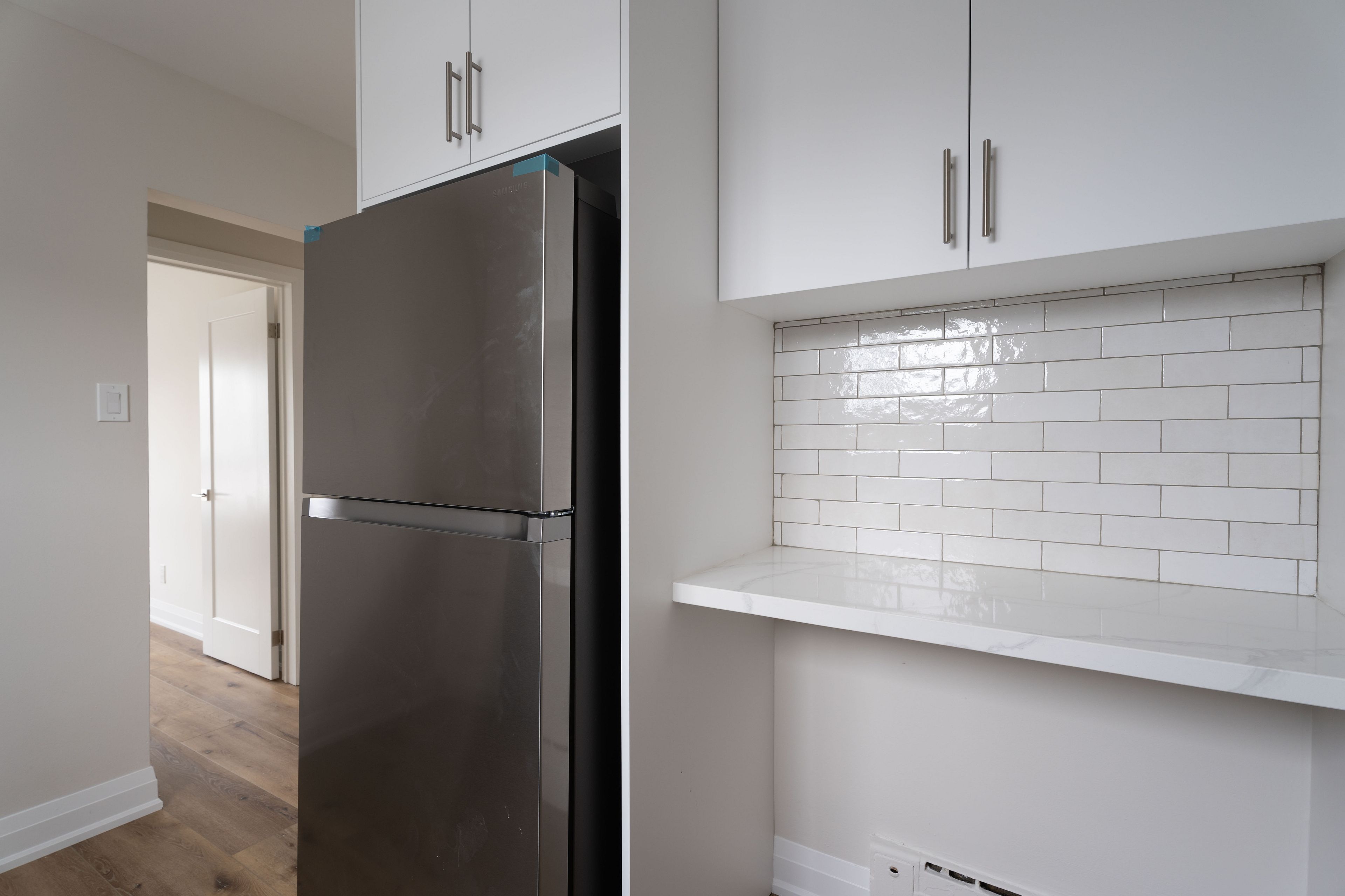 • Modern kitchen with stainless steel appliances and quartz countertops.