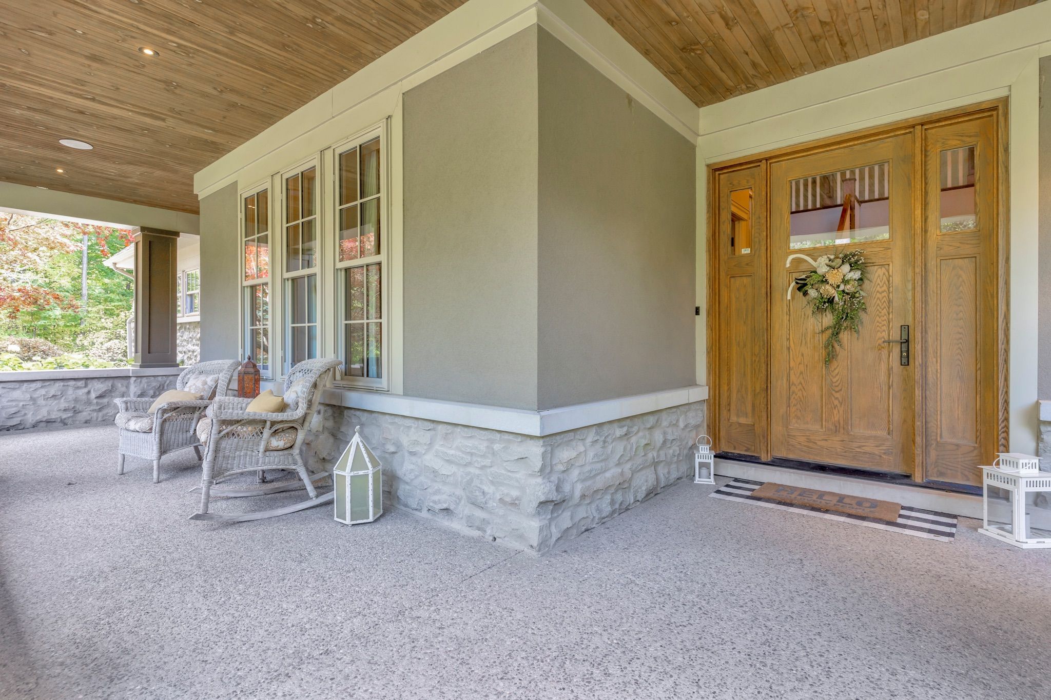 Welcome to this exceptional country estate set on almost 6 acres of private, picturesque land just minutes from the city of cambridge. Offering more than 3,850 sq. Ft. Above grade, plus an unspoiled walk-up basement with impressive 10-foot ceilings, this home blends timeless elegance, everyday comfort, and incredible future potential. The main level is designed for both relaxed living and entertaining, featuring a spacious kitchen with a large pantry, a sun-filled sunroom, a screened-in porch, and multiple inviting living spaces for gathering with family and friends. A separate dining room, private study, two fireplaces, and in-floor heating through much of the home add to the home's warmth and functionality. Upstairs, you'll find four generous bedrooms, including a spacious primary suite with ensuite bath, as well as an additional bedroom with a rough-in for a 3-piece bathroom. The basement also includes a bathroom rough-in, offering excellent potential for future finished living space or extended living arrangements, with convenient walk-up access to the garage. Outside, the property continues to impress with a fire pit area, irrigation system, and an expansive driveway leading to the attached 2-car garage. A second detached 2-car garage features a fully equipped studio apartment along with additional flexible space ideal for a home-based business, hobby area, or guest overflow. A charming chicken coop adds to the property's unique country appeal. This is a rare opportunity to enjoy the peace and privacy of country living without sacrificing proximity to city amenities. Please see attached floor plans and full video in the sales brochure.