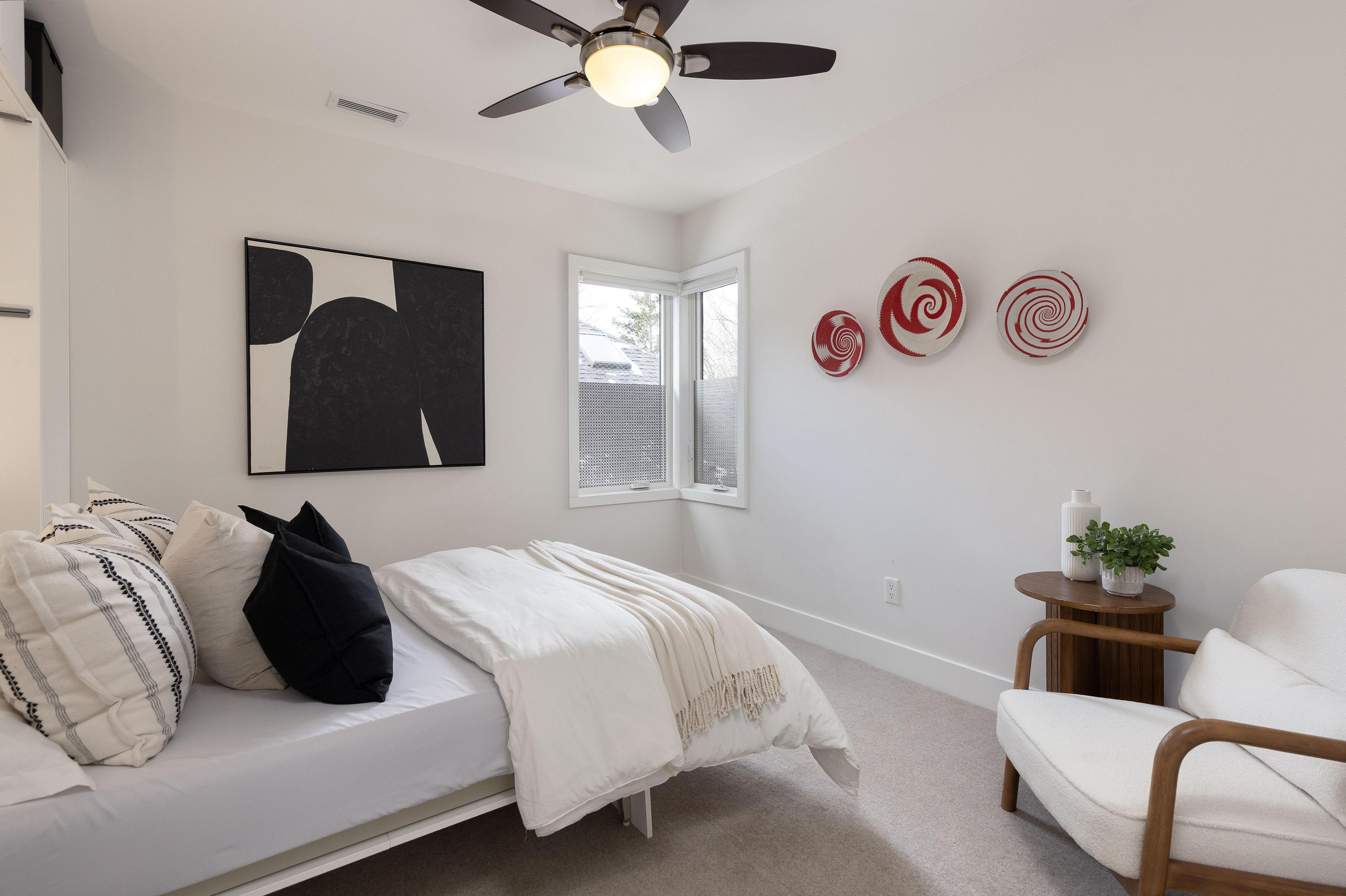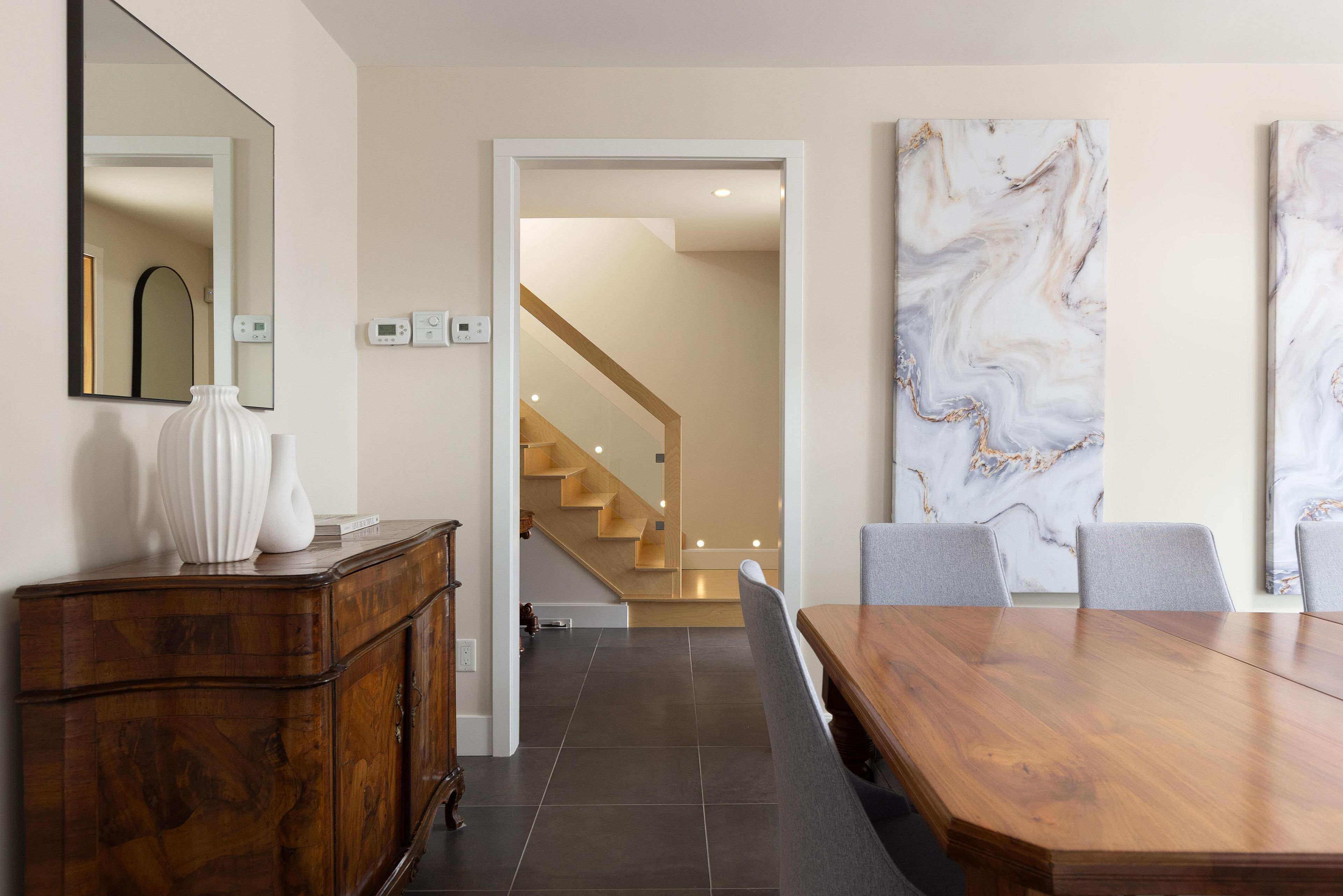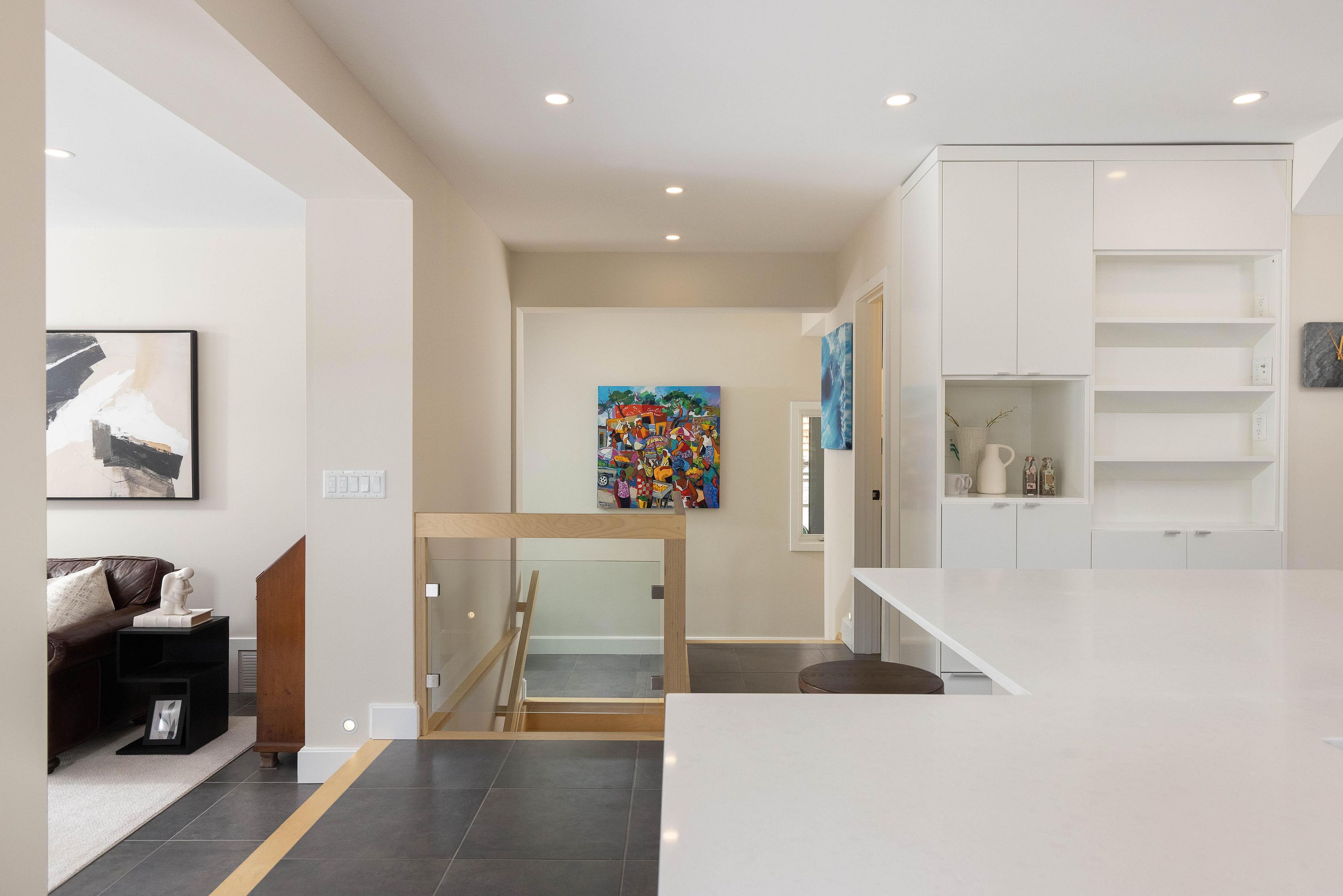 • Bright main level with Euro-style kitchen, quartz countertops, and heated tile floors.
