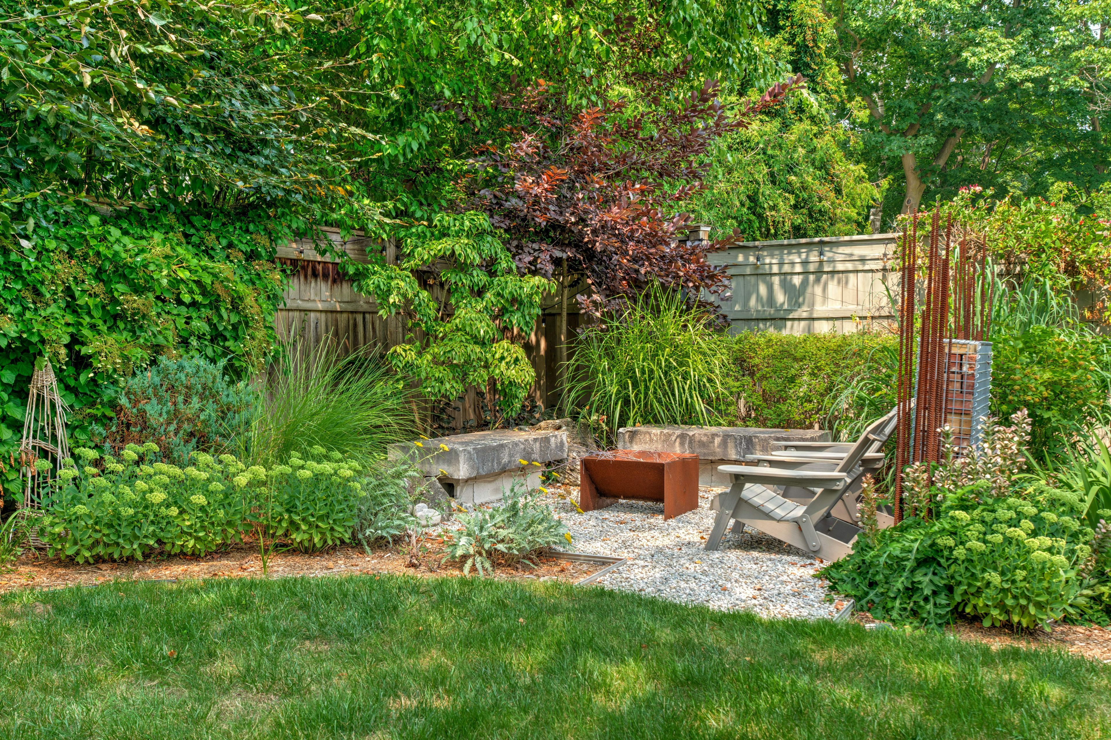 • Private backyard with mature landscaping, stone patio, and inviting fire pit seating.