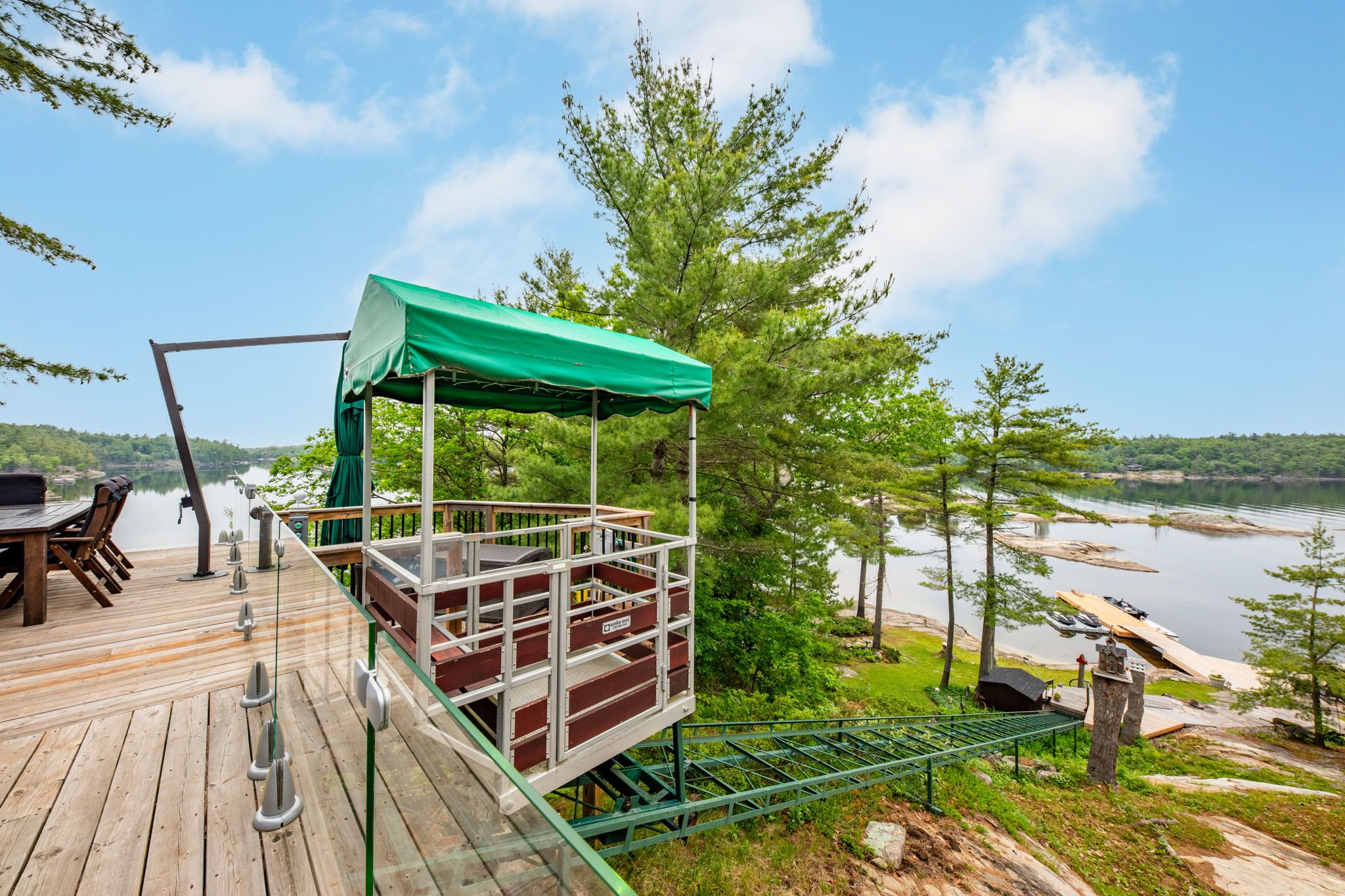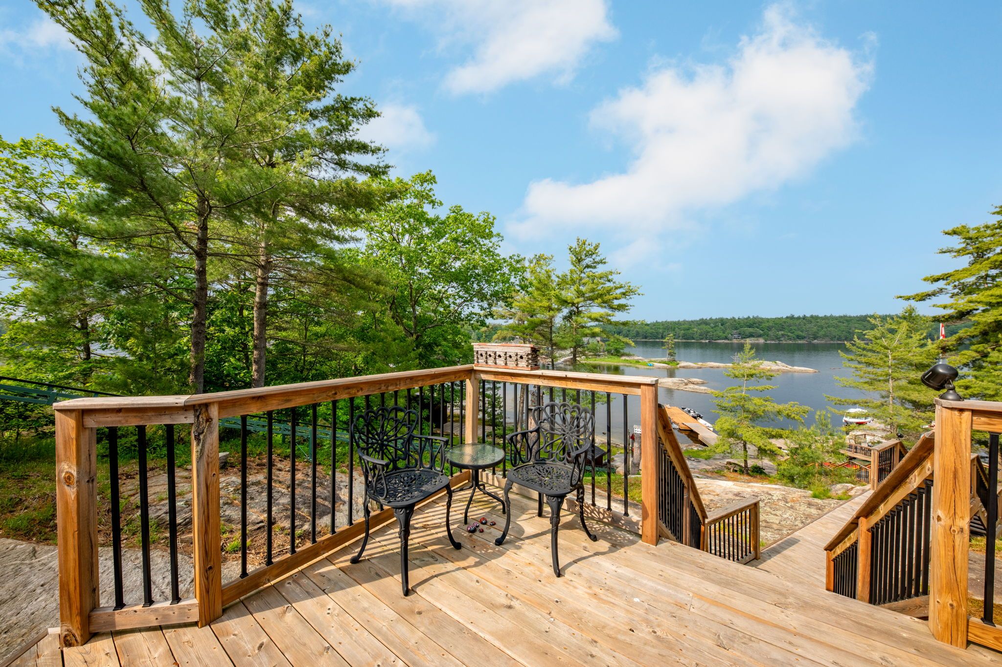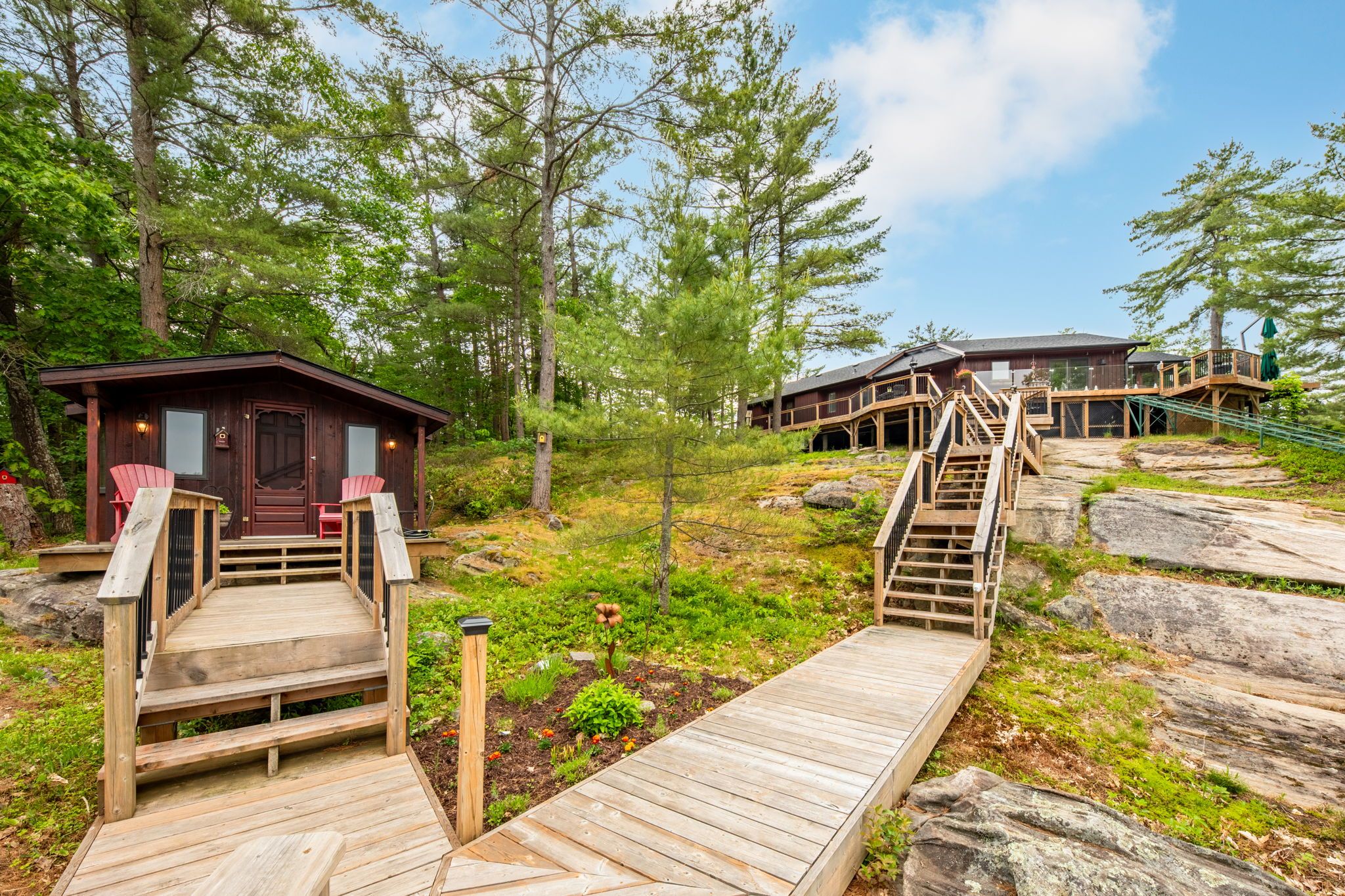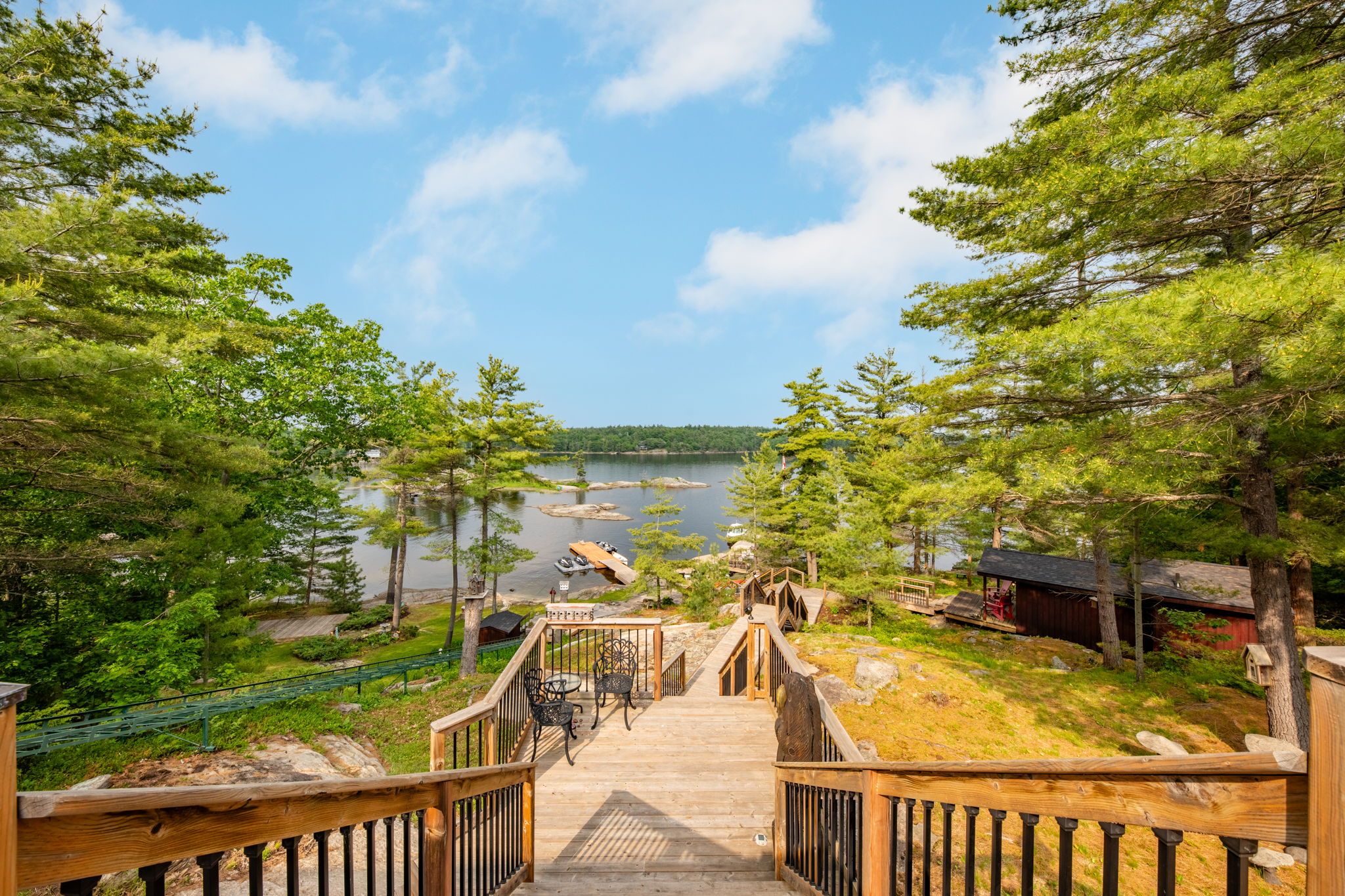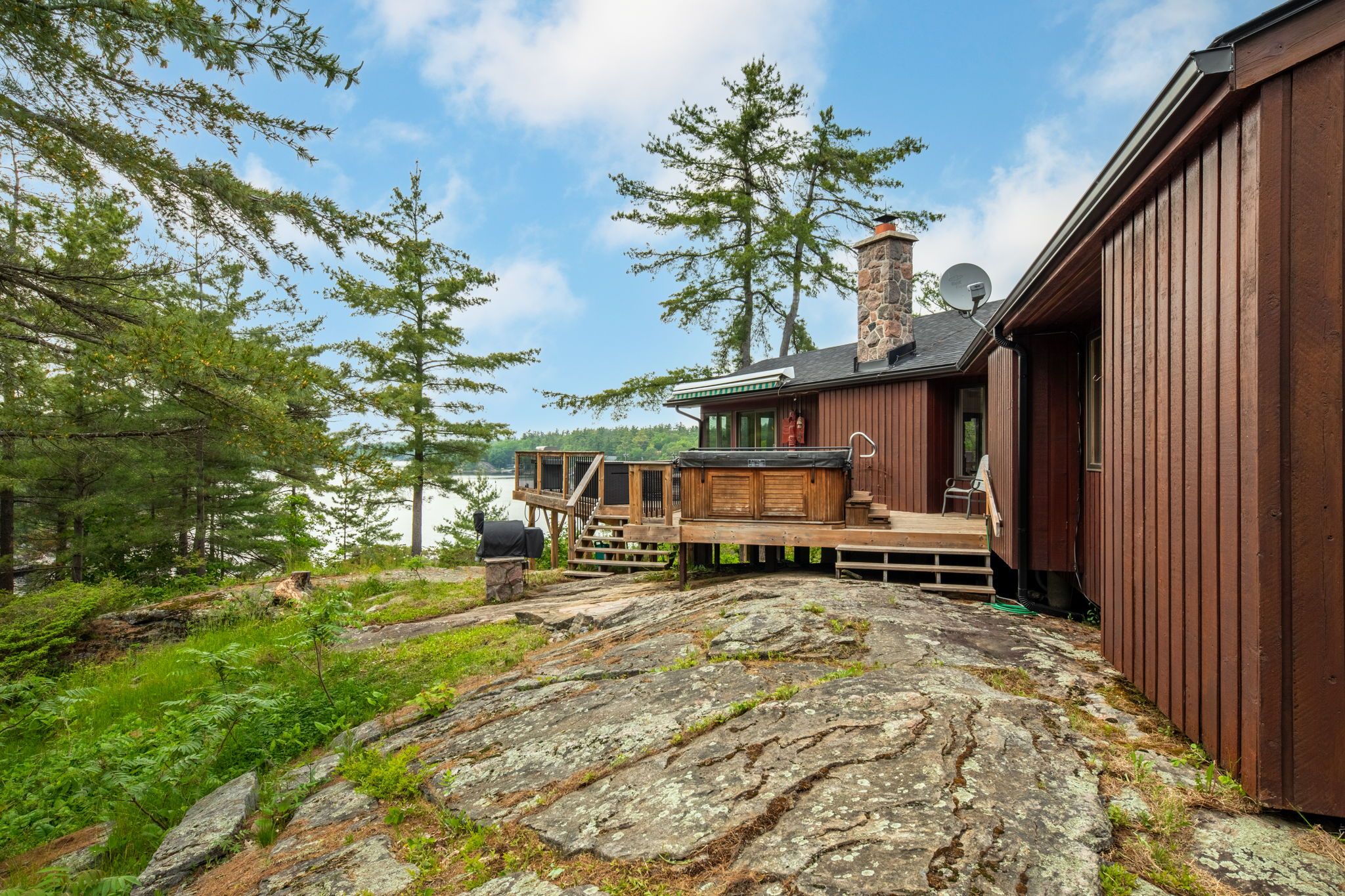 Welcome to your dream hideaway - an awe-inspiring 6. 9-acre treetop retreat on picturesque bone island, boasting 635 feet of iconic "group of seven" shoreline! This immaculate cottage offers two primary bedrooms, each with its own ensuite, providing comfort and privacy for family and guests. The larger primary suite is spacious enough to accommodate two sets of bunk beds, creating flexible sleeping arrangements for groups or families. The sunroom serves as a bright and tranquil space by day - and with room for a daybed, it easily transforms into an extra sleeping area when needed. A charming guest cottage adds even more space for visitors, making this property truly ready to host family gatherings or weekend getaways. Perched proudly on the rocky shoreline, this lakefront gem shines inside and out with extensive updates such as two newer oversized docks, hardwood throughout the main and guest cottage and tile flooring in the bathrooms. The kitchen has luxurious white cabinets and quartz countertops. Updates are lengthy and there's nothing left to do but move in and start enjoying. Stay connected with starlink internet and work lakeside if you must. Outdoor living is at its finest here; bask in the sun on the wrap-around deck with sweeping 250-degree water views, unwind under the gazebo, or soak in the built-in hot tub. A shaded large awning provides shade for sitting up top overlooking georgian bay. Edge-lit glass railings add a magical glow to evenings outdoors. For your boating lifestyle, the two large fixed and floating docks provide deep, sheltered mooring and perfect spots for swimming. There's ample storage for all your lakeside toys plus a separate workshop for your hobbies. And with the hassle-free inclinator, you can glide easily between the waterfront and your cottage haven - no stairs required. This property truly combines luxury, flexibility, and nature's beauty - the perfect island escape for family, friends, and unforgettable georgian bay adventures.
