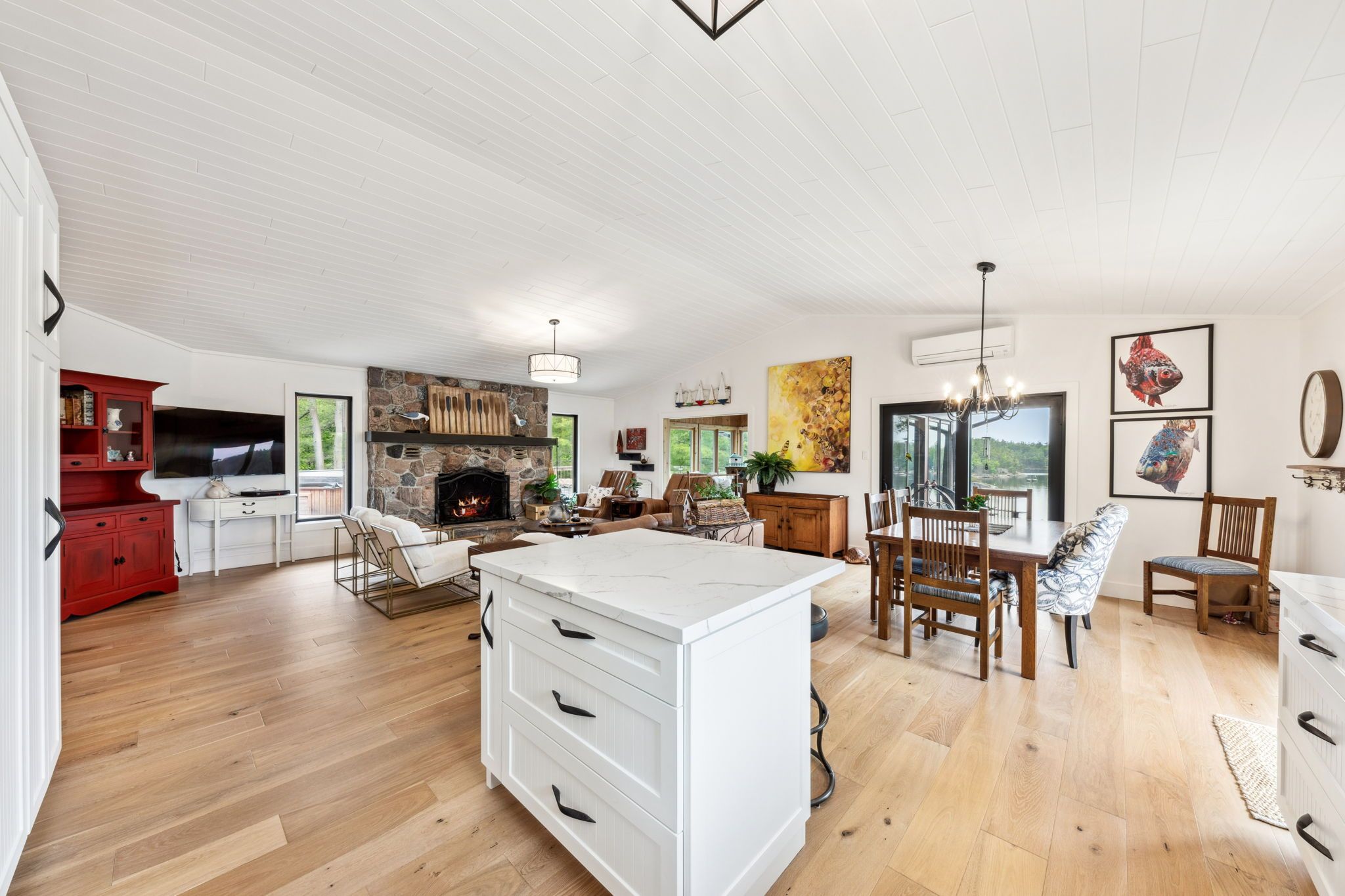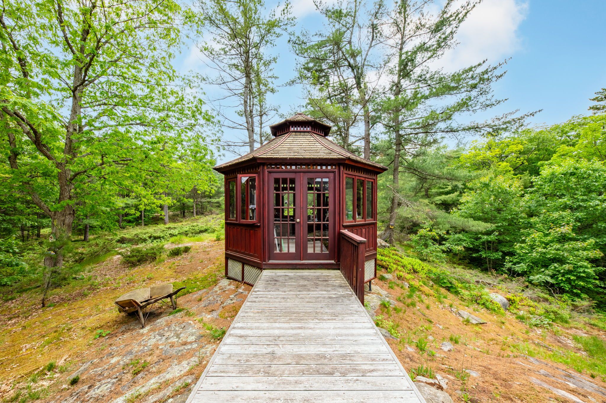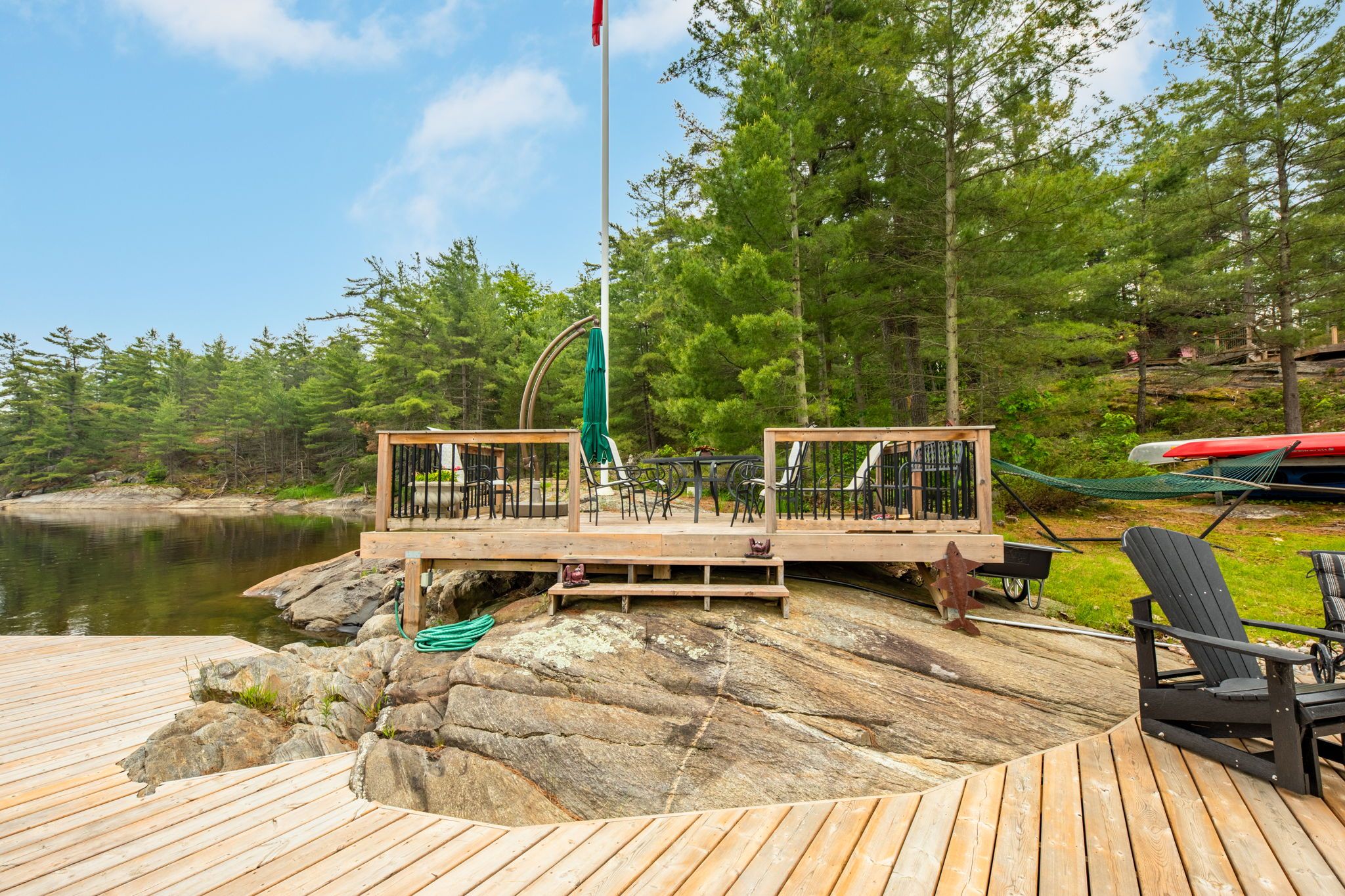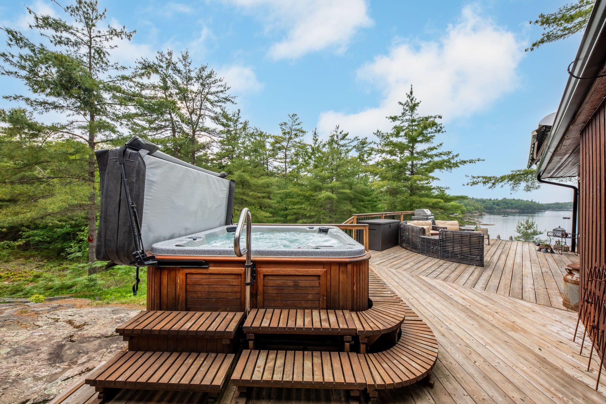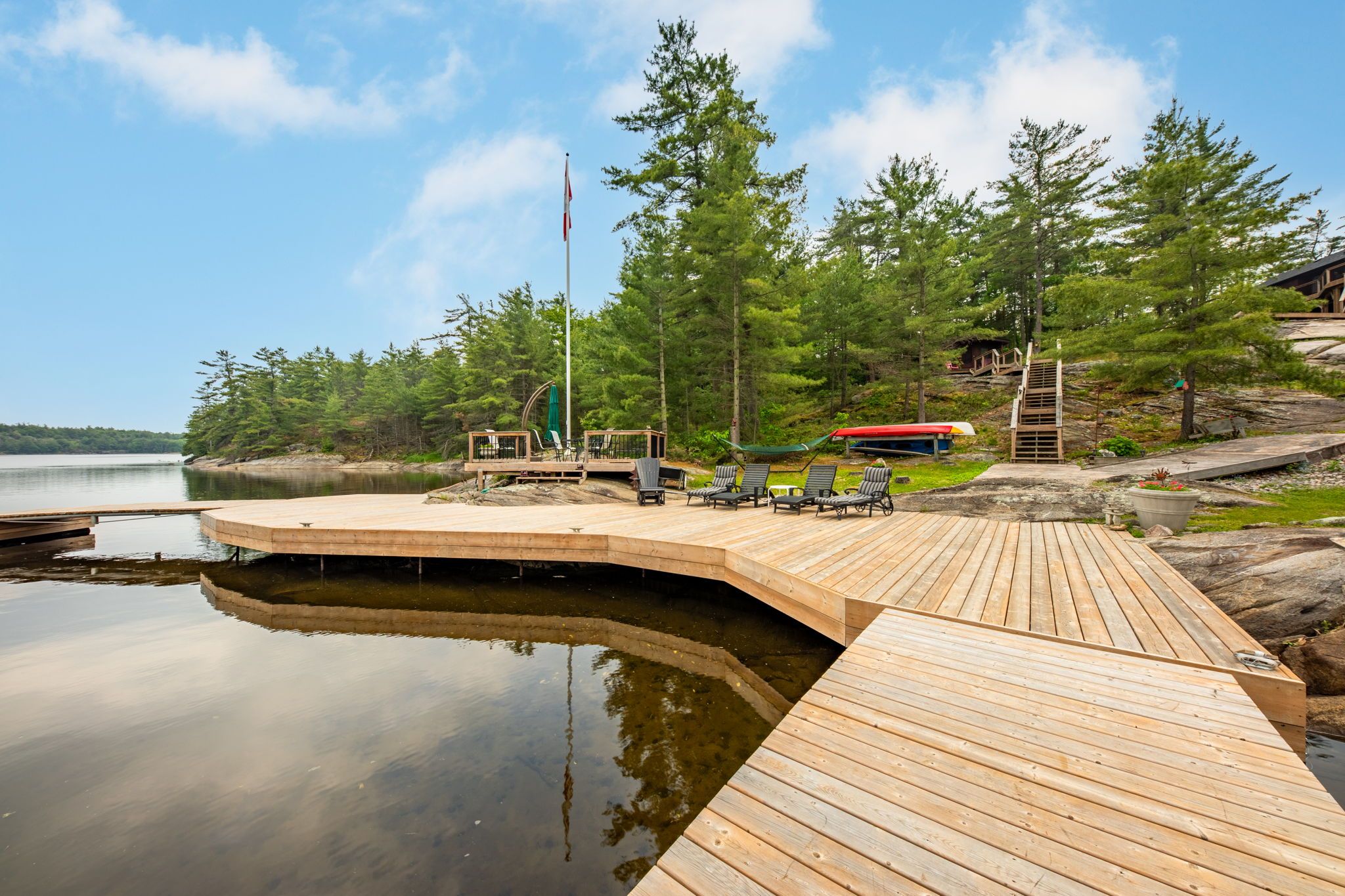 Welcome to your dream hideaway - an awe-inspiring 6. 9-acre treetop retreat on picturesque bone island, boasting 635 feet of iconic "group of seven" shoreline! This immaculate cottage offers two primary bedrooms, each with its own ensuite, providing comfort and privacy for family and guests. The larger primary suite is spacious enough to accommodate two sets of bunk beds, creating flexible sleeping arrangements for groups or families. The sunroom serves as a bright and tranquil space by day - and with room for a daybed, it easily transforms into an extra sleeping area when needed. A charming guest cottage adds even more space for visitors, making this property truly ready to host family gatherings or weekend getaways. Perched proudly on the rocky shoreline, this lakefront gem shines inside and out with extensive updates such as two newer oversized docks, hardwood throughout the main and guest cottage and tile flooring in the bathrooms. The kitchen has luxurious white cabinets and quartz countertops. Updates are lengthy and there's nothing left to do but move in and start enjoying. Stay connected with starlink internet and work lakeside if you must. Outdoor living is at its finest here; bask in the sun on the wrap-around deck with sweeping 250-degree water views, unwind under the gazebo, or soak in the built-in hot tub. A shaded large awning provides shade for sitting up top overlooking georgian bay. Edge-lit glass railings add a magical glow to evenings outdoors. For your boating lifestyle, the two large fixed and floating docks provide deep, sheltered mooring and perfect spots for swimming. There's ample storage for all your lakeside toys plus a separate workshop for your hobbies. And with the hassle-free inclinator, you can glide easily between the waterfront and your cottage haven - no stairs required. This property truly combines luxury, flexibility, and nature's beauty - the perfect island escape for family, friends, and unforgettable georgian bay adventures.