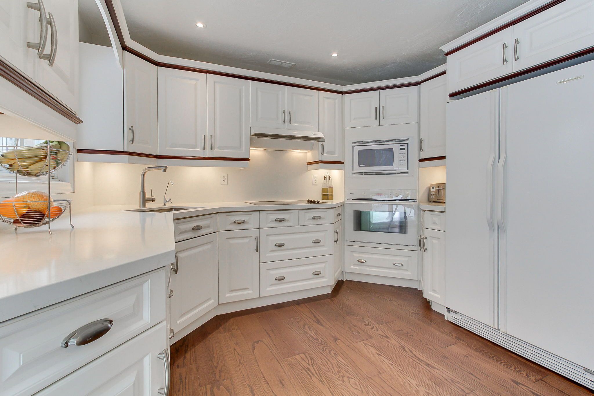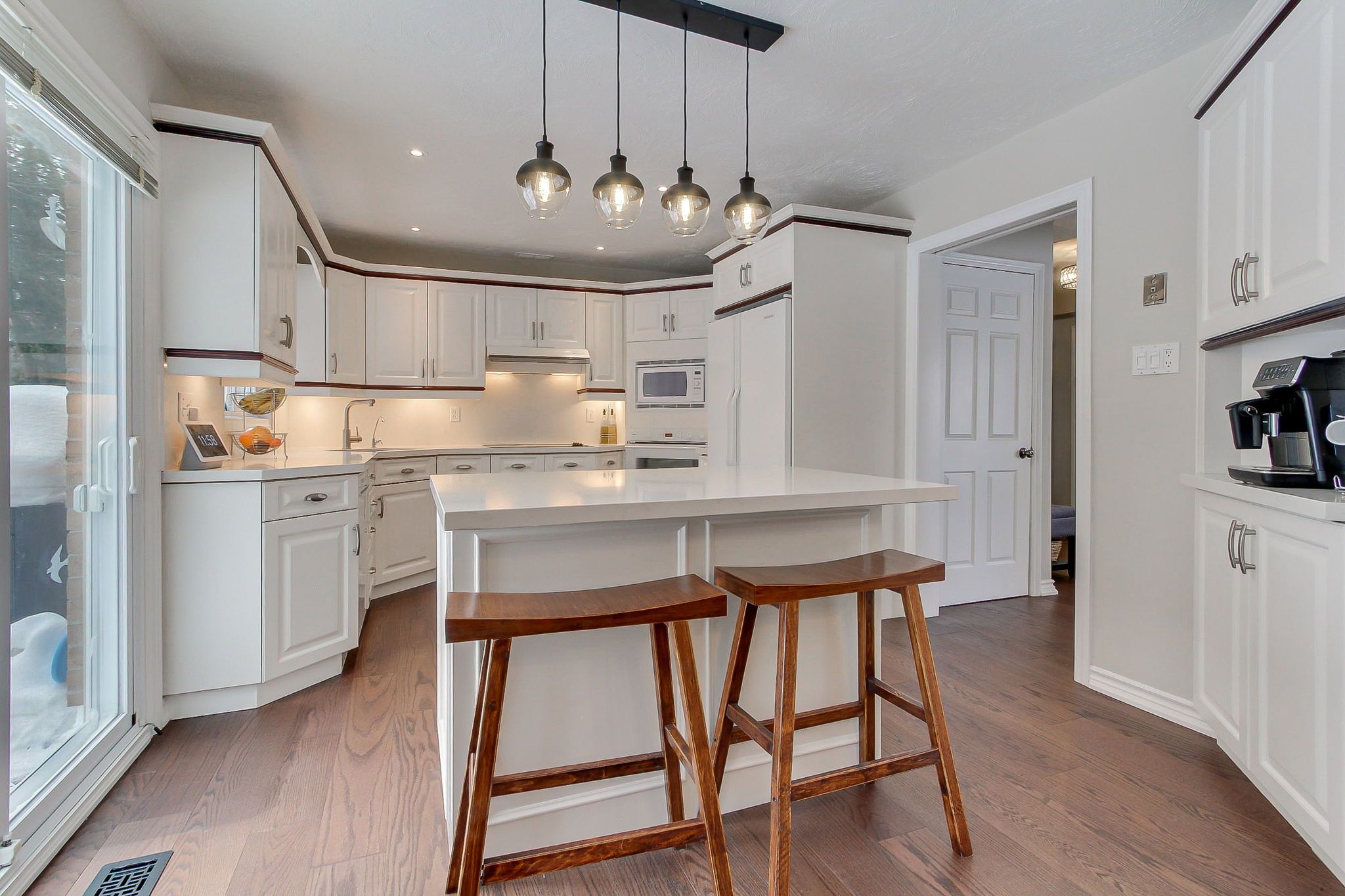 • Spacious kitchen with built-in appliances, quartz countertops, and an island.