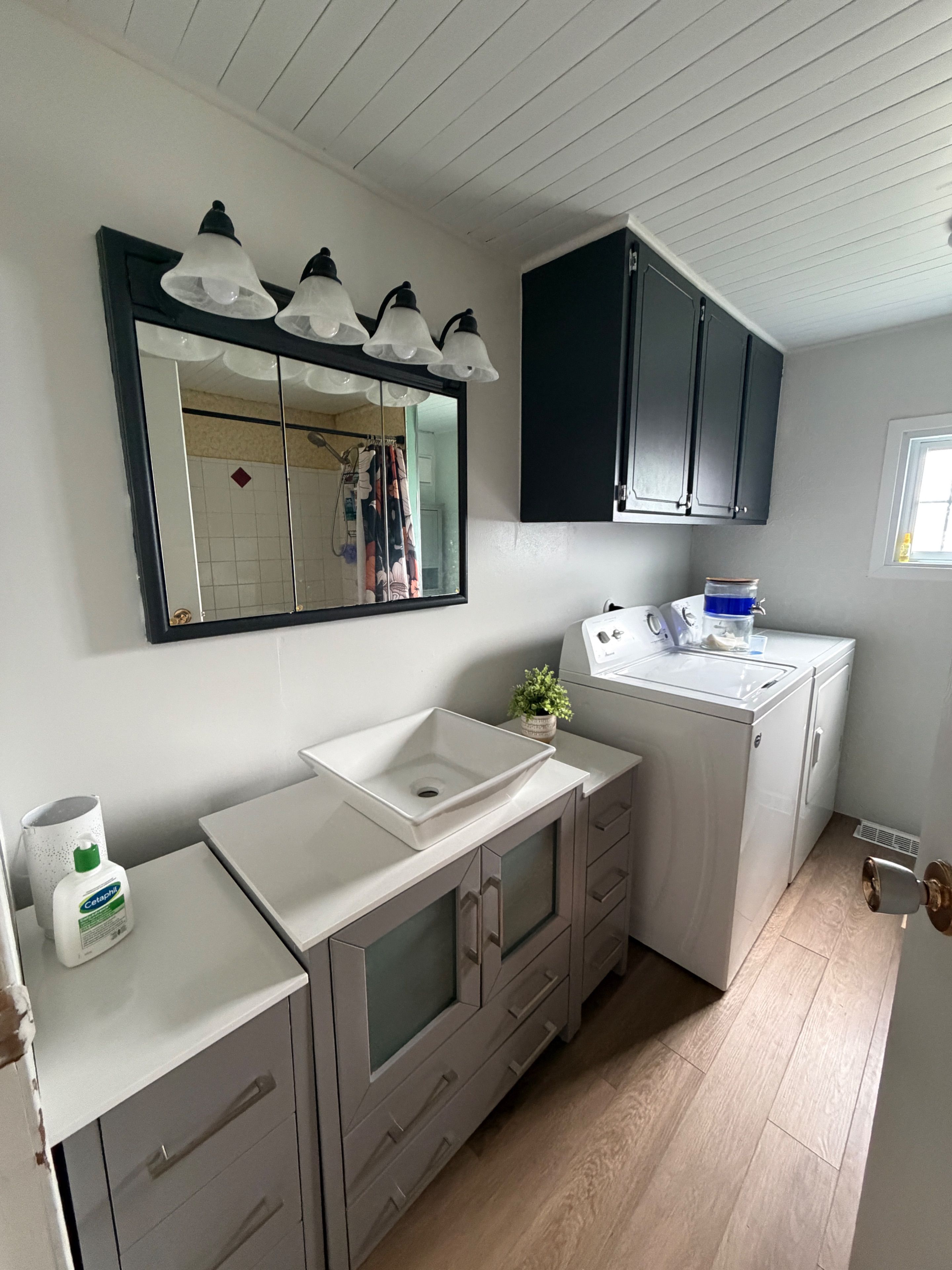 • Functional kitchen with plenty of cabinets and dining area.