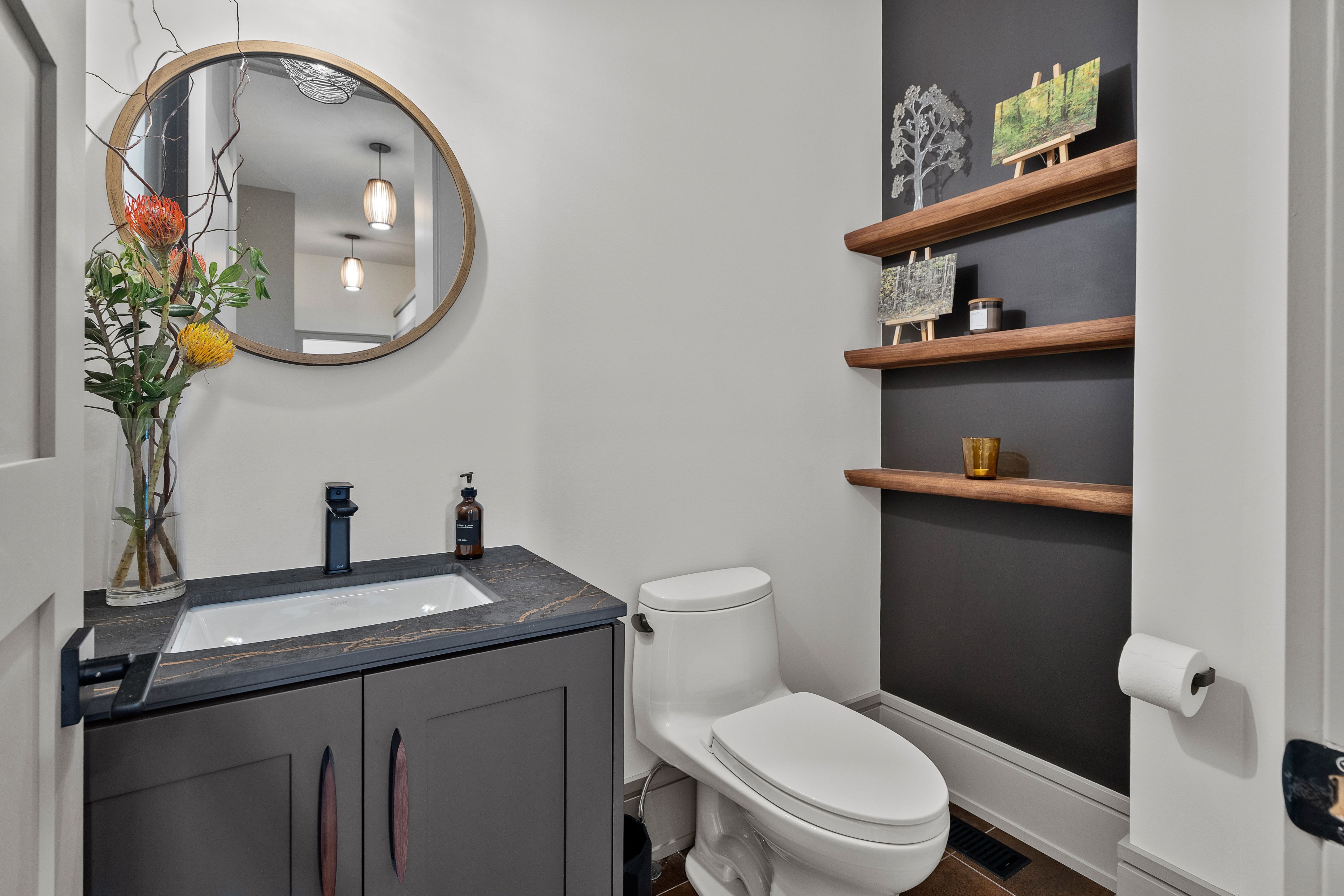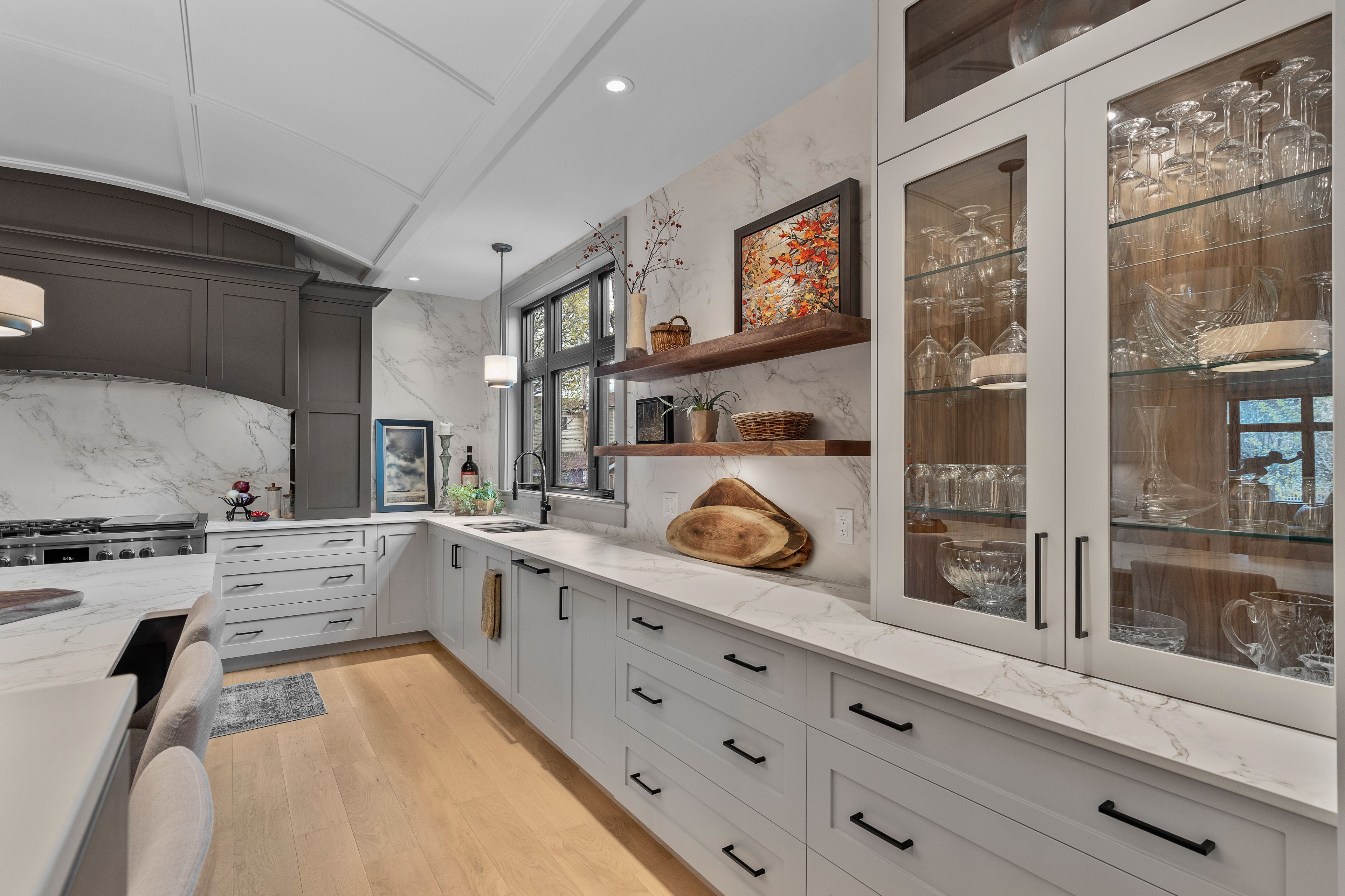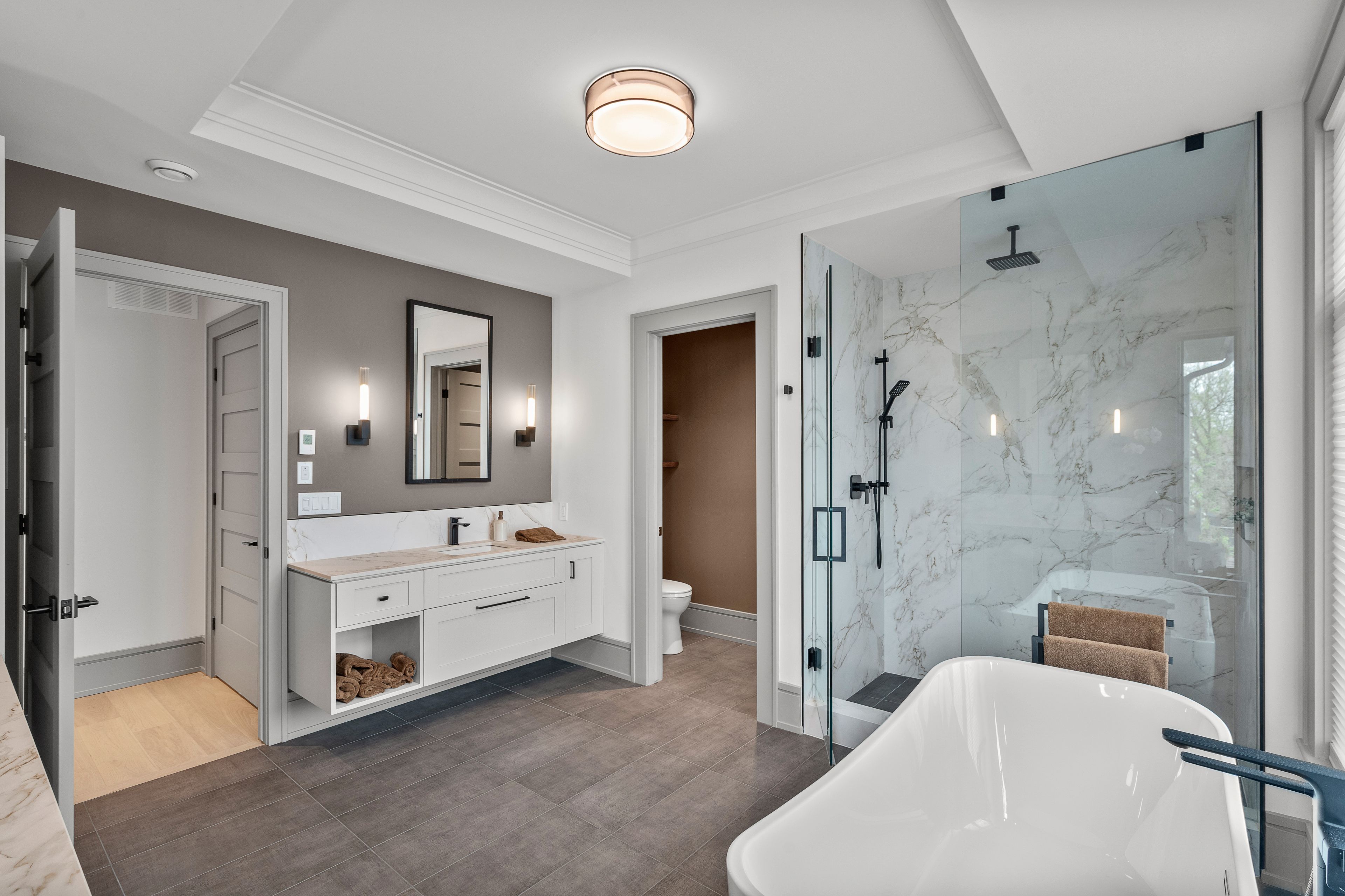 • Dramatic foyer with heated porcelain floors and custom walnut fixtures.