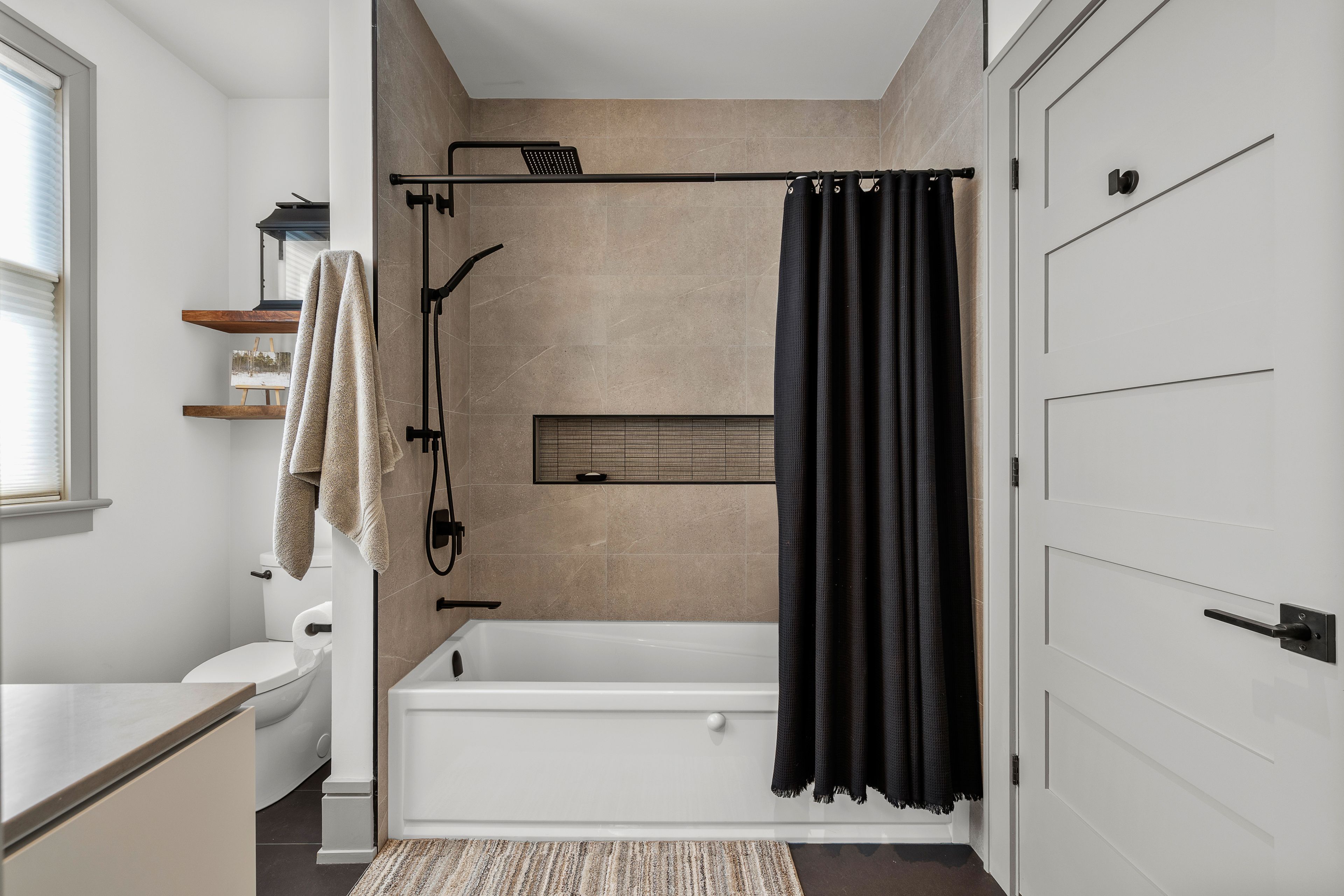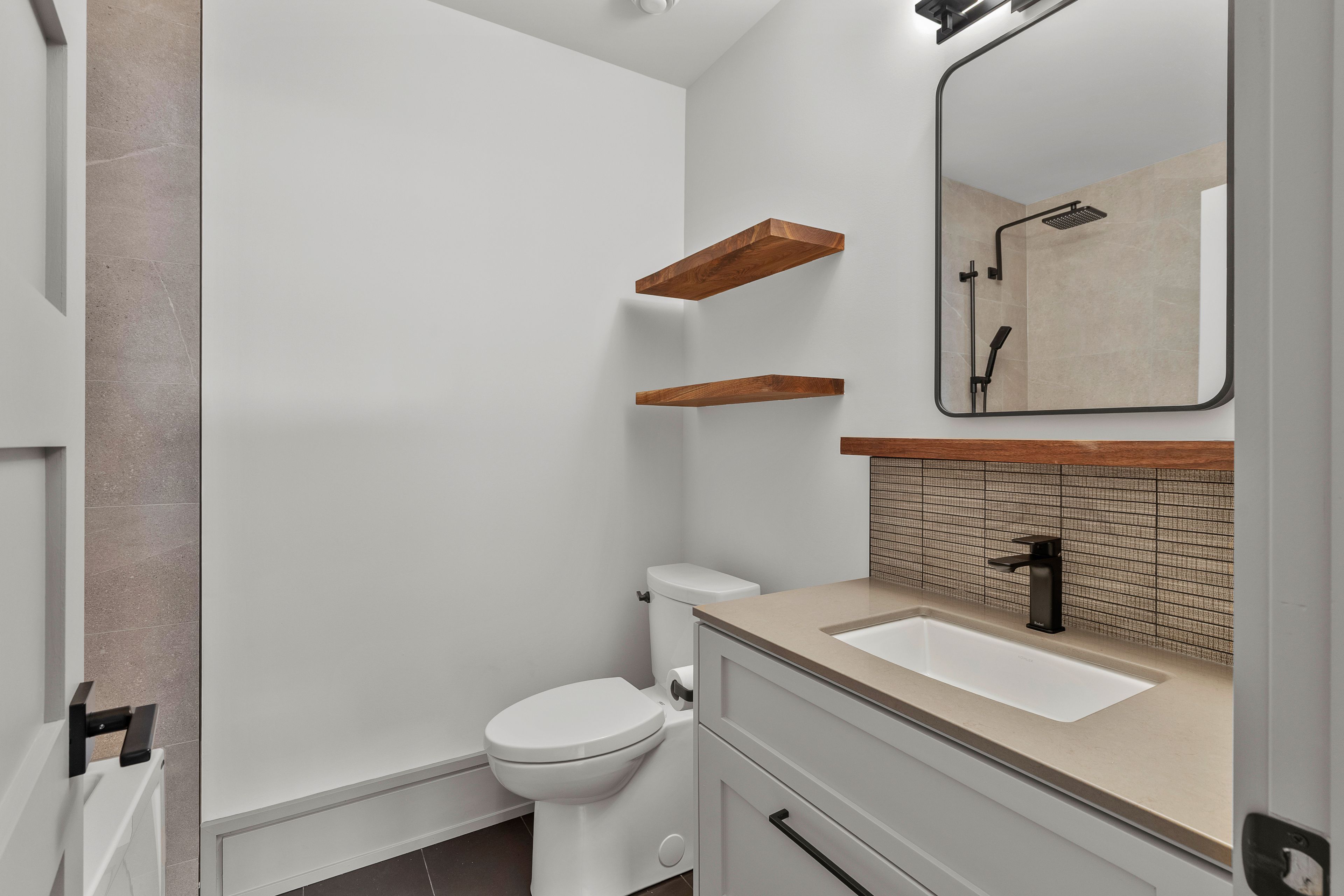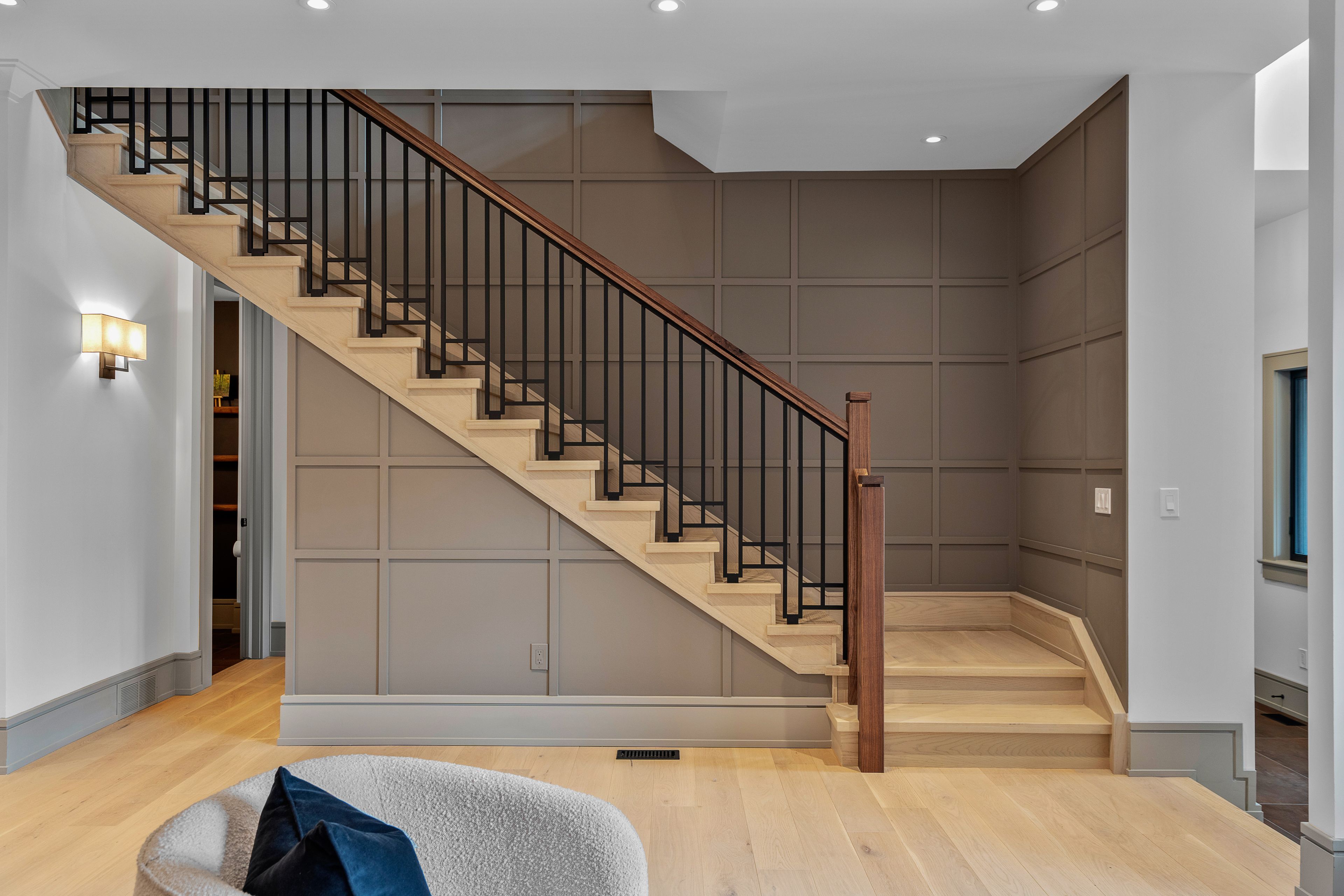 • Dramatic foyer with heated porcelain floors and custom walnut fixtures.