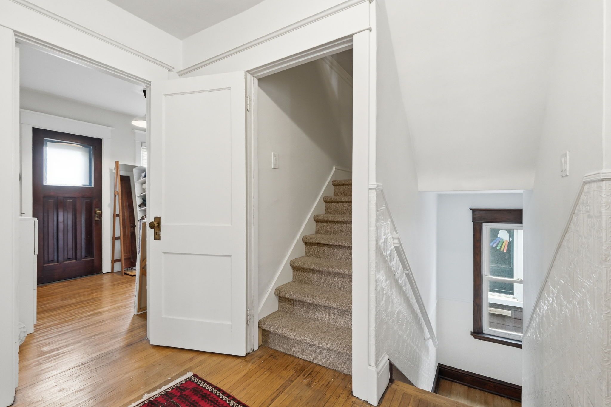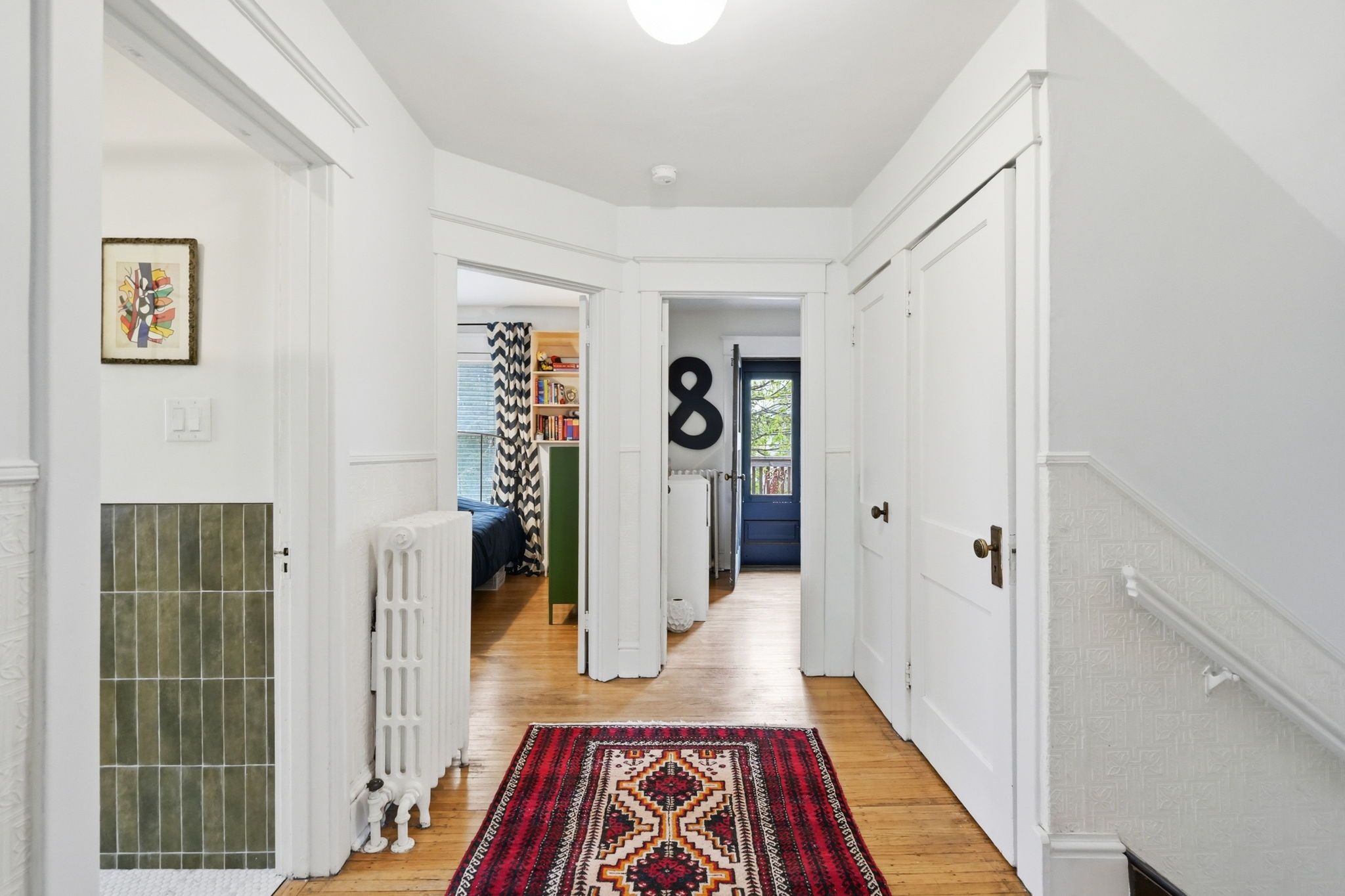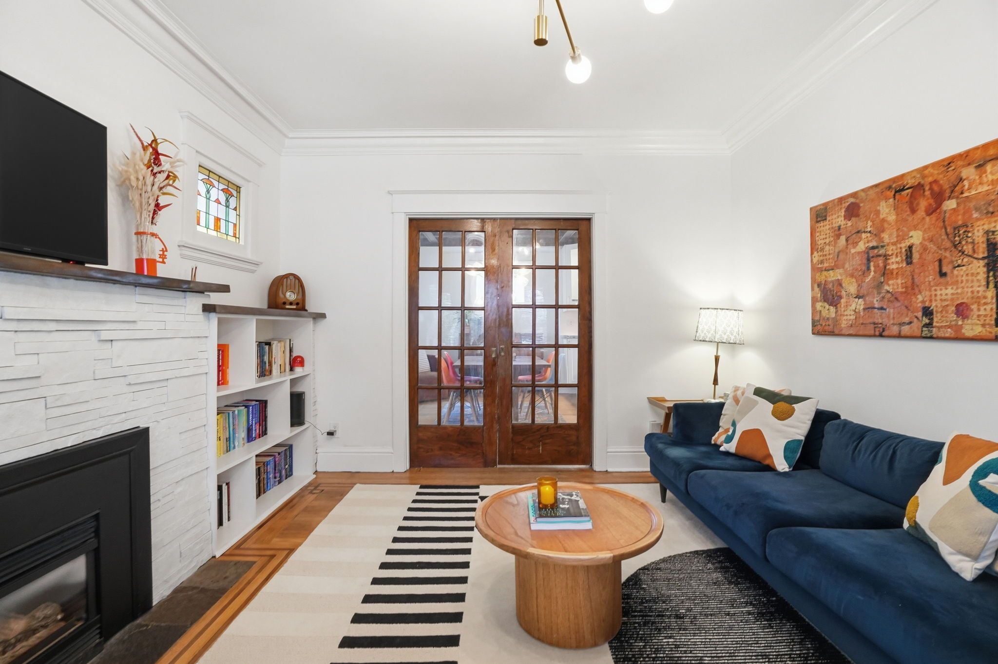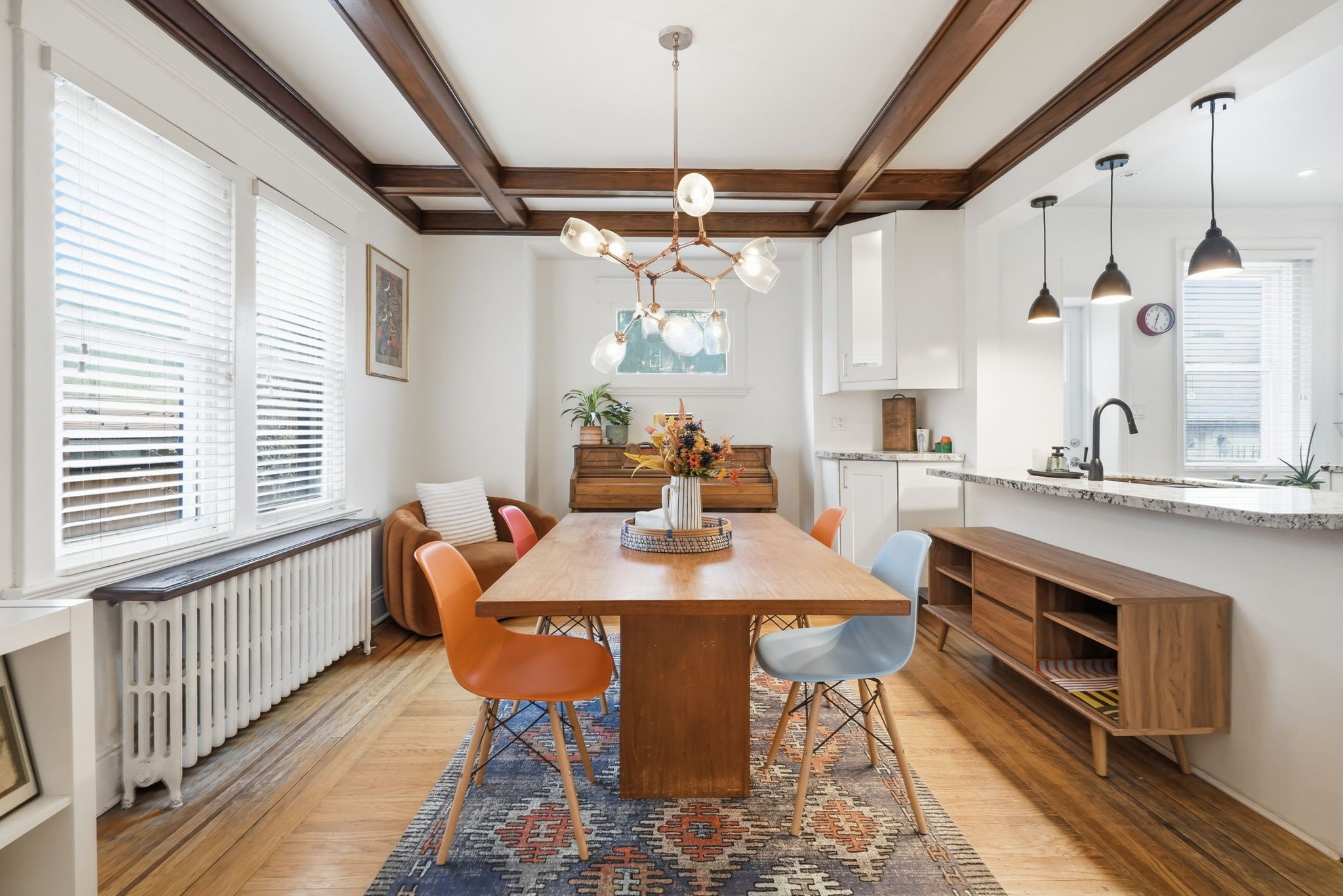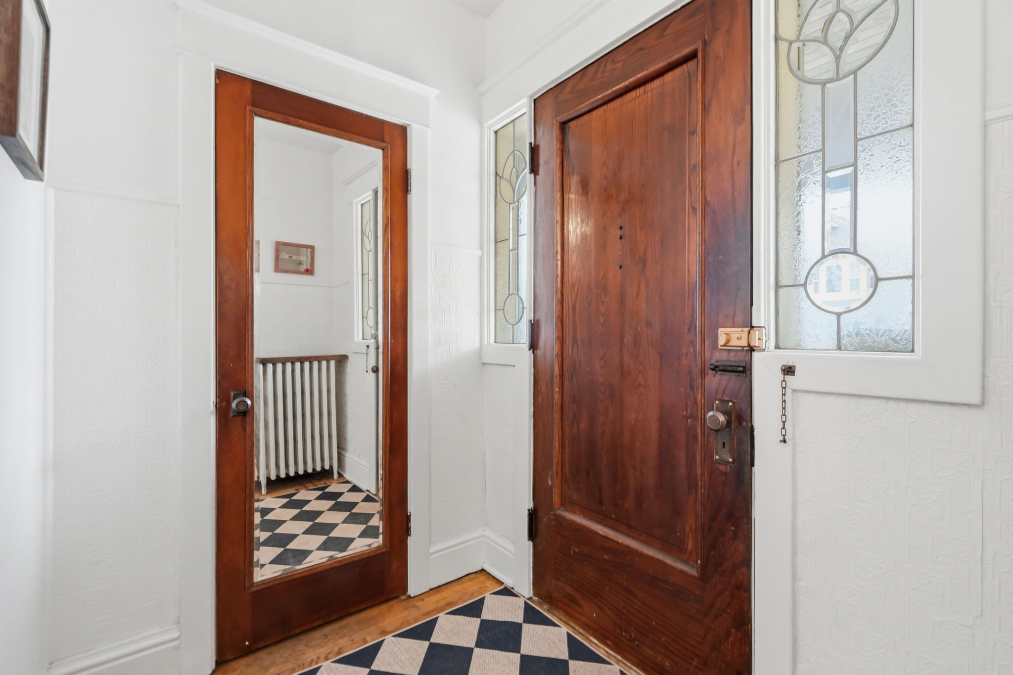 • Original character with coffered ceilings, stained glass, and antique hardware.