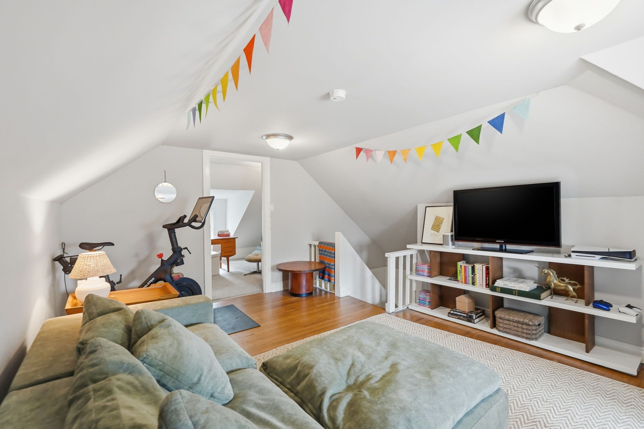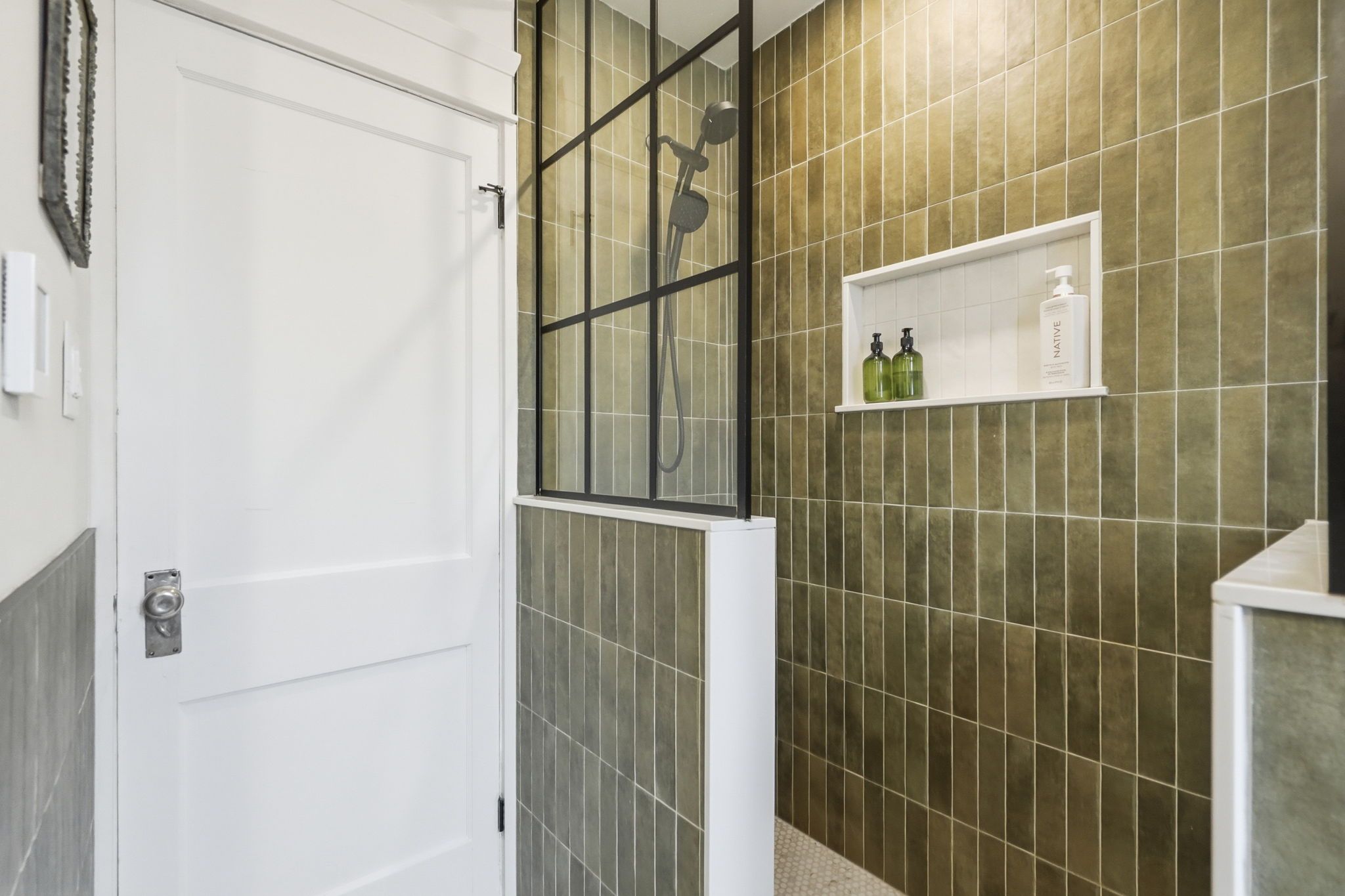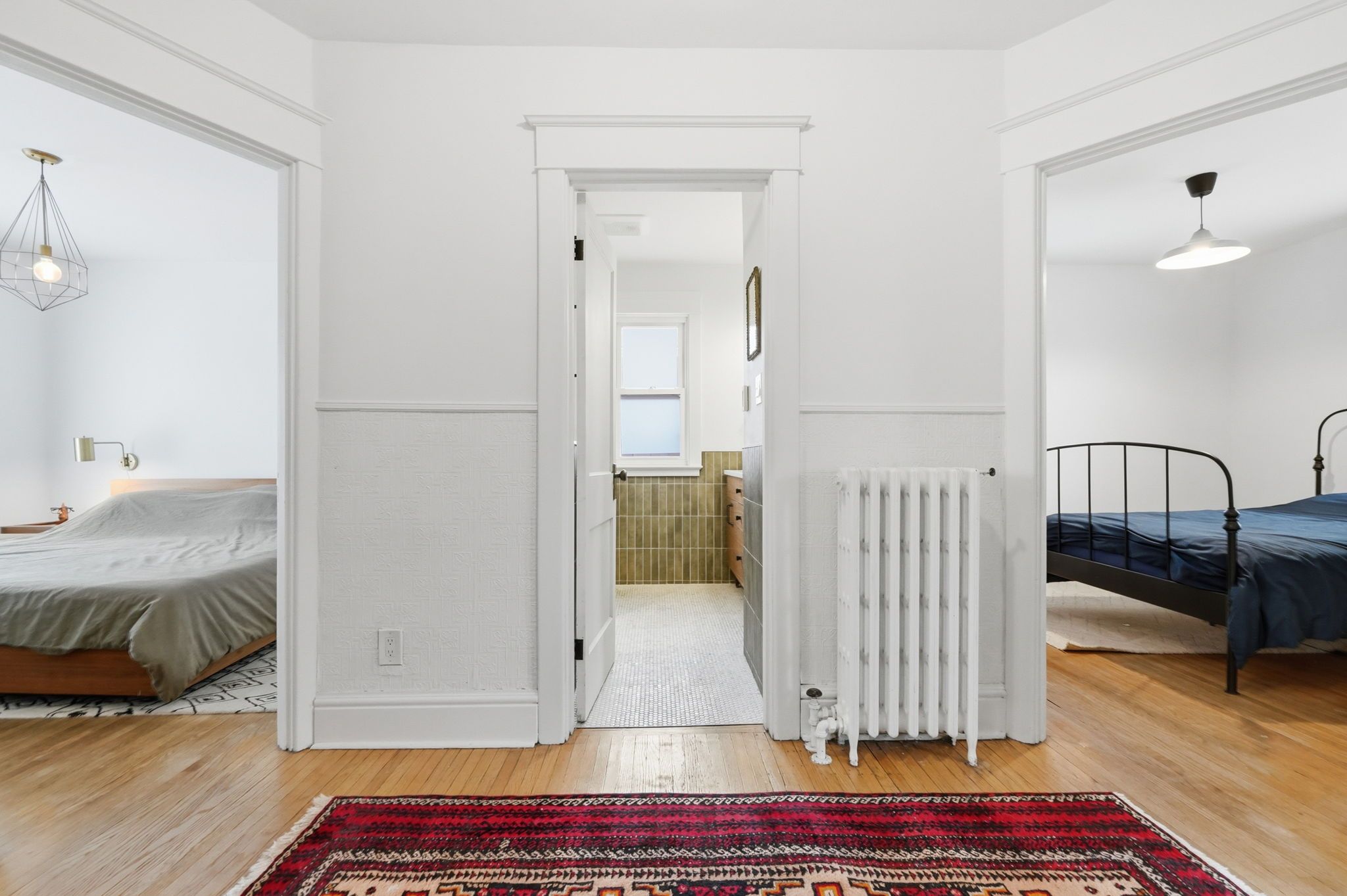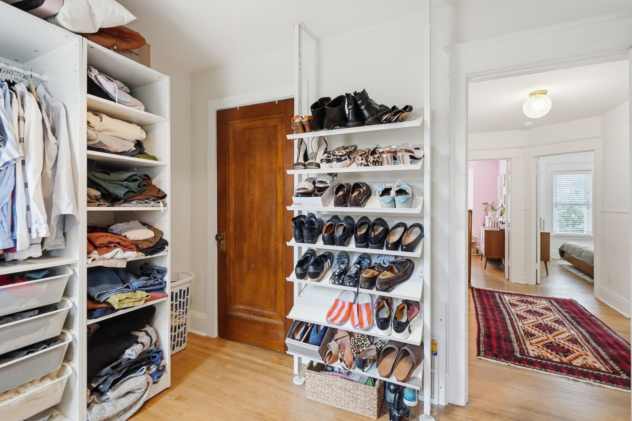 • Original character with coffered ceilings, stained glass, and antique hardware.