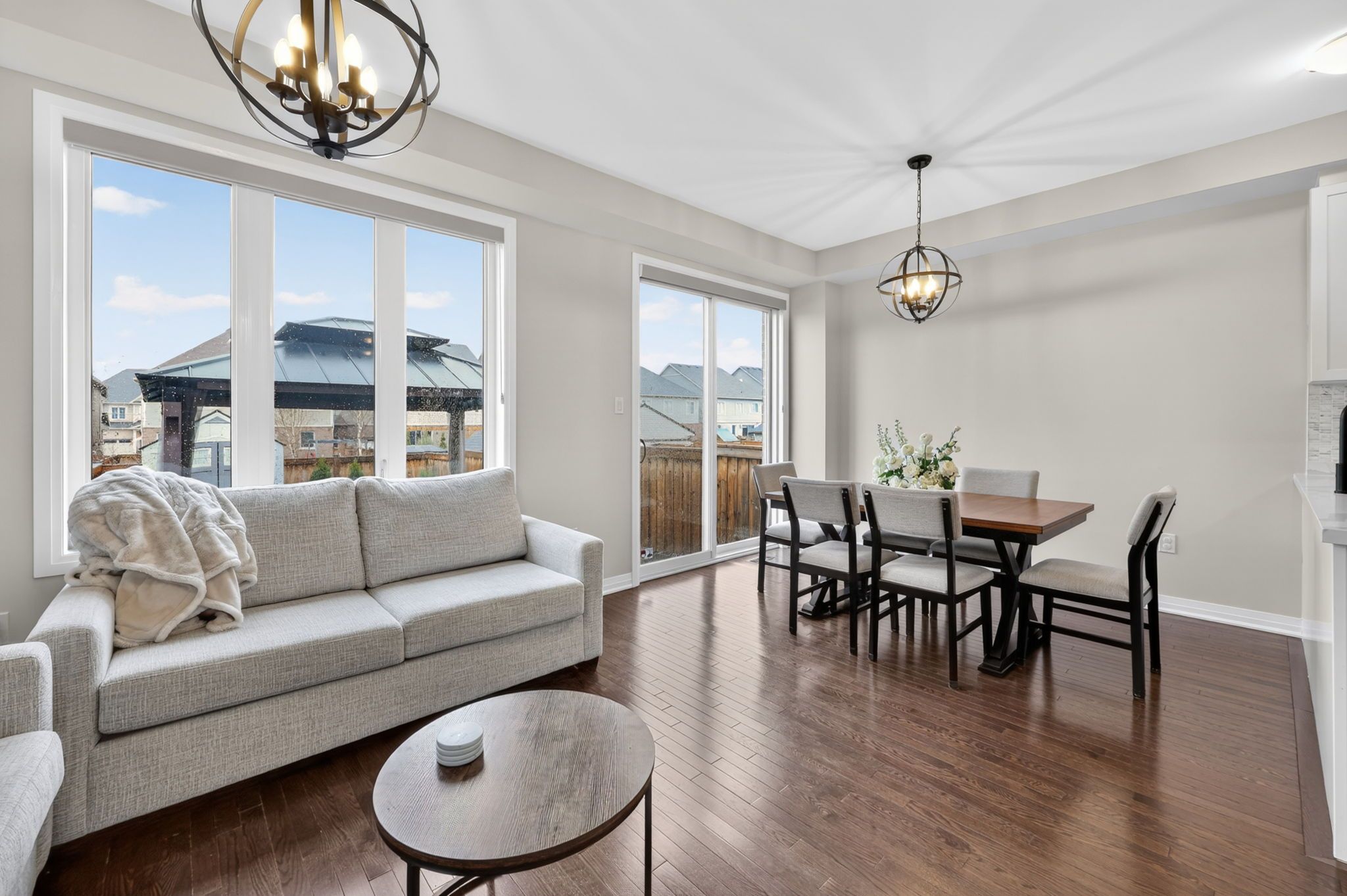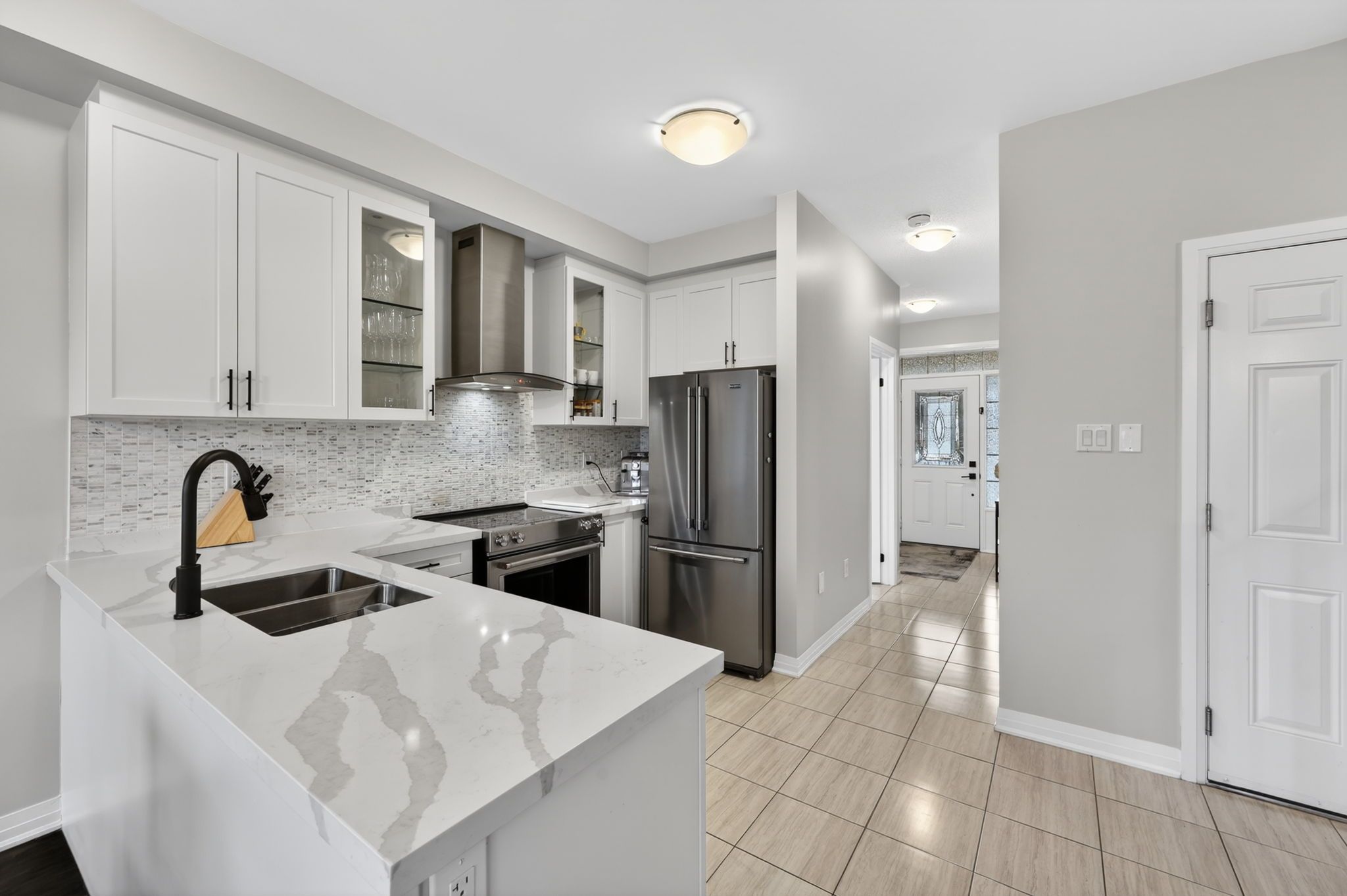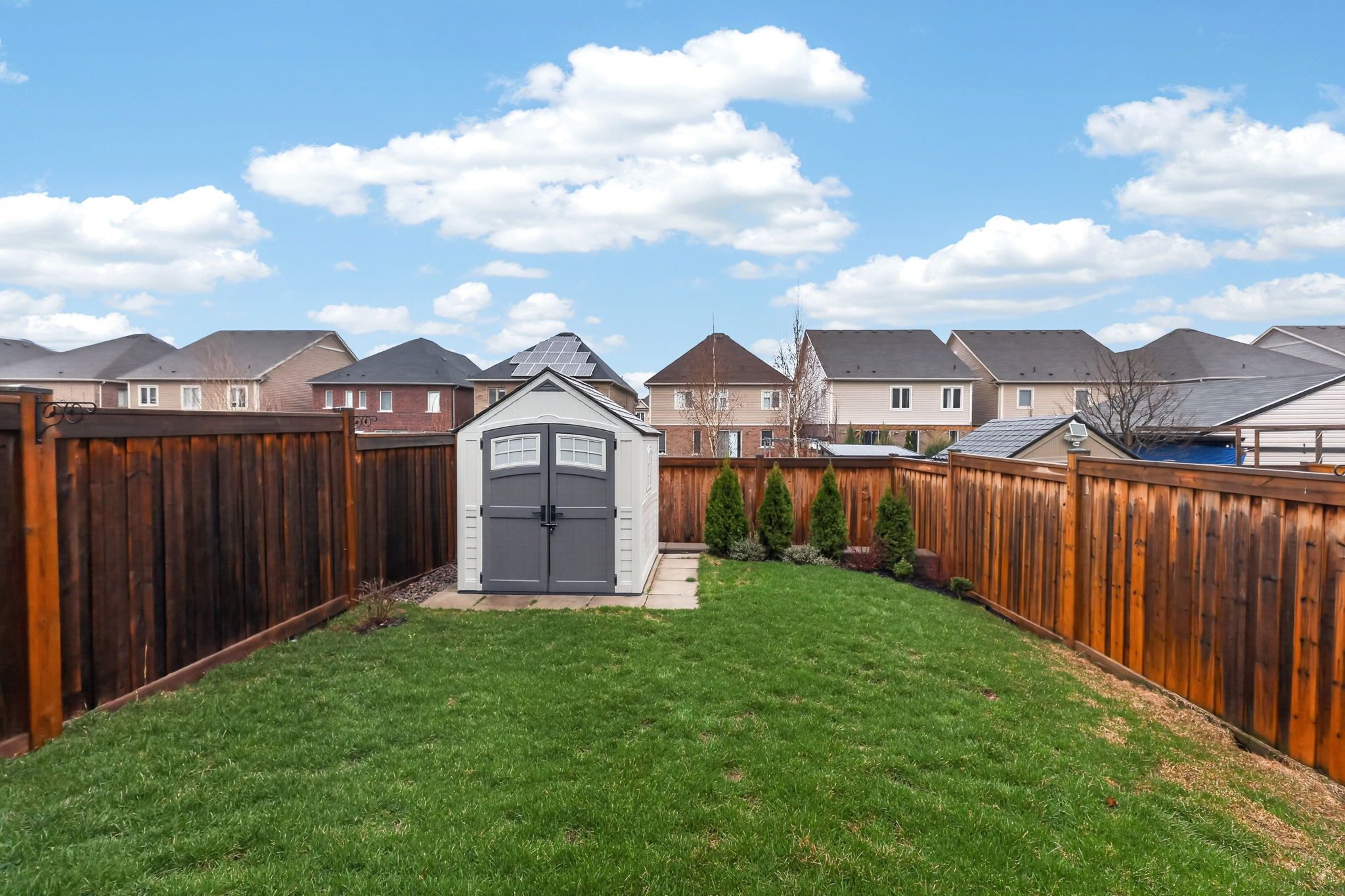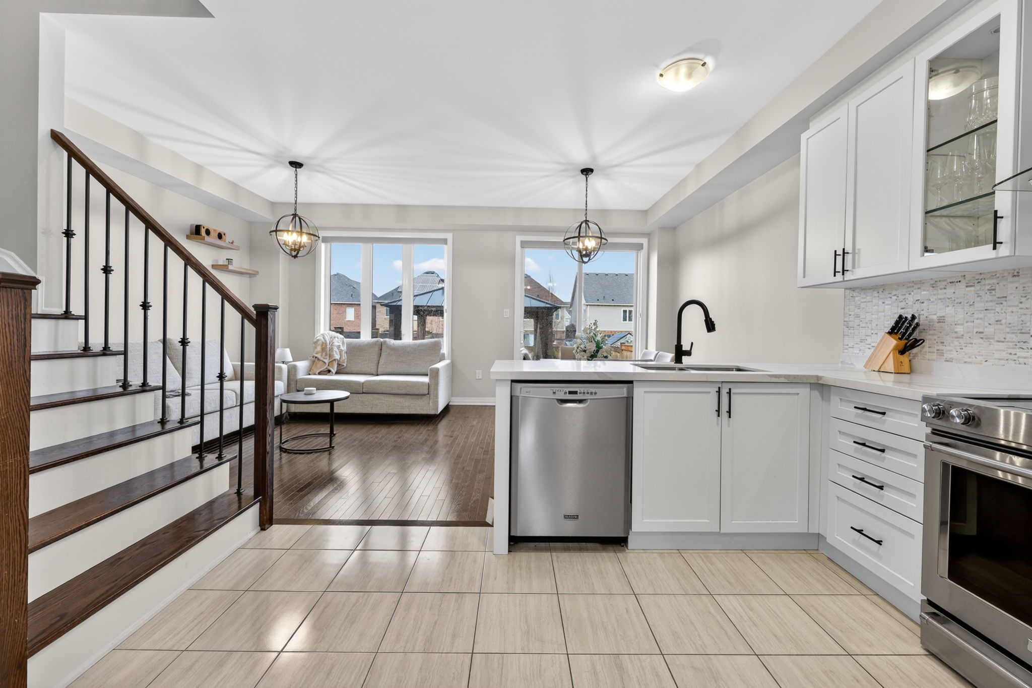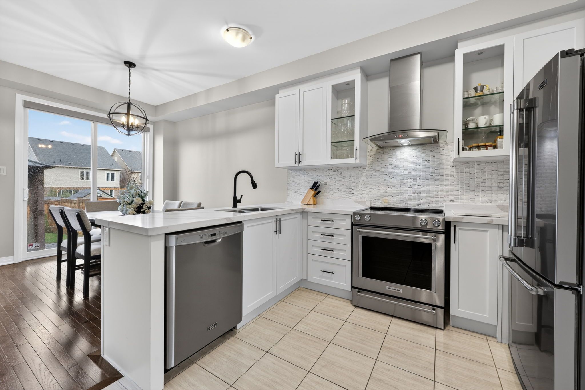Beautifully maintained semi-detached home, ideally situated in a sought-after, family-oriented neighbourhood in tottenham. From the moment you arrive, you'll appreciate the charming curb appeal, highlighted by elegant stone walkways leading to a generous covered front porch, perfect for morning coffee or evening relaxation. Step inside to a bright and welcoming foyer featuring a double mirrored closet, a convenient powder room, and soaring 9-foot ceilings that carry throughout the main level. The open-concept layout seamlessly connects the kitchen, dining, and living spaces, designing the area for both everyday living and entertaining. Stylish kitchen with upgraded quartz countertops, stainless steel appliances, and a tasteful mosaic backsplash. The adjoining living and dining areas offer a warm, inviting atmosphere with a walkout to the beautifully landscaped backyard, ideal for hosting or enjoying quiet outdoor moments. This carpet-free home showcases a refined combination of tile and hardwood flooring throughout, along with direct interior access to the spacious garage for added convenience. A striking solid oak staircase with wrought iron pickets leads to the upper level, where you'll find generously sized bedrooms featuring new hardwood floors, oversized closets, large sun-filled windows, and a well-appointed main bathroom. The fully finished basement extends your living space with an impressive recreation room, complete with wall-to-wall built-in cabinetry, laminate flooring, and pot lighting, perfect for movie nights, a playroom, or a home office setup. The laundry and utility room is thoughtfully designed with ample built-in storage. Freshly painted throughout, this home is truly move-in ready. The backyard is a private retreat, featuring a large stone patio, hard-top gazebo, level lawn, storage shed, full privacy fencing, and beautifully curated landscaping, offering the perfect blend of function and outdoor enjoyment.