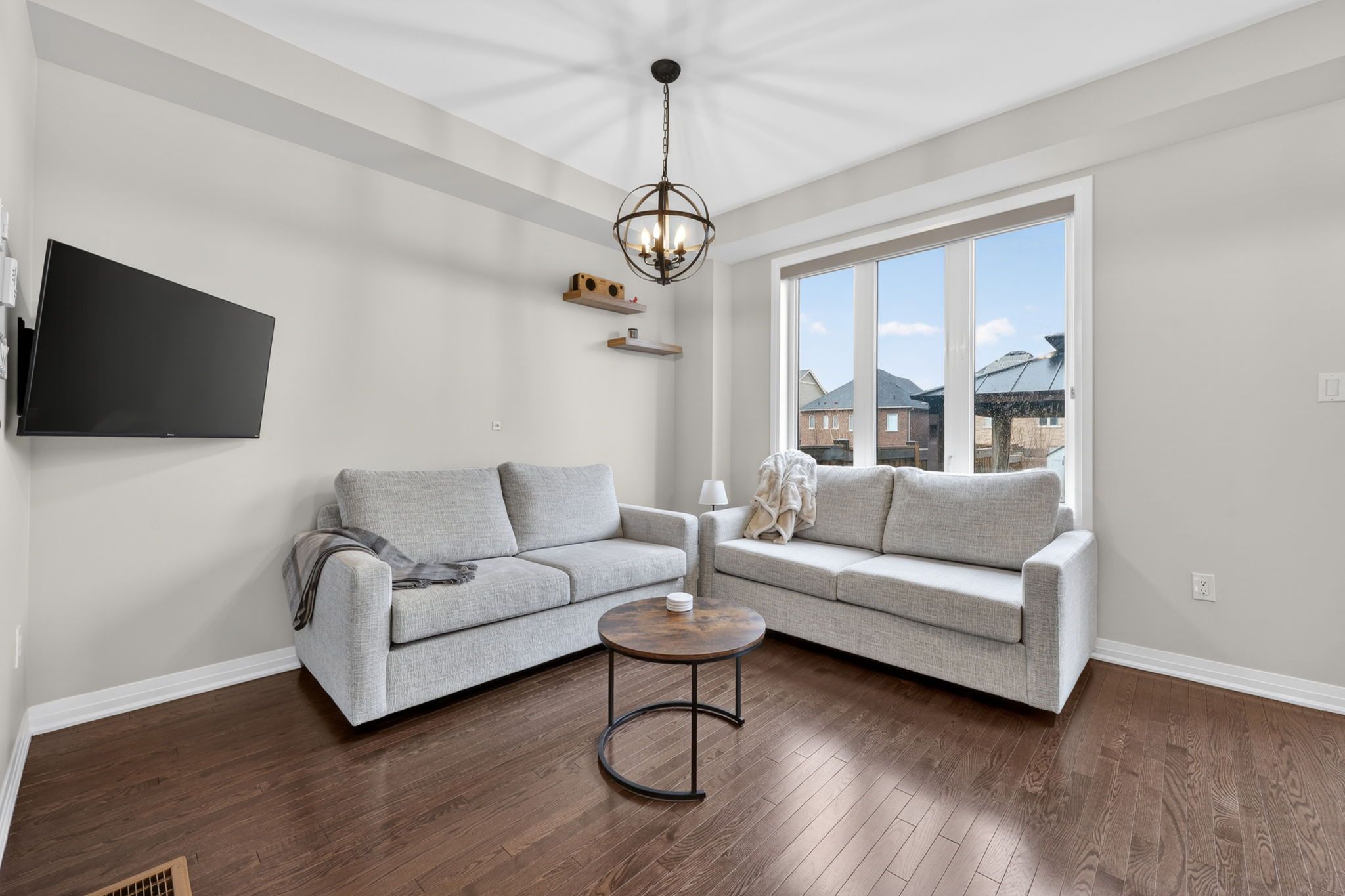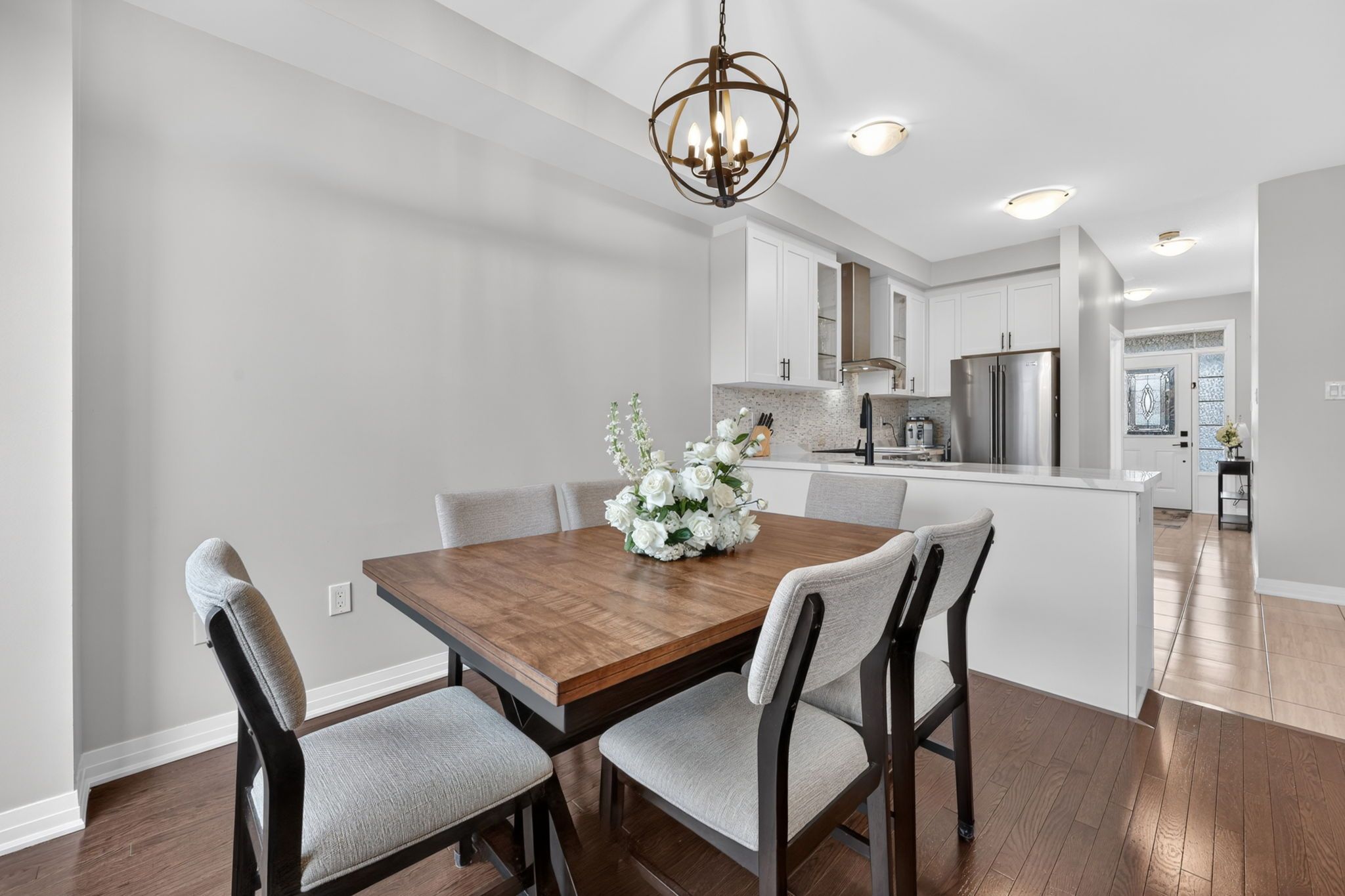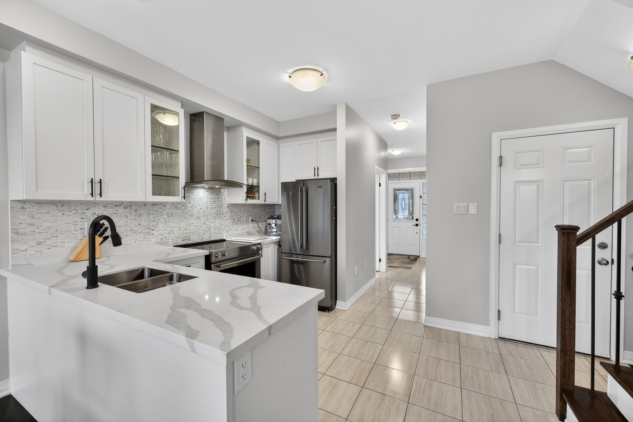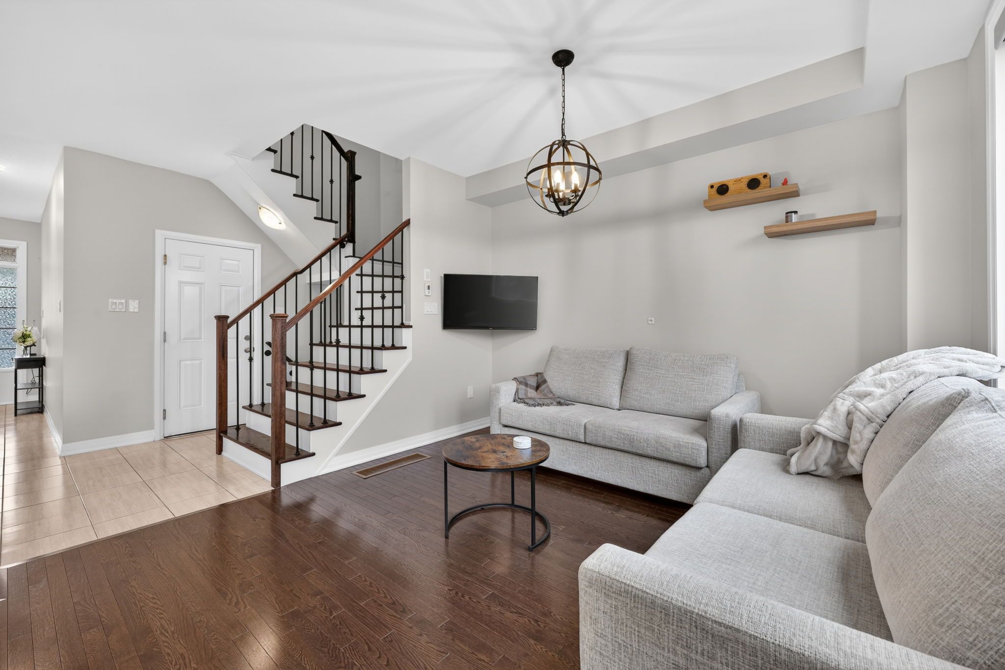 Beautifully maintained semi-detached home, ideally situated in a sought-after, family-oriented neighbourhood in tottenham. From the moment you arrive, you'll appreciate the charming curb appeal, highlighted by elegant stone walkways leading to a generous covered front porch, perfect for morning coffee or evening relaxation. Step inside to a bright and welcoming foyer featuring a double mirrored closet, a convenient powder room, and soaring 9-foot ceilings that carry throughout the main level. The open-concept layout seamlessly connects the kitchen, dining, and living spaces, designing the area for both everyday living and entertaining. Stylish kitchen with upgraded quartz countertops, stainless steel appliances, and a tasteful mosaic backsplash. The adjoining living and dining areas offer a warm, inviting atmosphere with a walkout to the beautifully landscaped backyard, ideal for hosting or enjoying quiet outdoor moments. This carpet-free home showcases a refined combination of tile and hardwood flooring throughout, along with direct interior access to the spacious garage for added convenience. A striking solid oak staircase with wrought iron pickets leads to the upper level, where you'll find generously sized bedrooms featuring new hardwood floors, oversized closets, large sun-filled windows, and a well-appointed main bathroom. The fully finished basement extends your living space with an impressive recreation room, complete with wall-to-wall built-in cabinetry, laminate flooring, and pot lighting, perfect for movie nights, a playroom, or a home office setup. The laundry and utility room is thoughtfully designed with ample built-in storage. Freshly painted throughout, this home is truly move-in ready. The backyard is a private retreat, featuring a large stone patio, hard-top gazebo, level lawn, storage shed, full privacy fencing, and beautifully curated landscaping, offering the perfect blend of function and outdoor enjoyment.