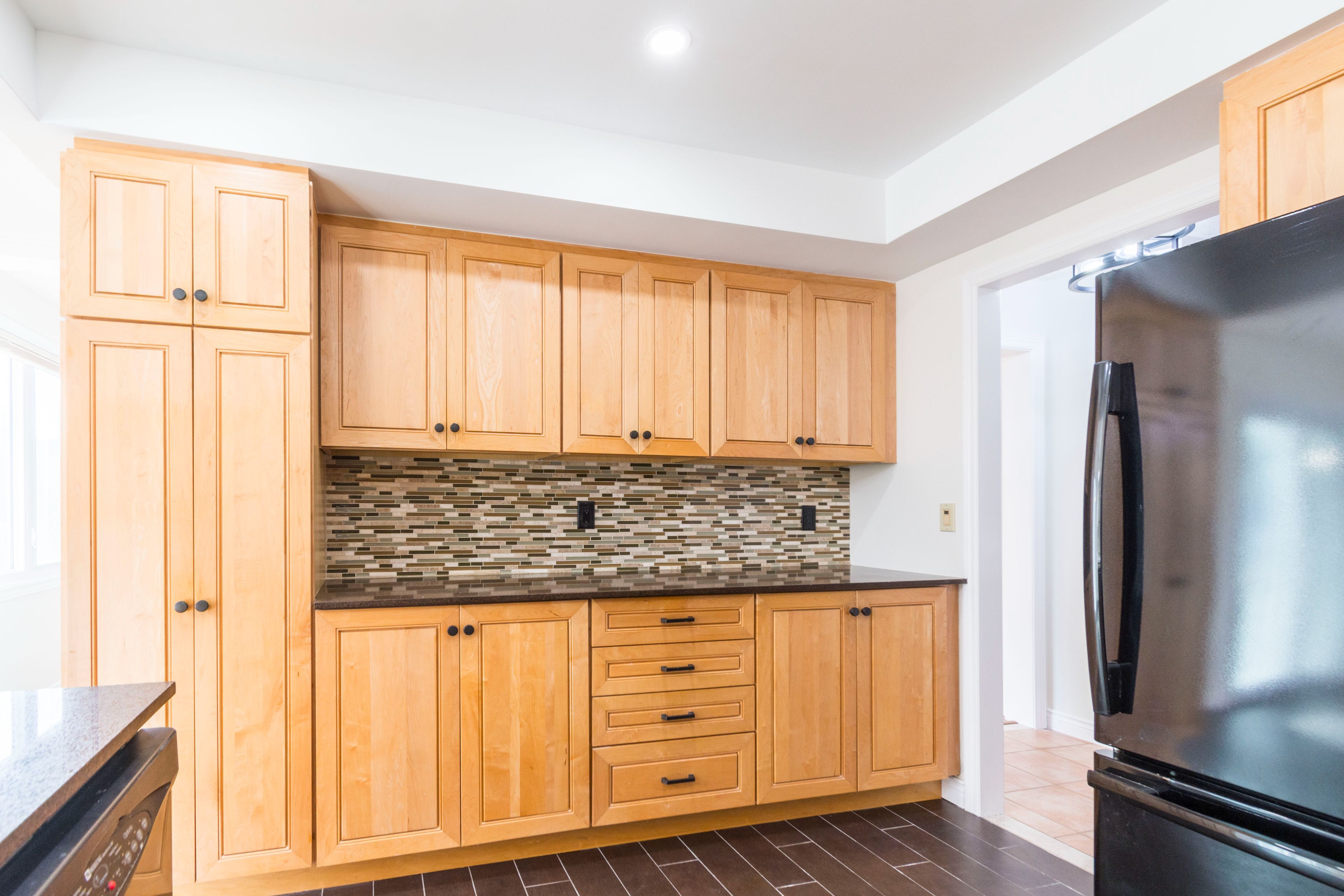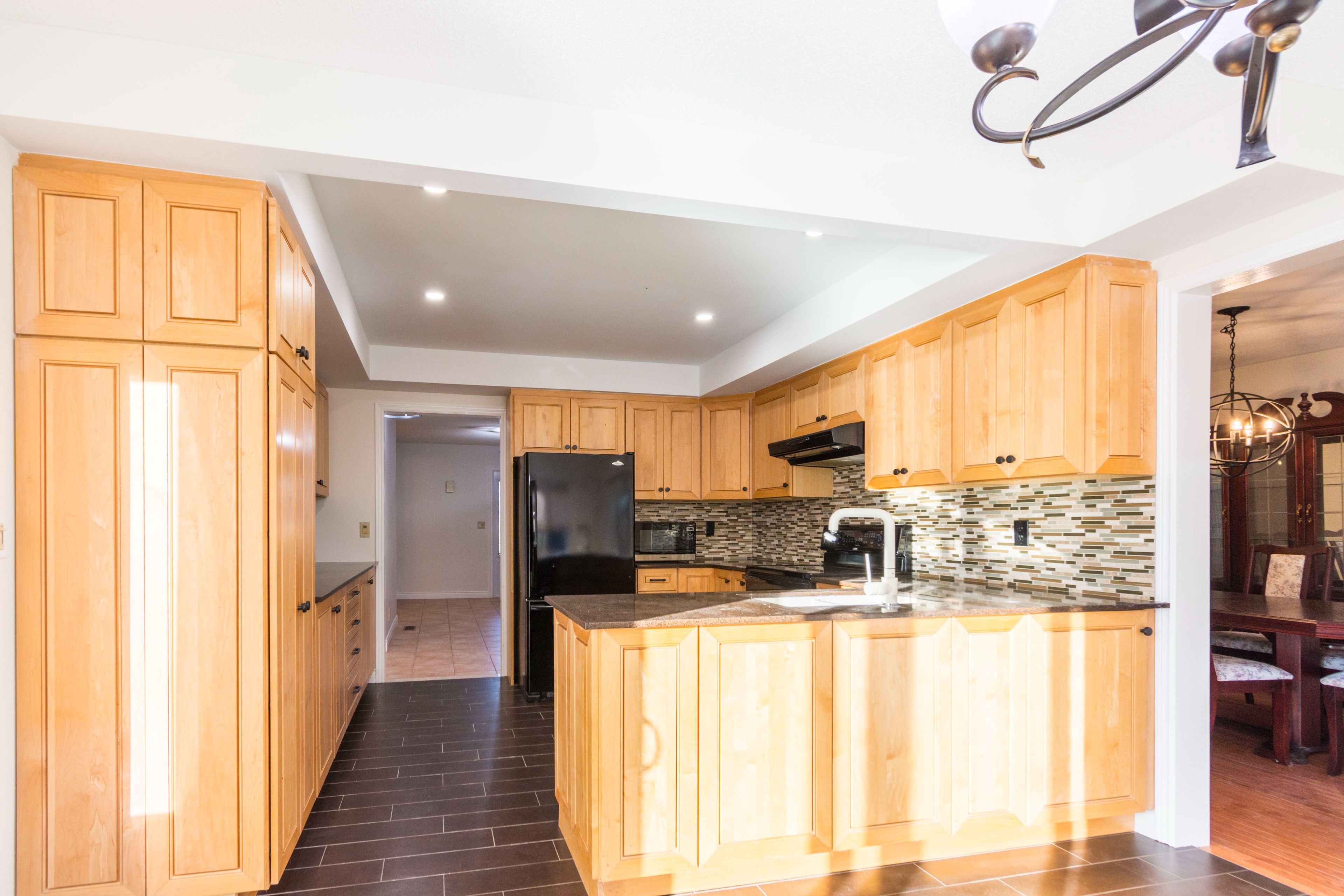• Modern eat-in kitchen with quartz countertops and Thomasville cabinets.