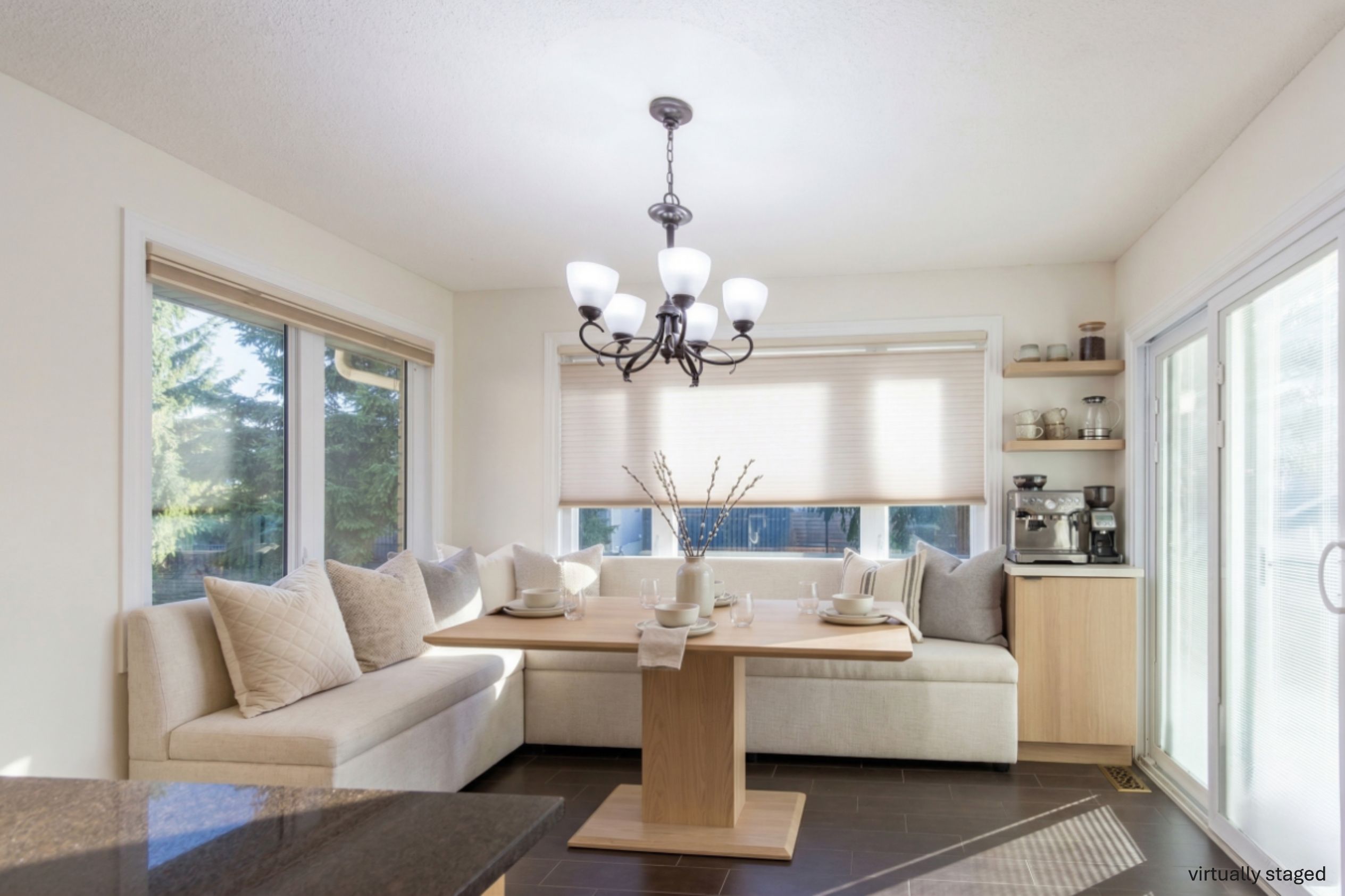 • Sunny eat-in kitchen with quartz countertops and updated cabinets.